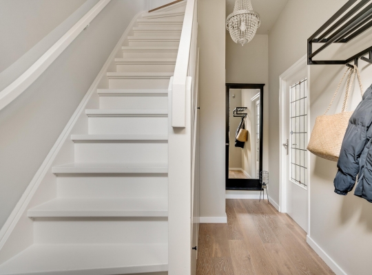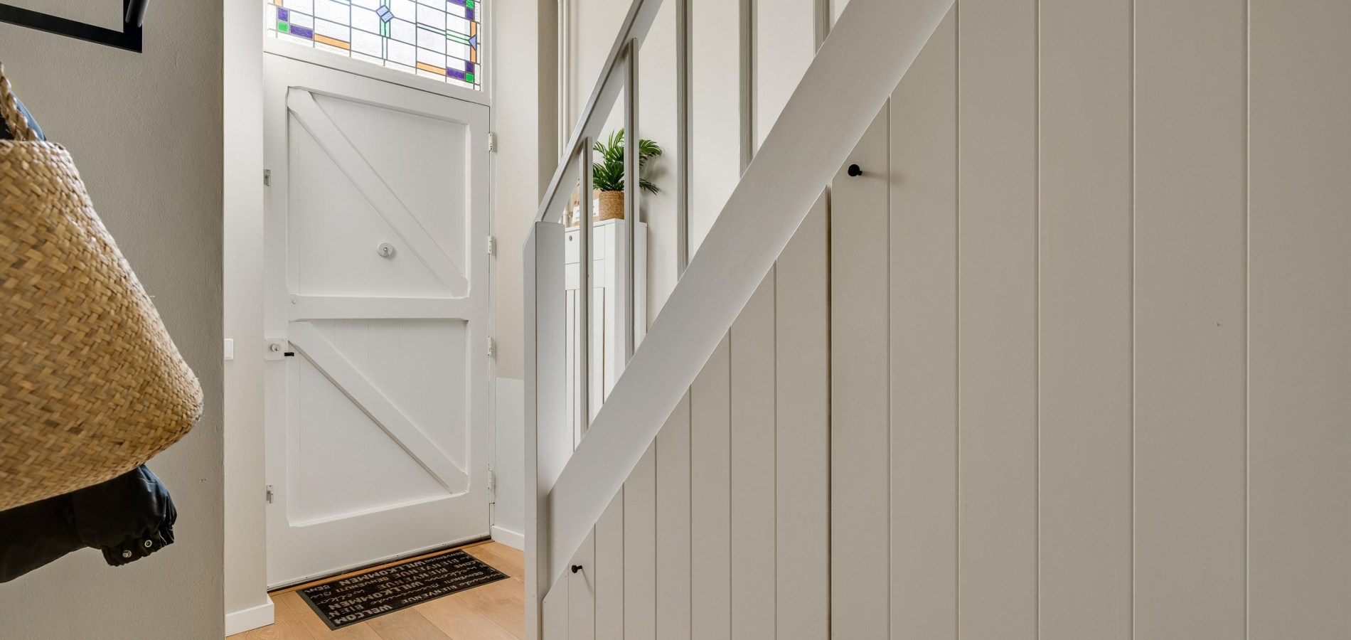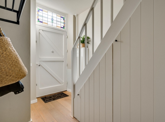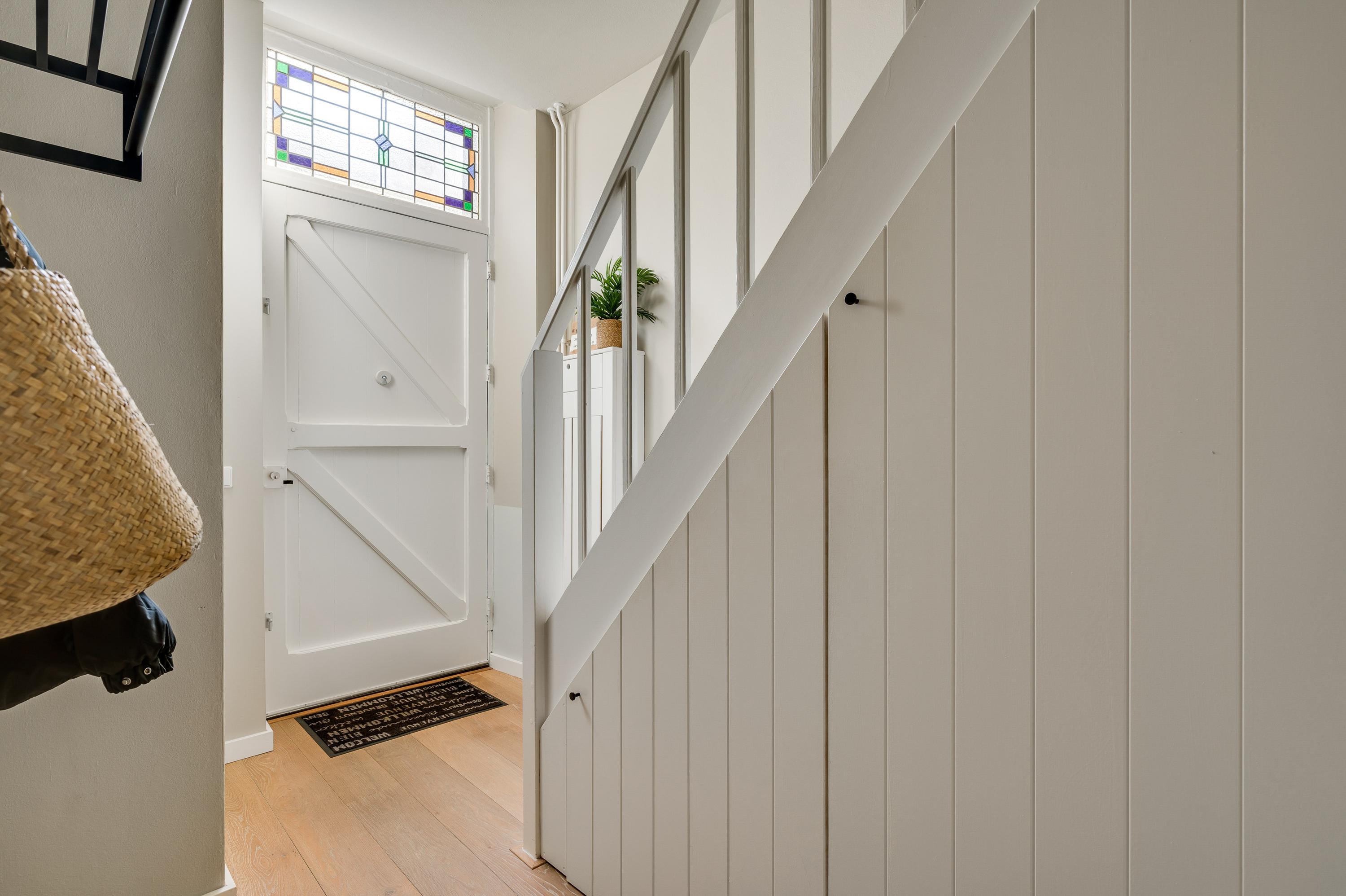 Aan de voorzijde is de fraaie entree, met een opvallende voordeur en een kleurrijk glas-in lood bovenraam. In de royale hal ziet u de trapopgang met bergkast, de meterkast en de toiletruimte met wandcloset. Het plafond in de hal heeft, net als de rest van de begane grond, een hoogte van circa 2,90 meter.