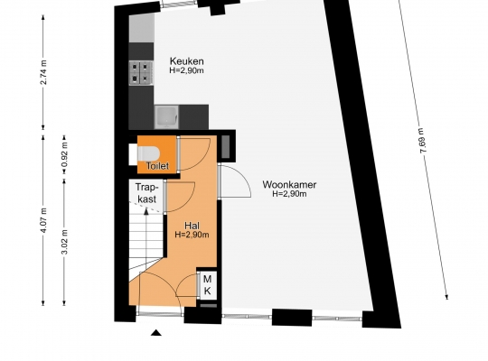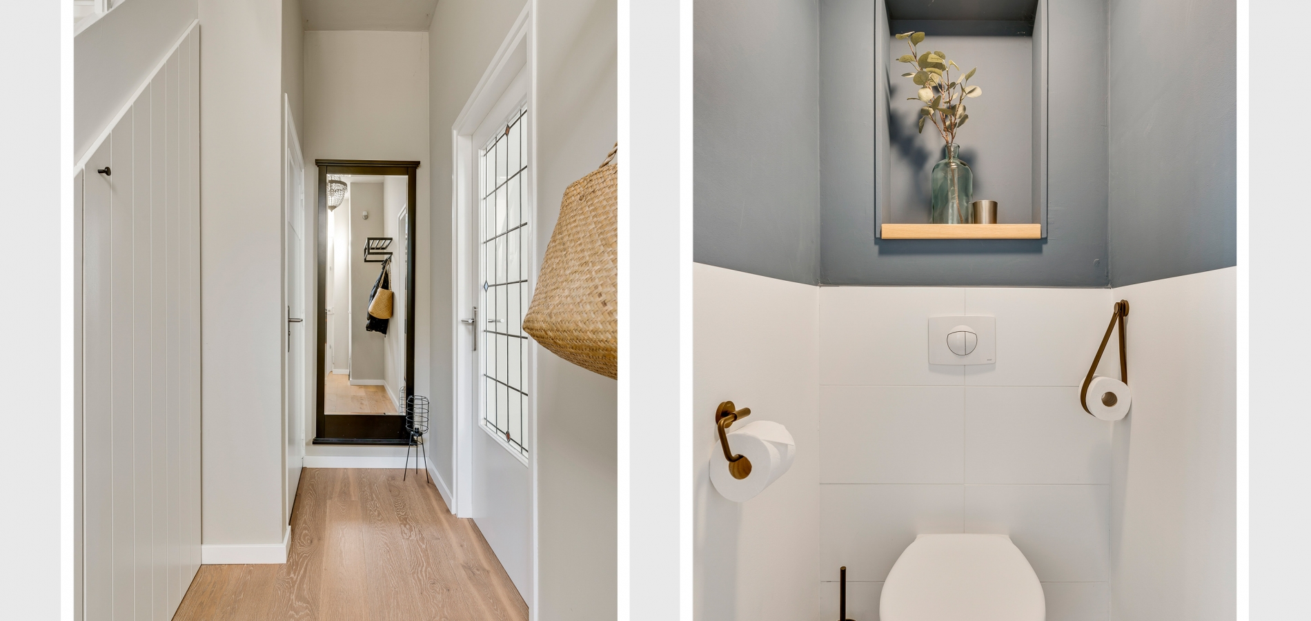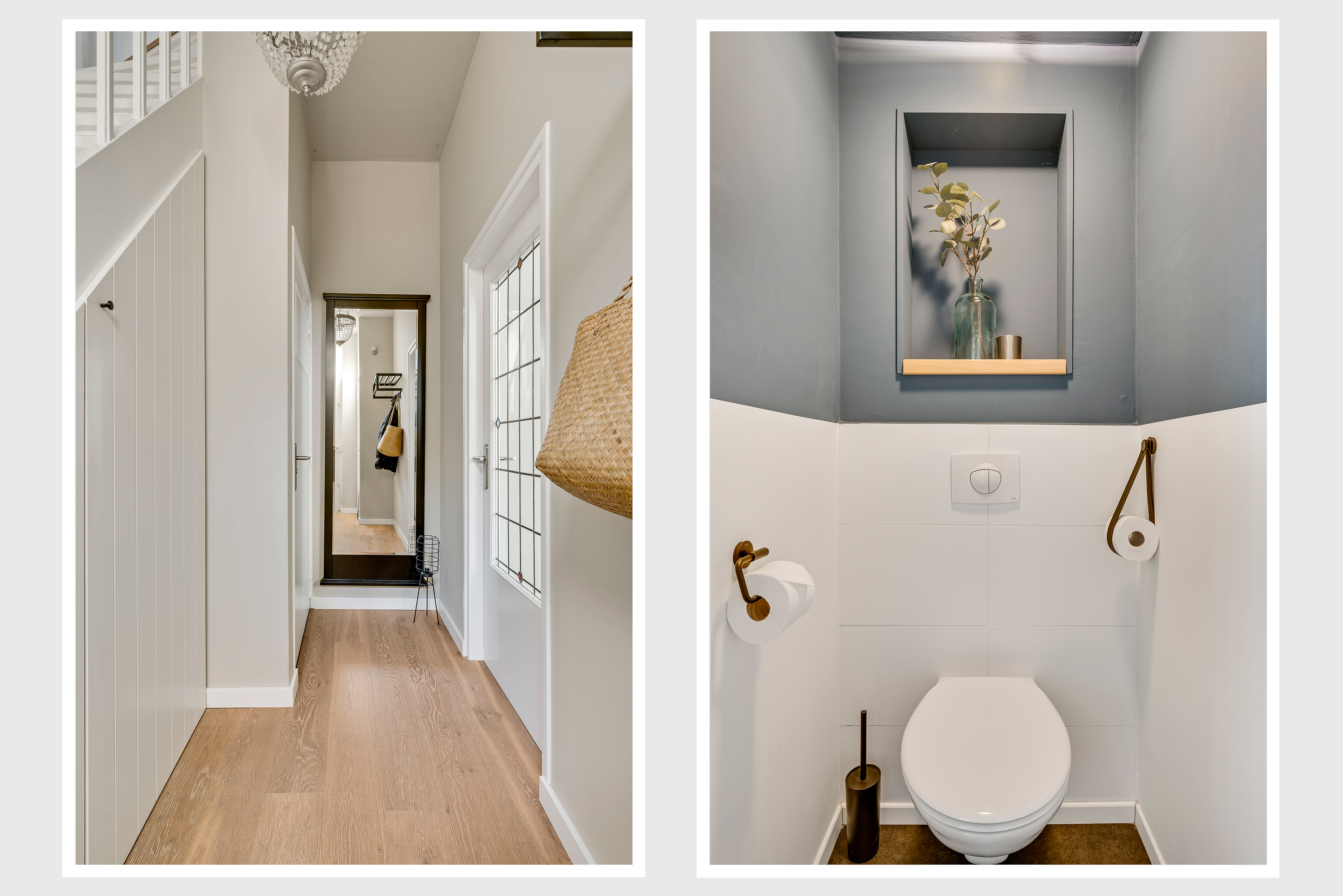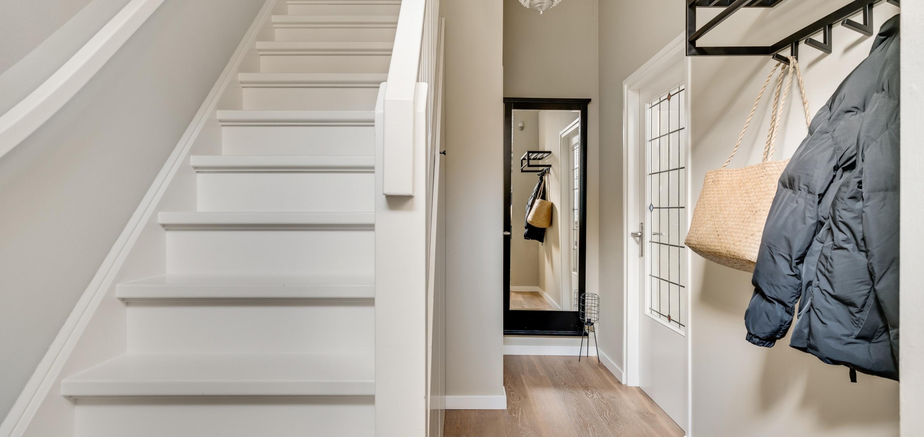 Aan de voorzijde is de fraaie entree, met een opvallende voordeur en een kleurrijk glas-in lood bovenraam. In de royale hal ziet u de trapopgang met bergkast, de meterkast en de toiletruimte met wandcloset. Het plafond in de hal heeft, net als de rest van de begane grond, een hoogte van circa 2,90 meter.