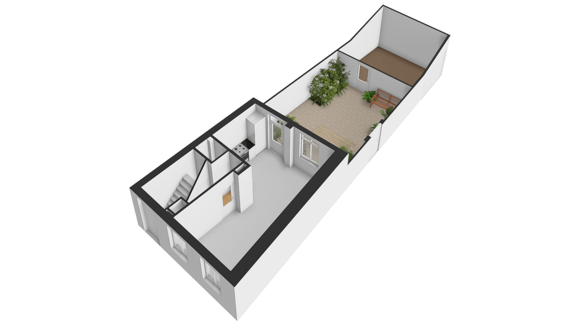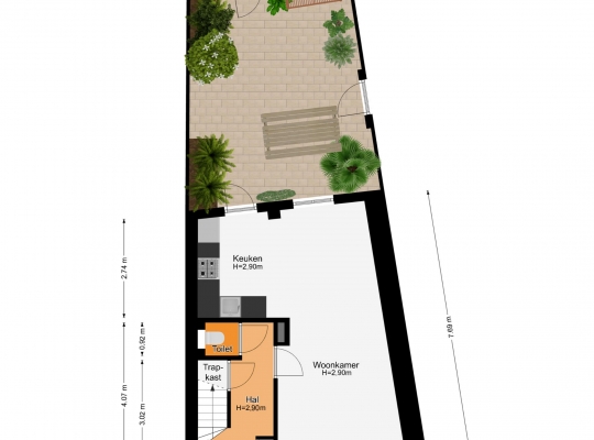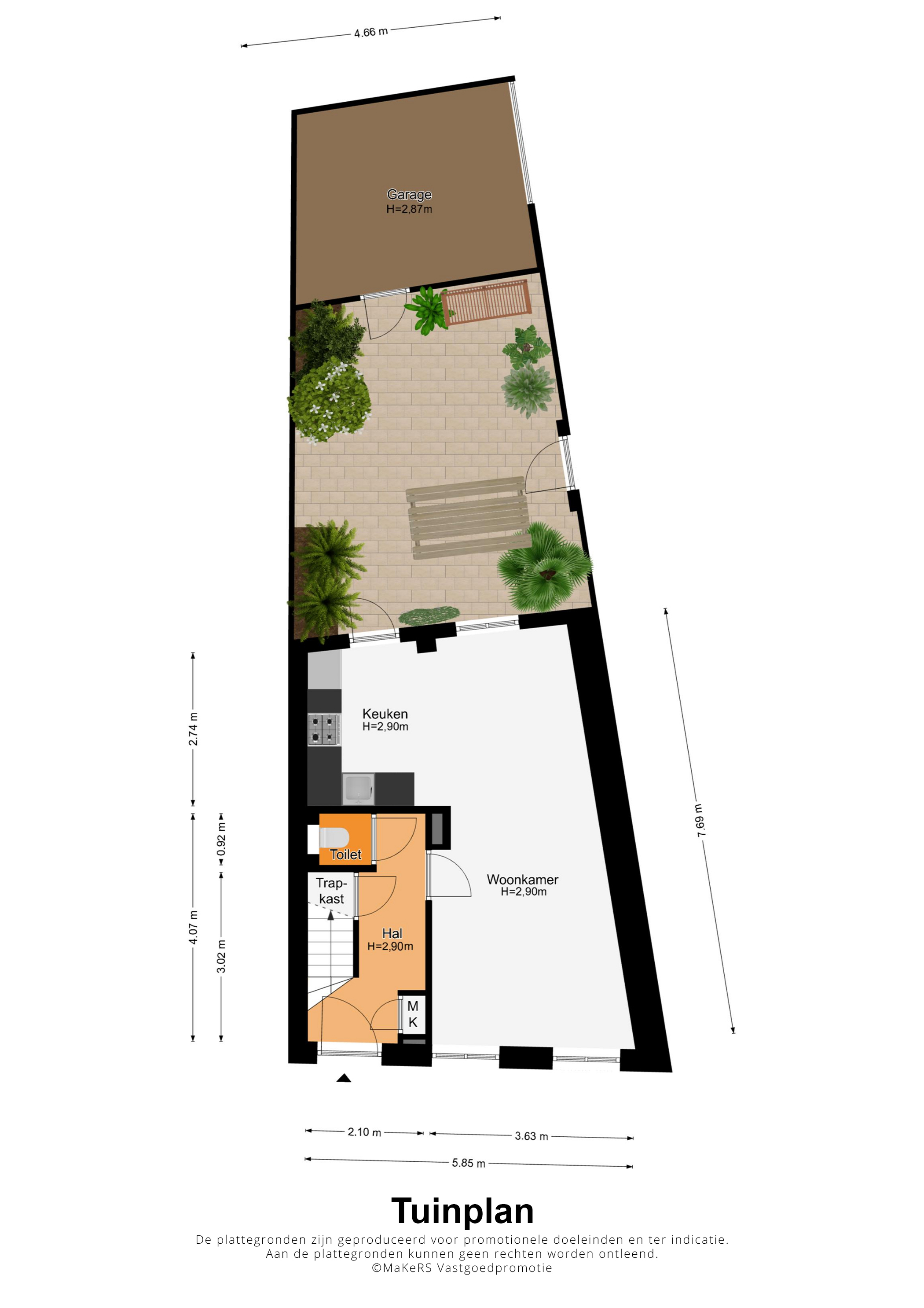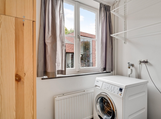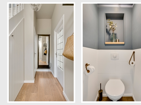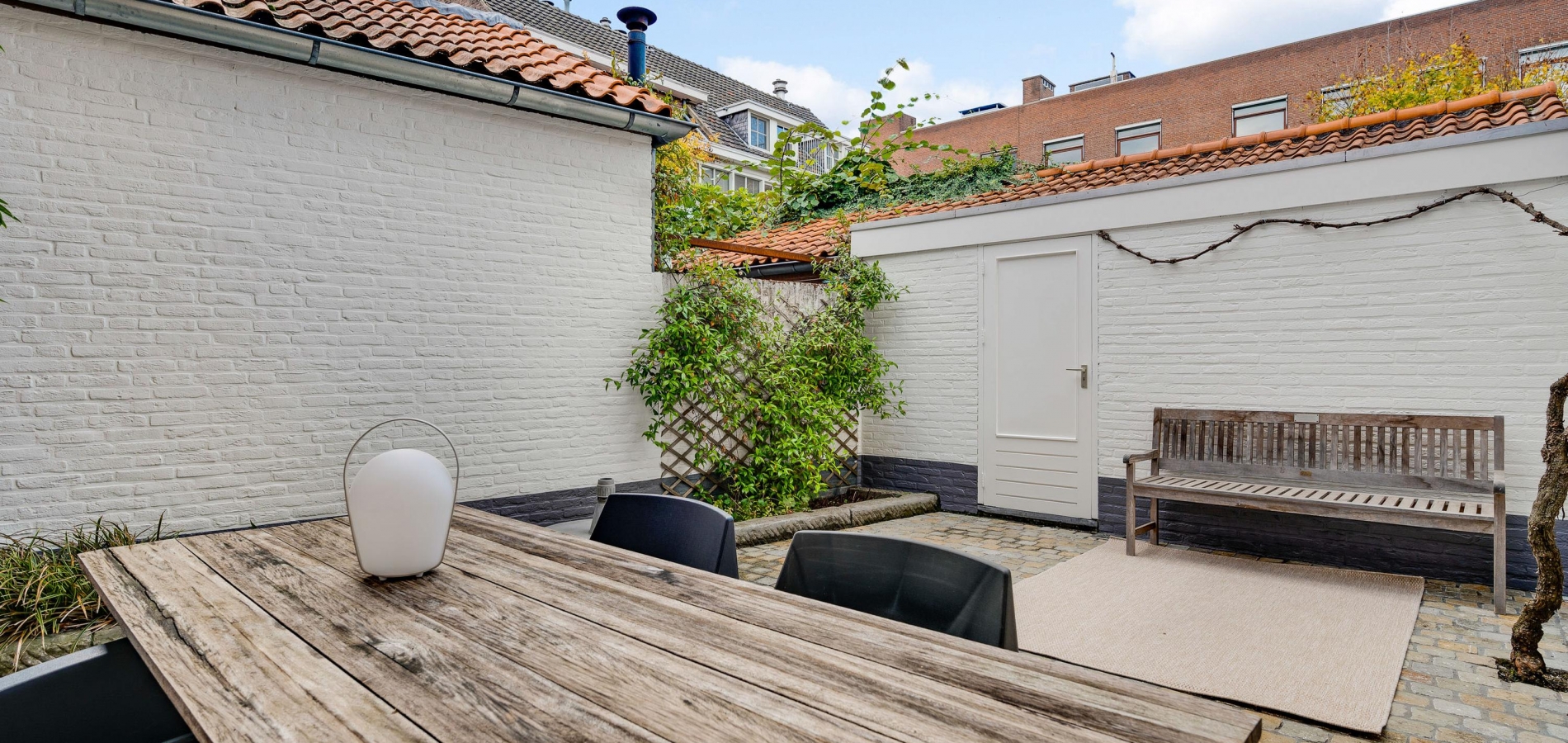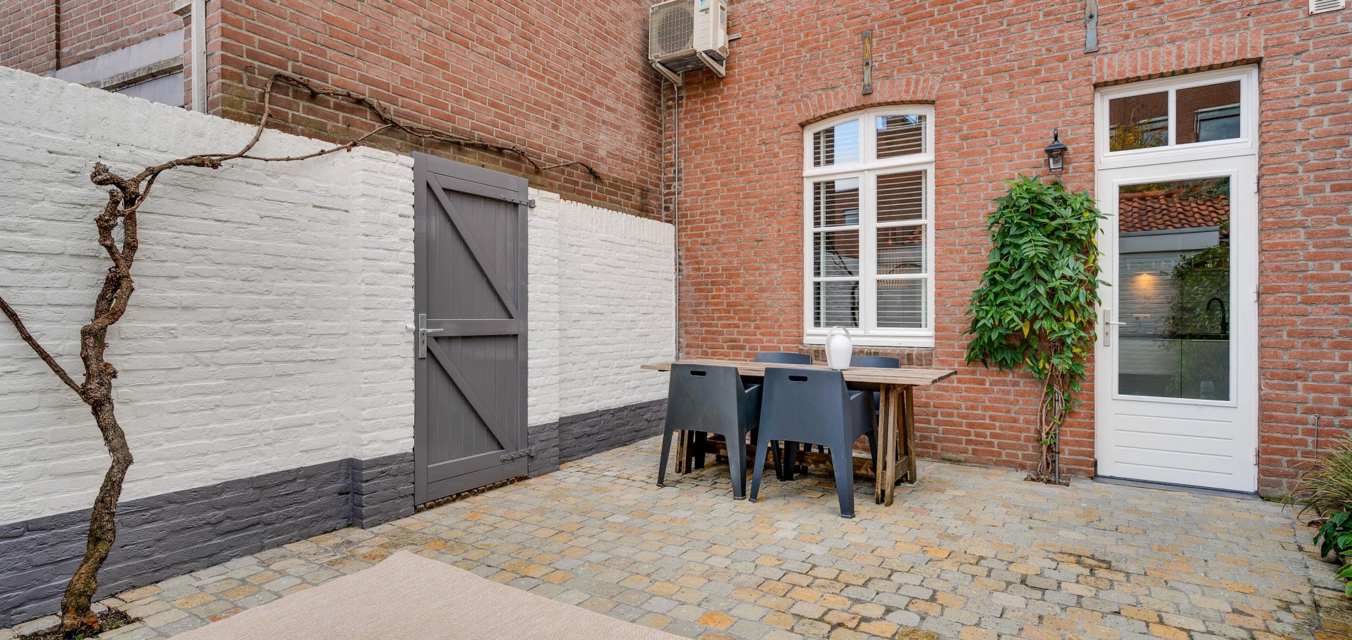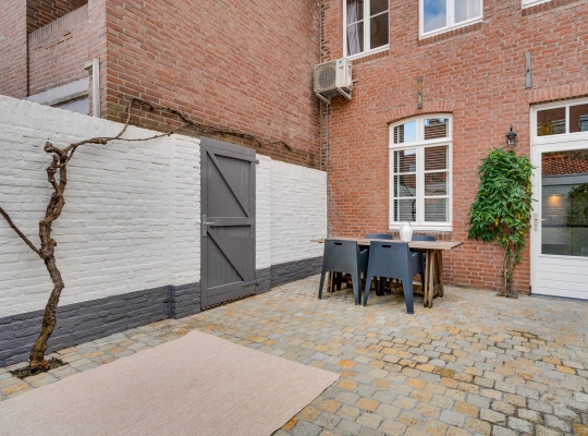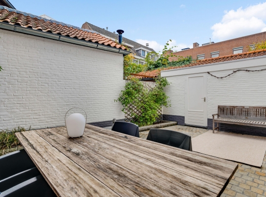 Vanuit de keuken is de sfeervolle stadstuin te bereiken, met fraaie bestrating en tuinmuren die in dezelfde kleuren als de gevel van de garage zijn geschilderd. De poort geeft toegang tot een achterom en de garage (circa 14 m2) is de perfecte plek voor de fietsen en andere spullen.