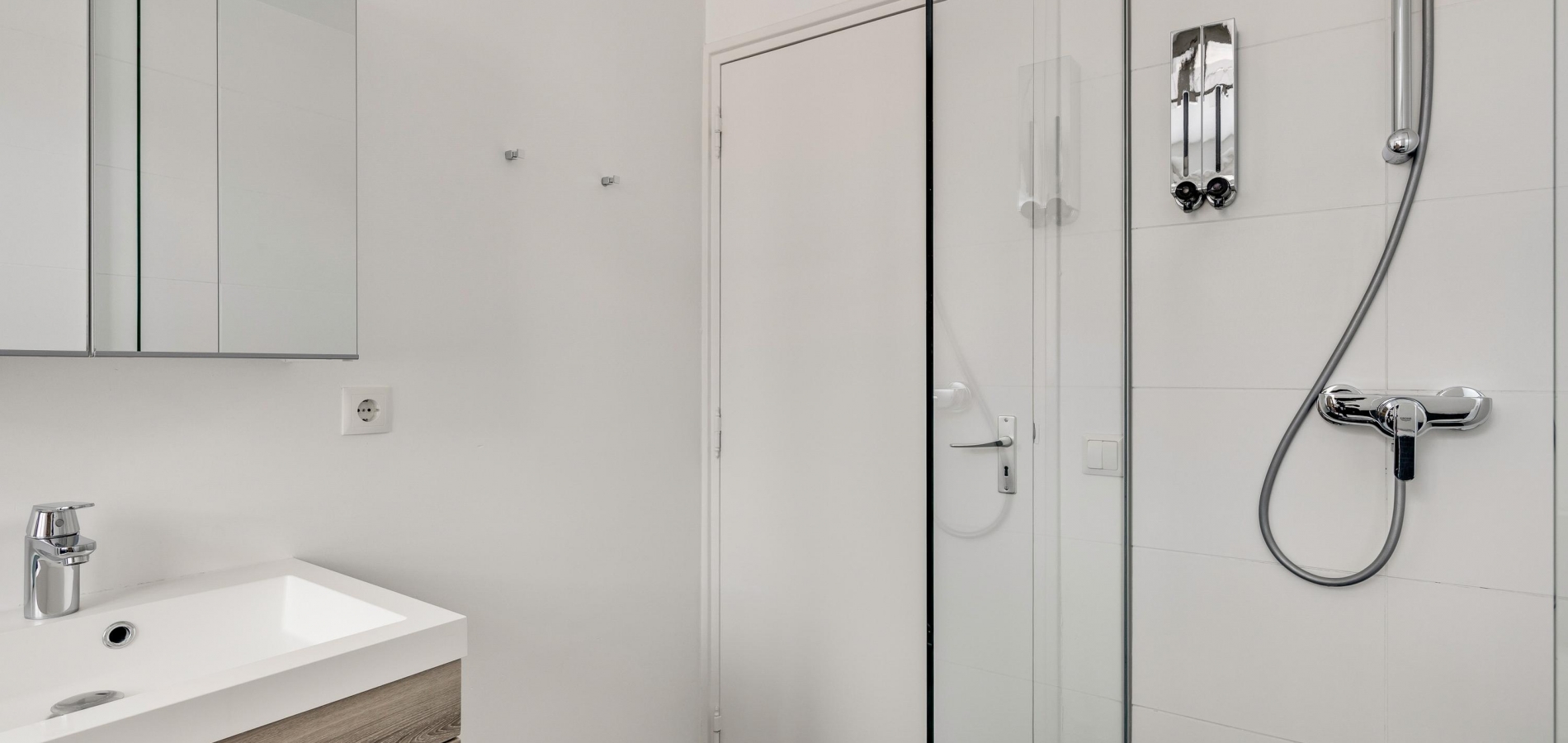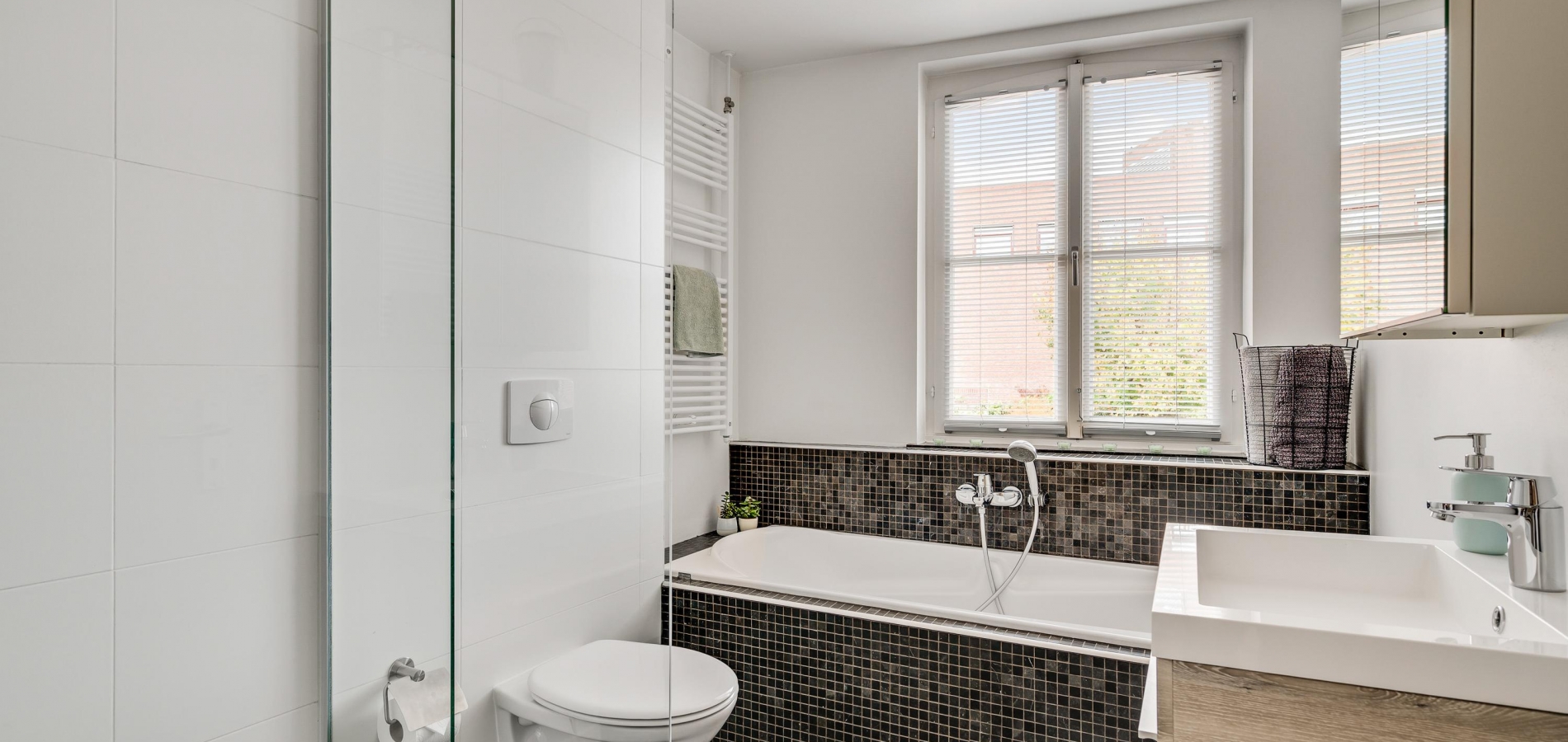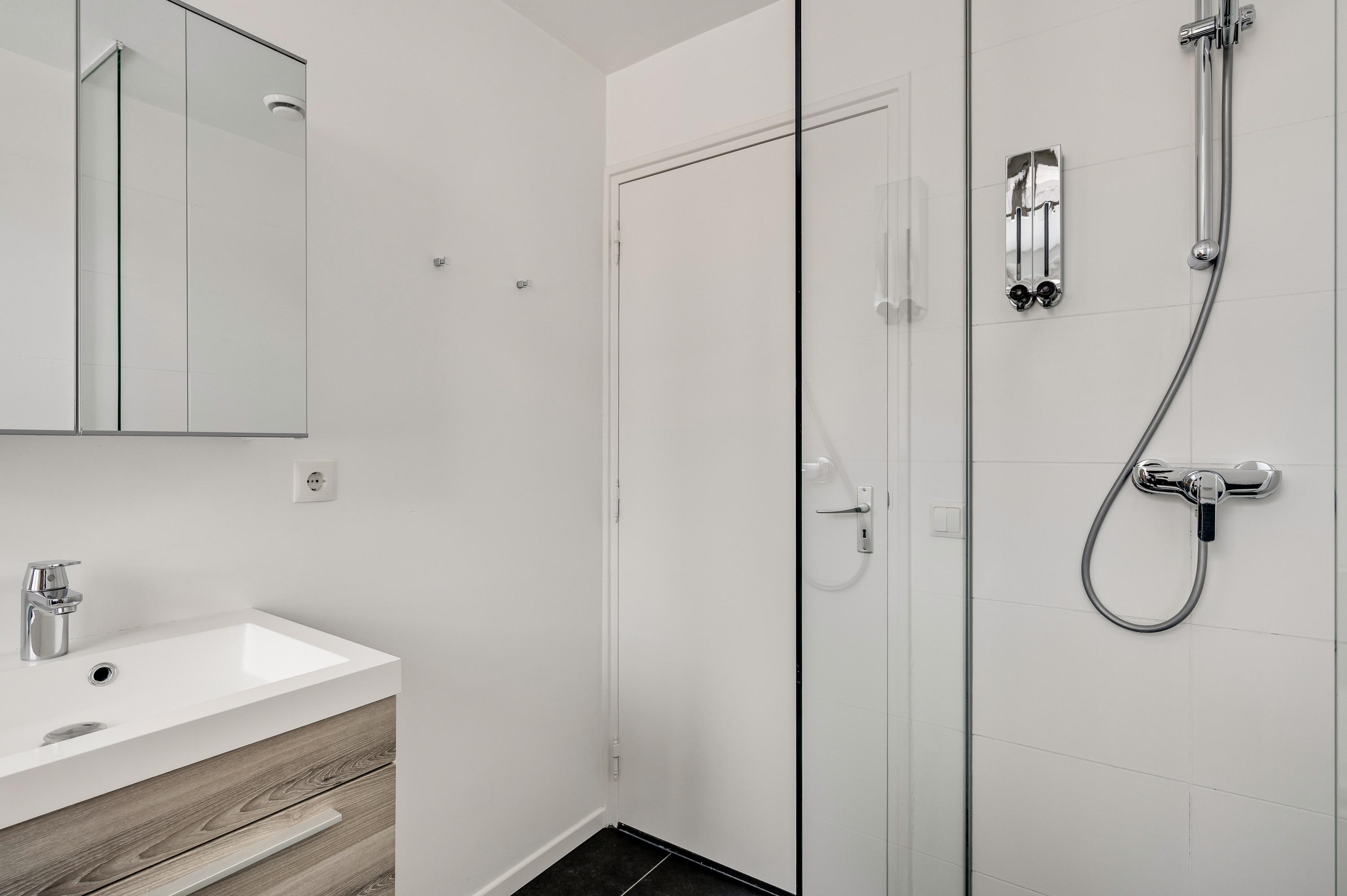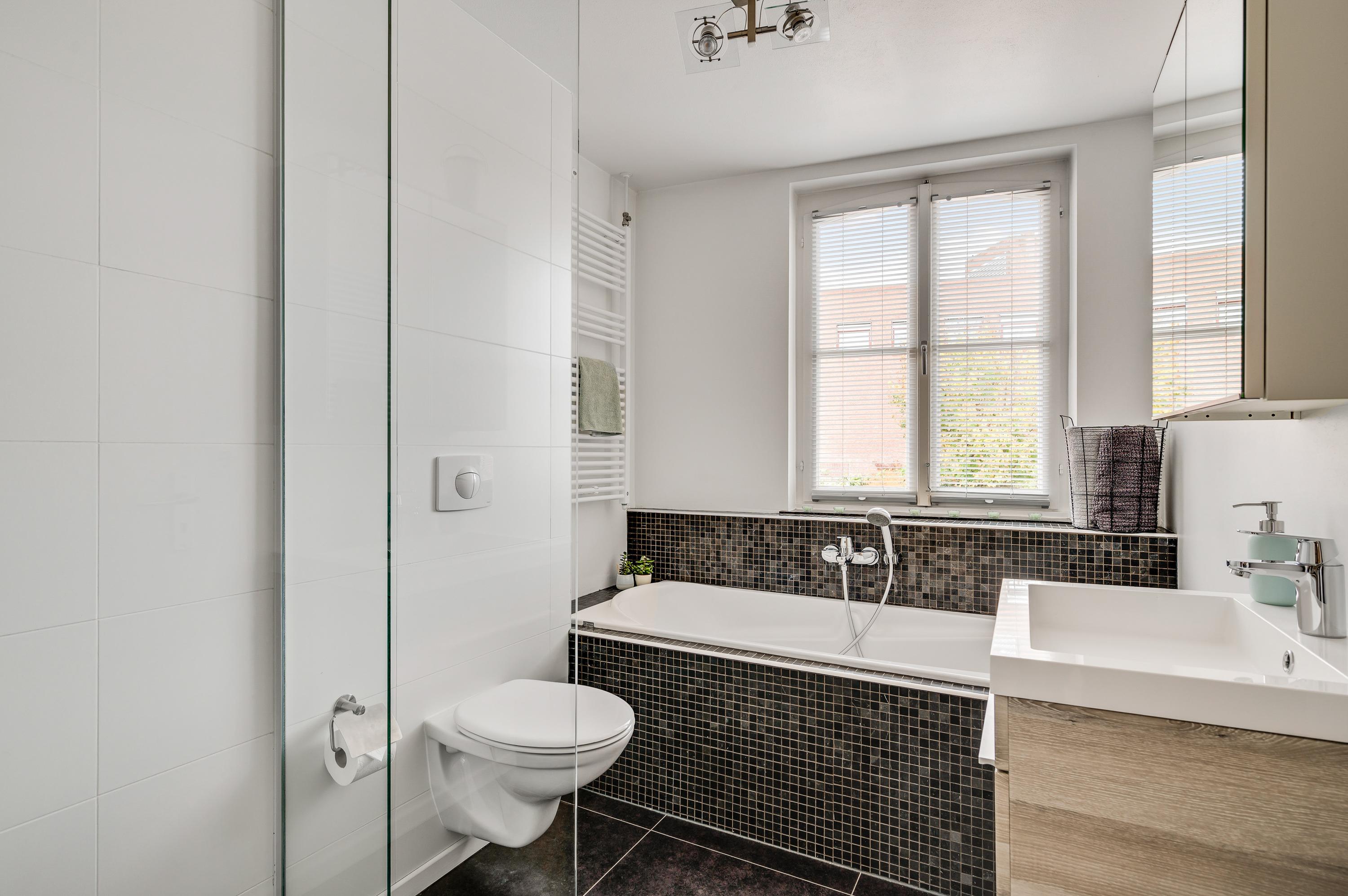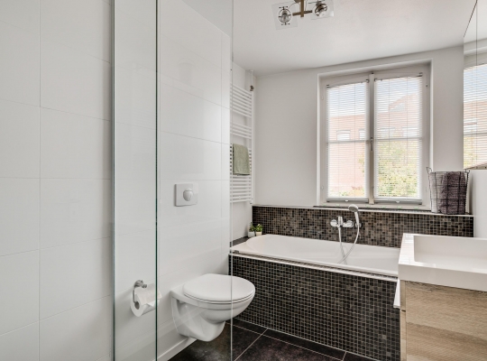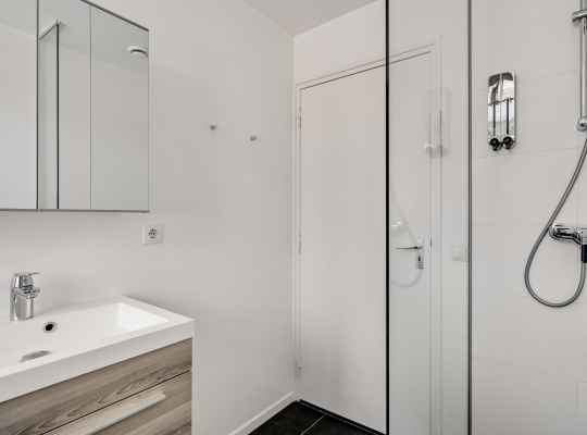 Aan de achterzijde is de badkamer, met een dubbel raam waardoor veel licht naar binnen valt. Het bad staat in de breedte en verder zijn er een inloopdouche, toilet en een wastafelmeubel met spiegelkast in de badkamer.