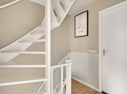 Niet alleen de begane grond, maar ook de eerste verdieping heeft veel sfeer. Vanaf de overloop heeft u toegang tot twee slaapkamers, de badkamer en een wasruimte/berging.