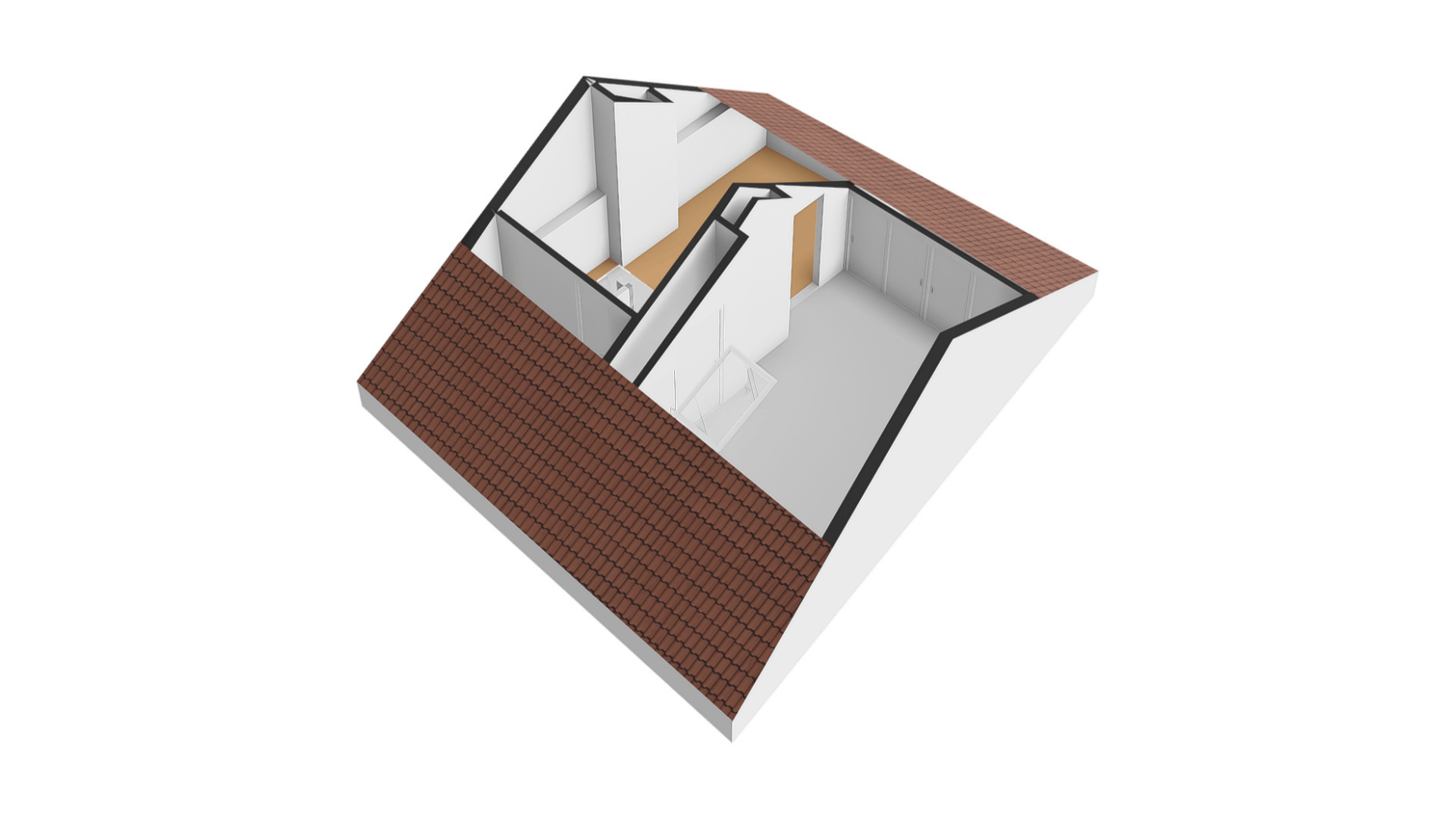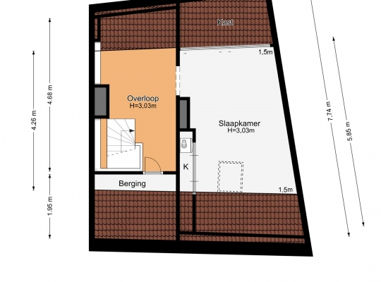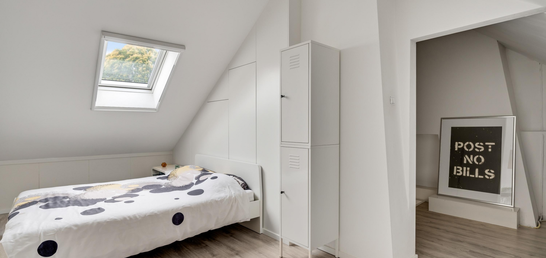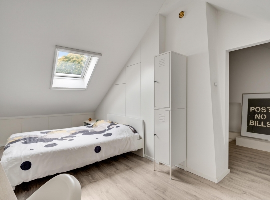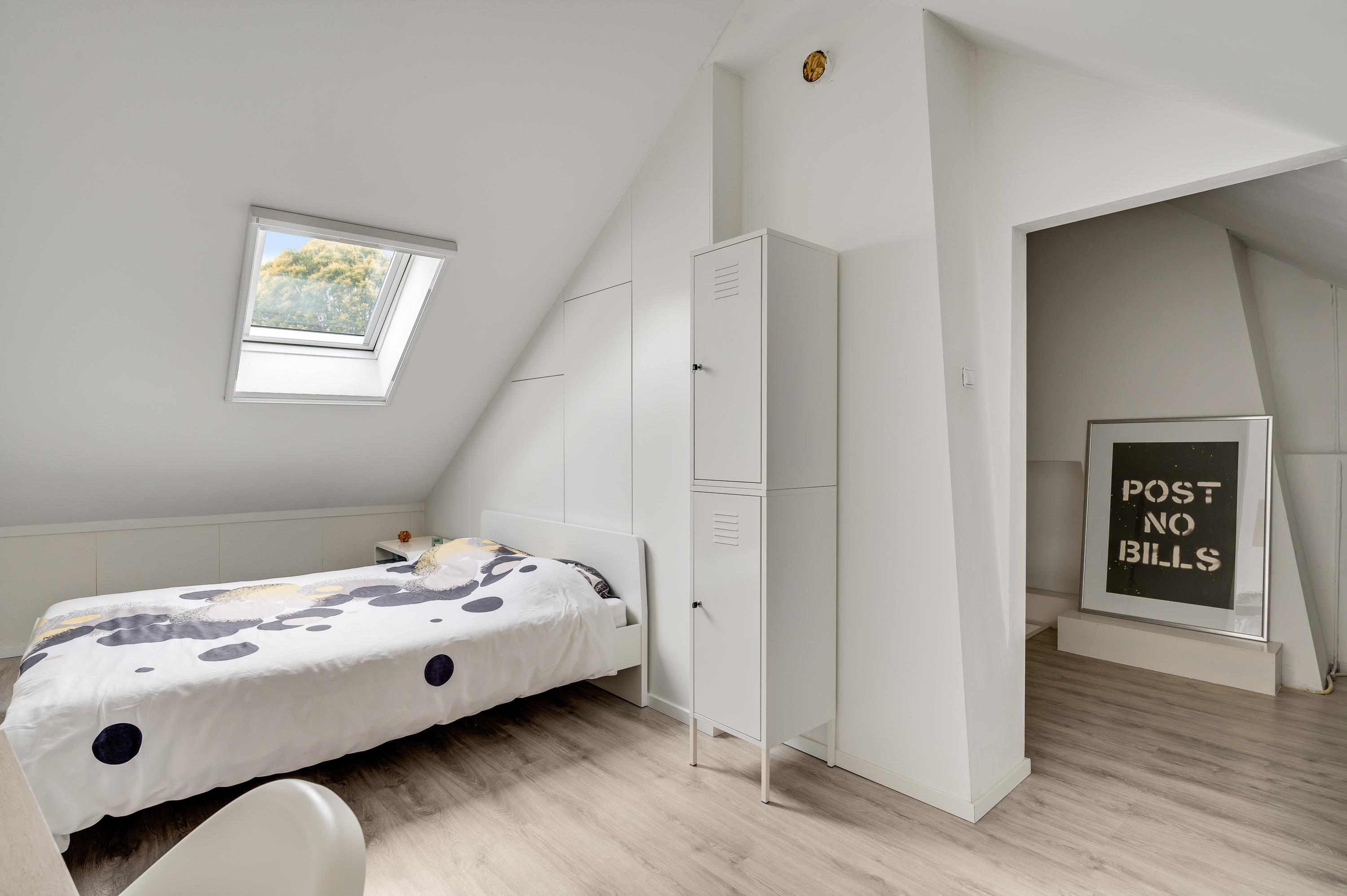 Met een hoogte van iets meer dan 3 meter is de tweede verdieping heel ruim. Als eerste is er de overloop, met een berging in de schuinte van het dak. Slaapkamer III is een fraaie kamer met een dakraam, diepe kasten in de schuinte van het dak en een vaste kastenwand achter het bed. Achter een van de deuren hangt de HR-ketel (Remeha, 2015, eigendom).