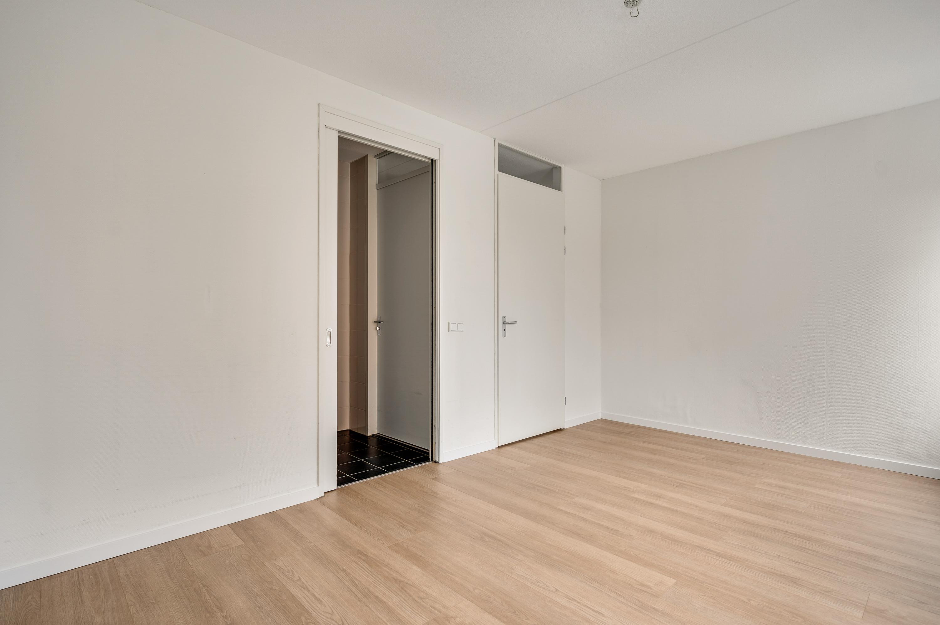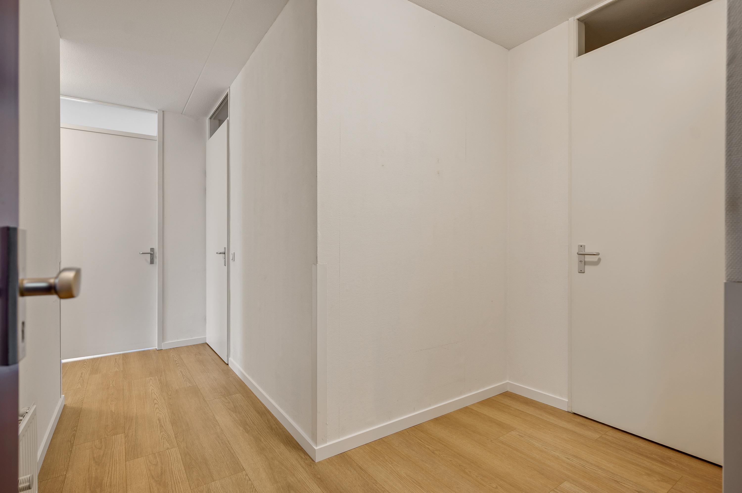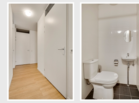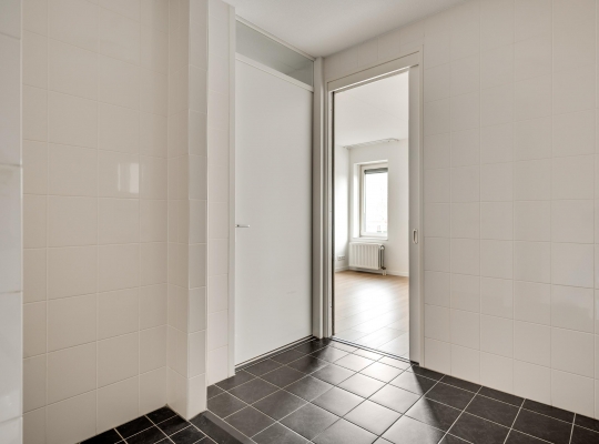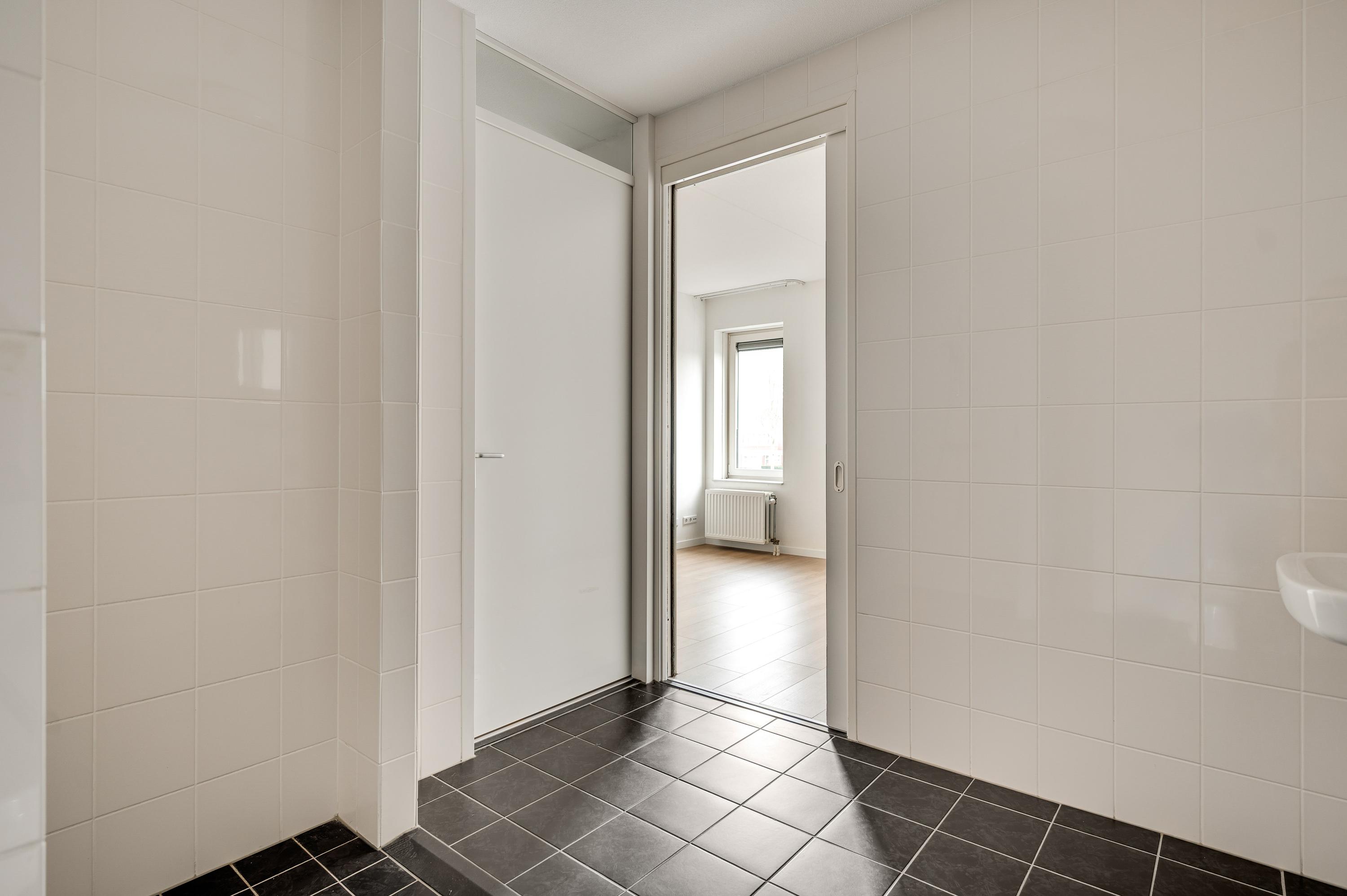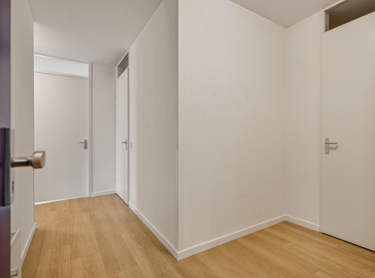 Of u nu met de trap of lift naar boven bent gegaan, de voordeur van dit gelijkvloerse appartement is binnen handbereik. In de ruime hal zijn de meterkast, een nis voor een kapstok en de toiletruimte met fonteintje. De mooie laminaatvloer ligt niet alleen in de hal, maar in bijna het hele appartement.