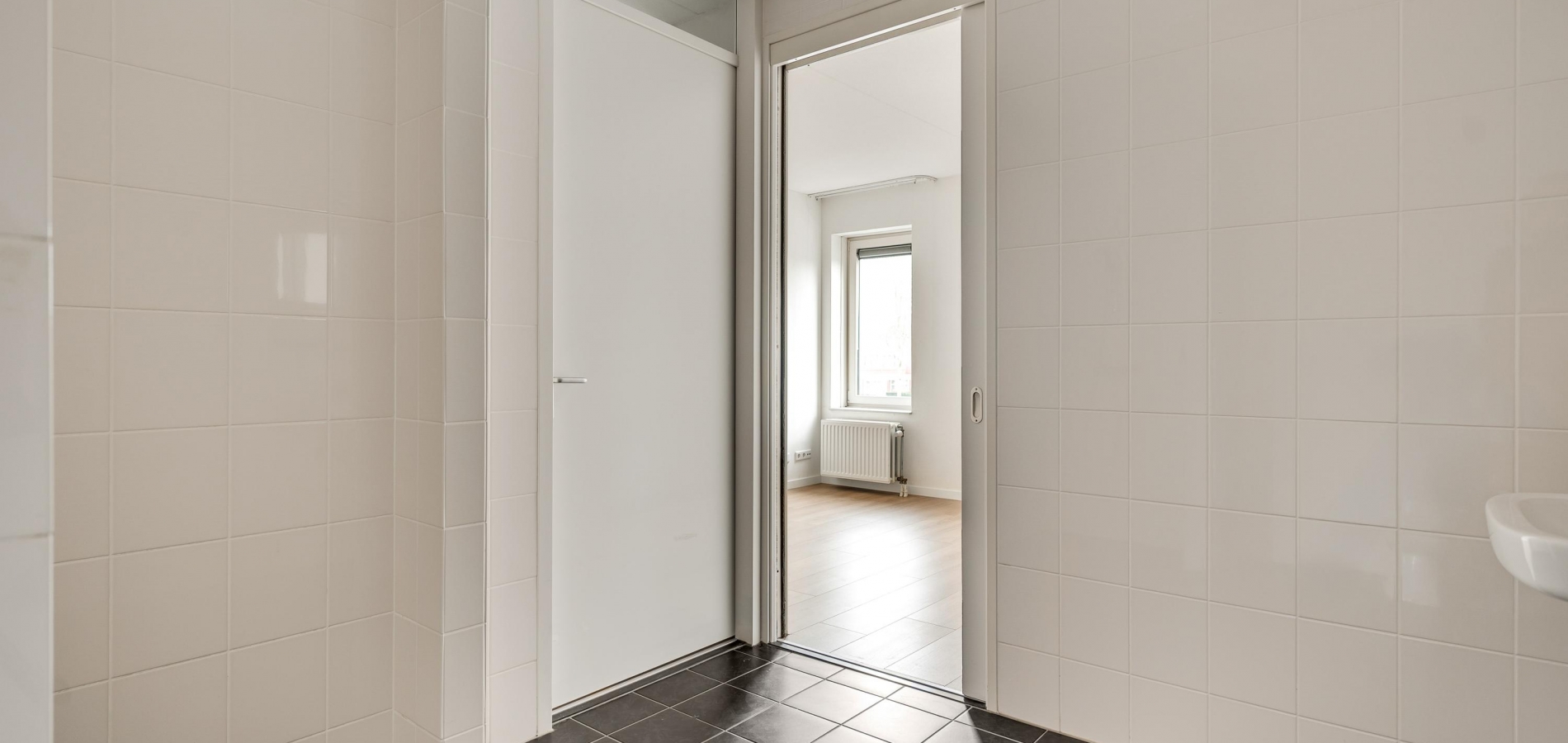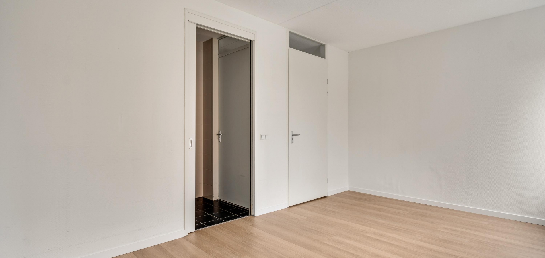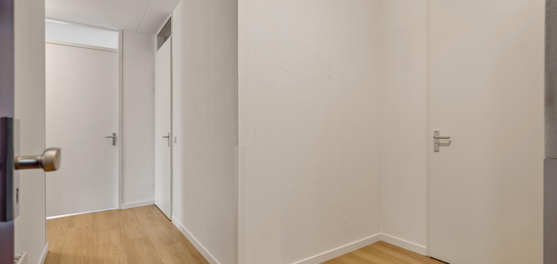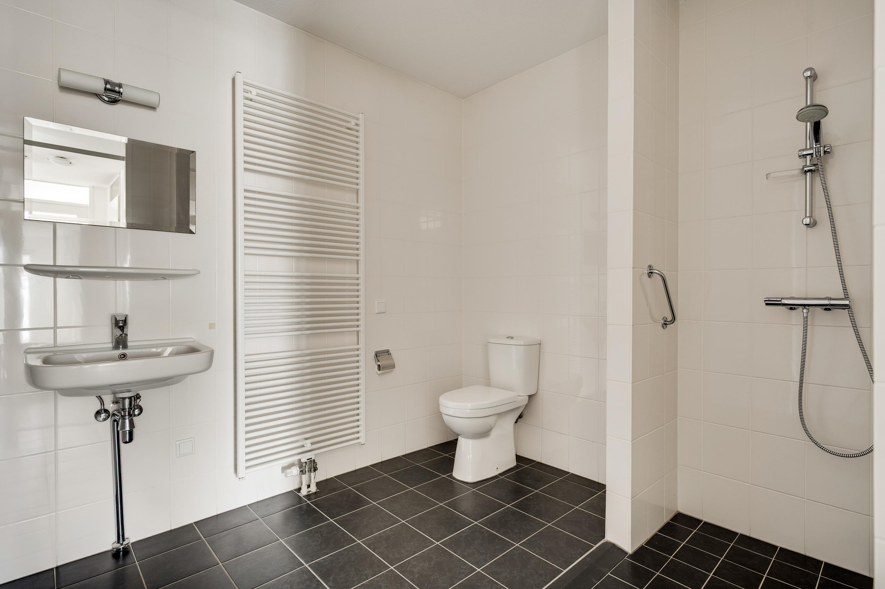 Of u nu met de trap of lift naar boven bent gegaan, de voordeur van dit gelijkvloerse appartement is binnen handbereik. In de ruime hal zijn de meterkast, een nis voor een kapstok en de toiletruimte met fonteintje. De mooie laminaatvloer ligt niet alleen in de hal, maar in bijna het hele appartement.