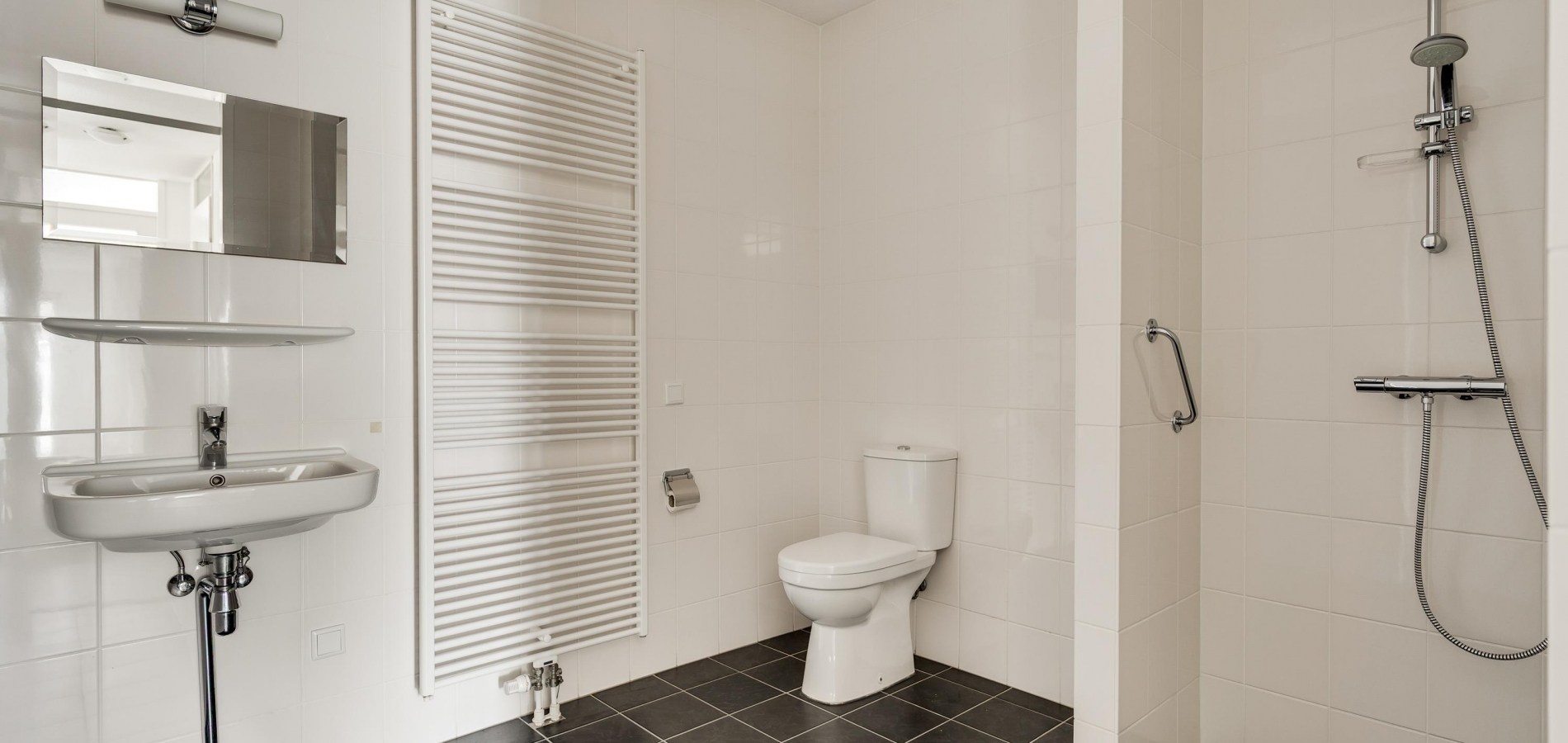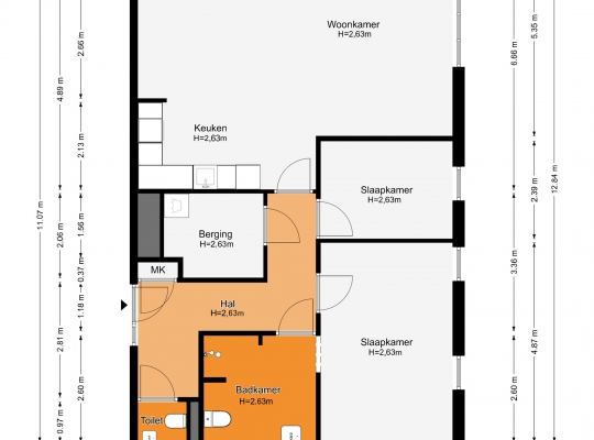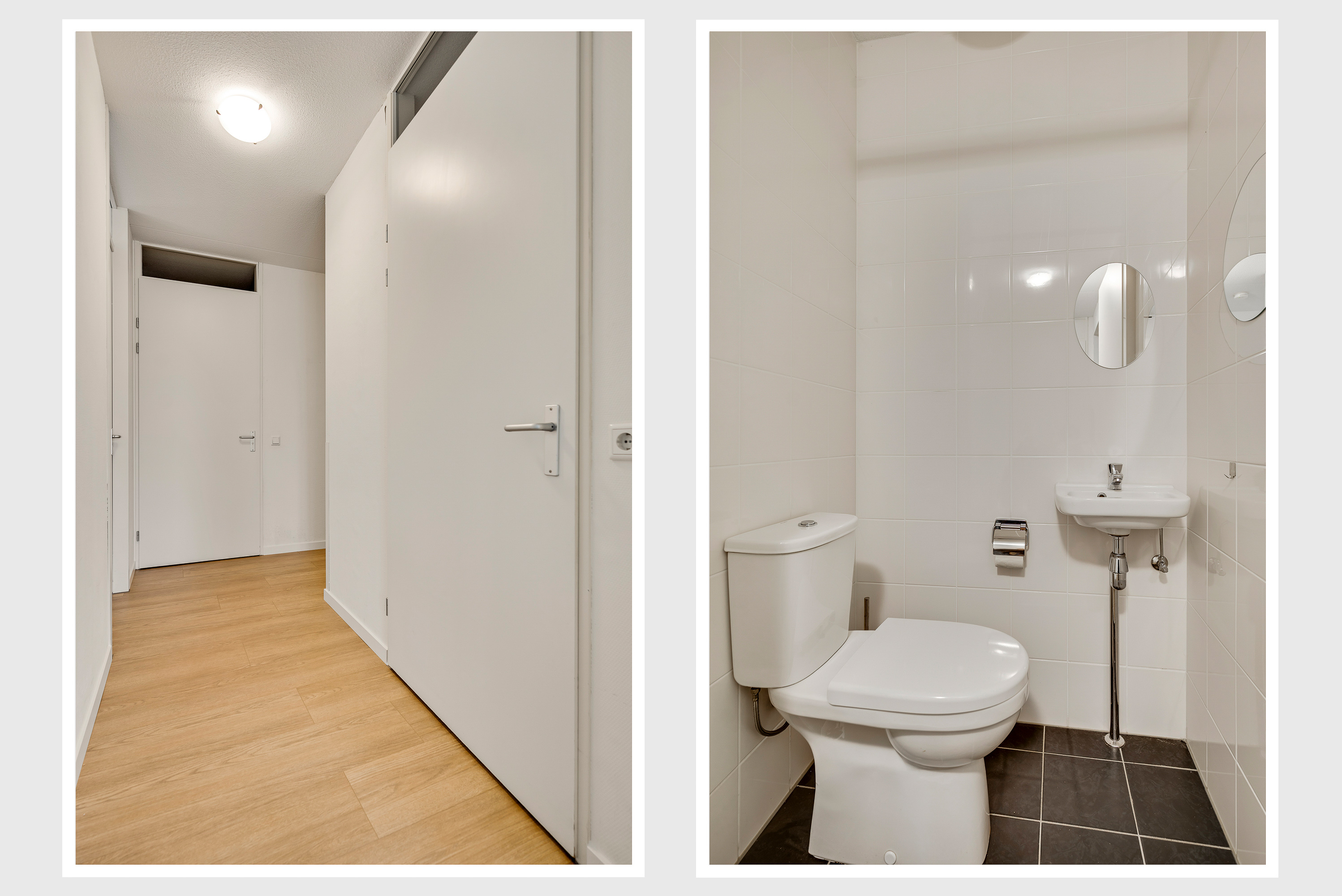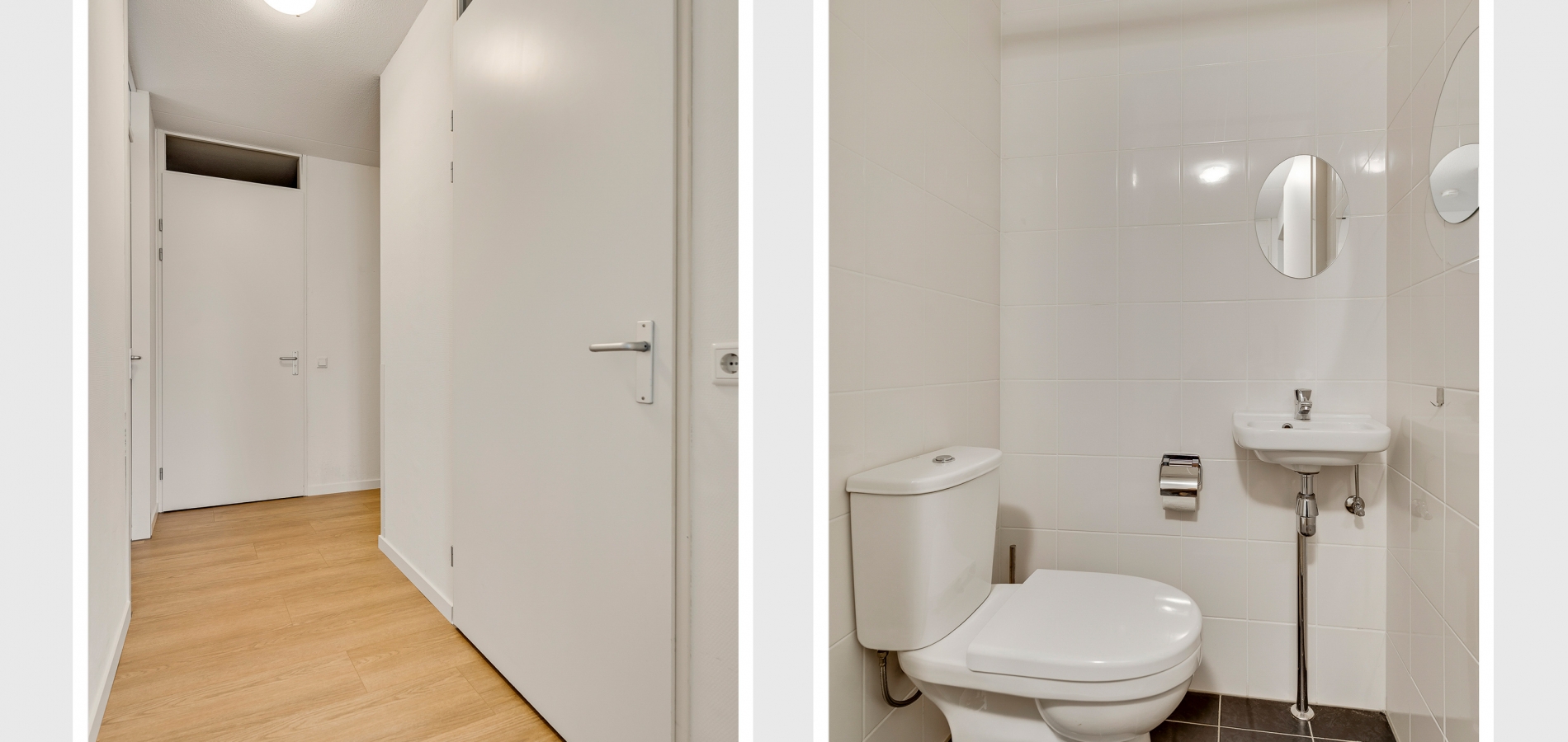 Of u nu met de trap of lift naar boven bent gegaan, de voordeur van dit gelijkvloerse appartement is binnen handbereik. In de ruime hal zijn de meterkast, een nis voor een kapstok en de toiletruimte met fonteintje. De mooie laminaatvloer ligt niet alleen in de hal, maar in bijna het hele appartement.