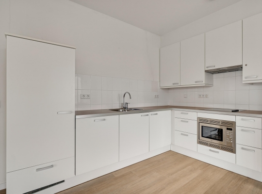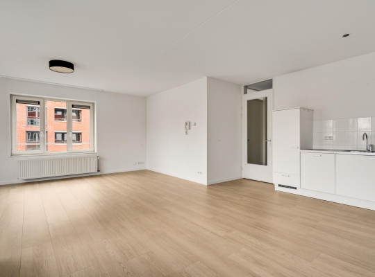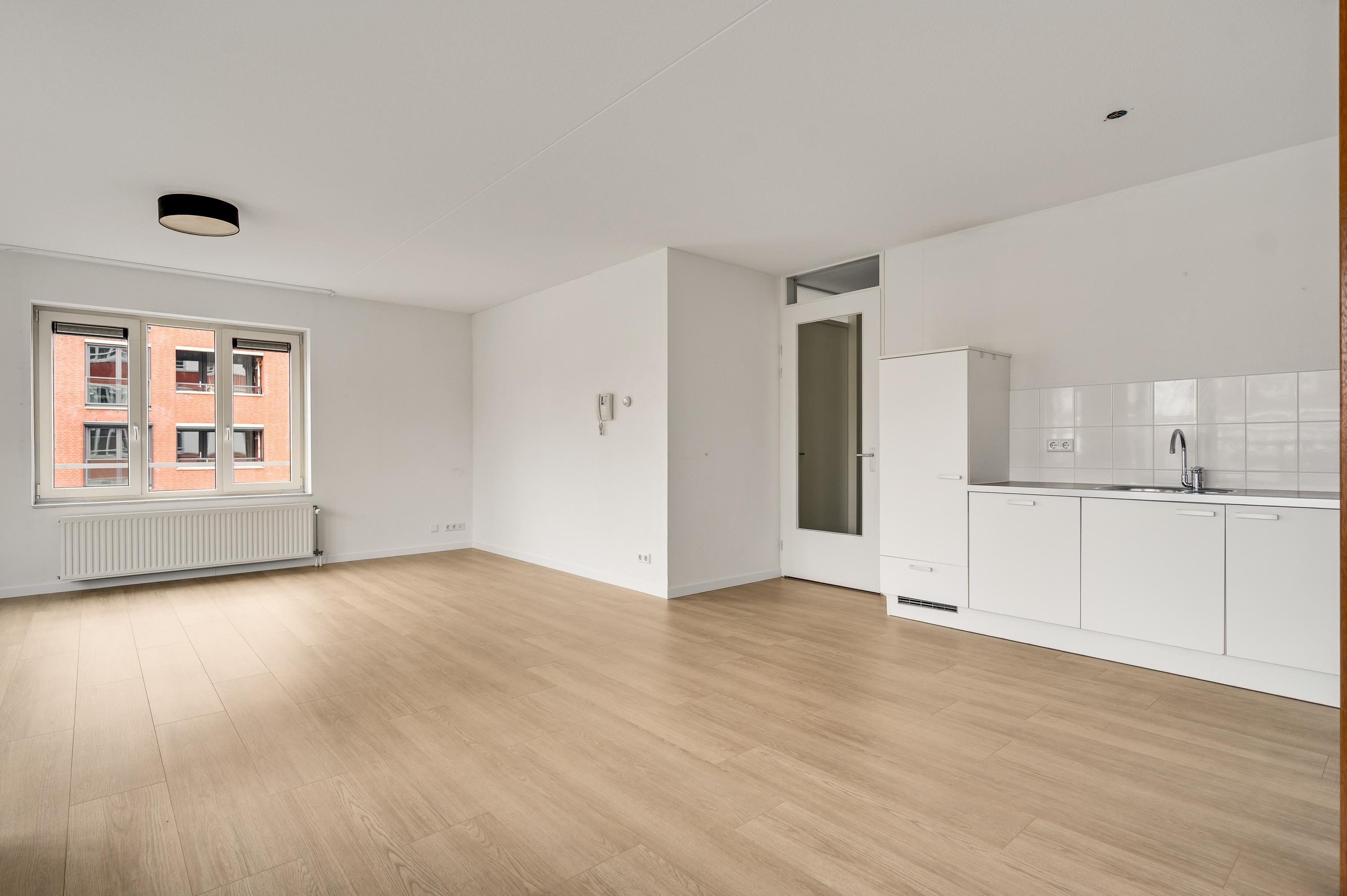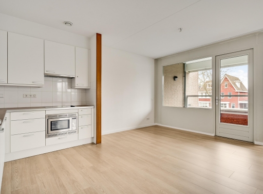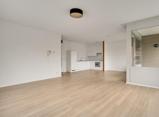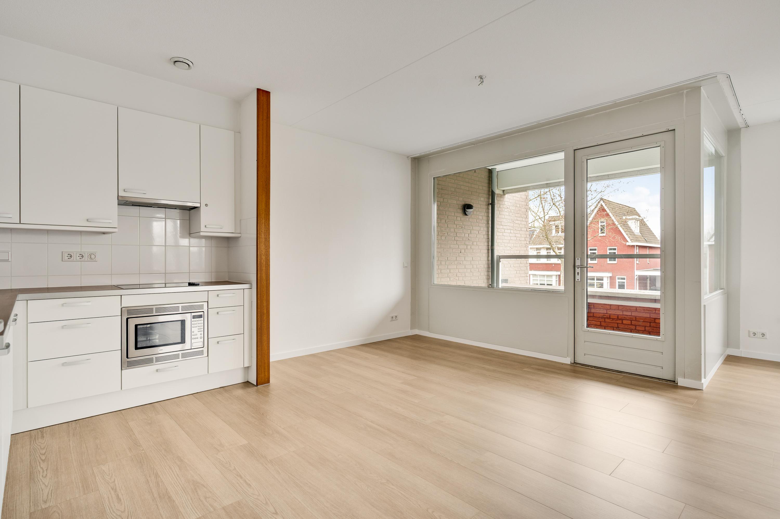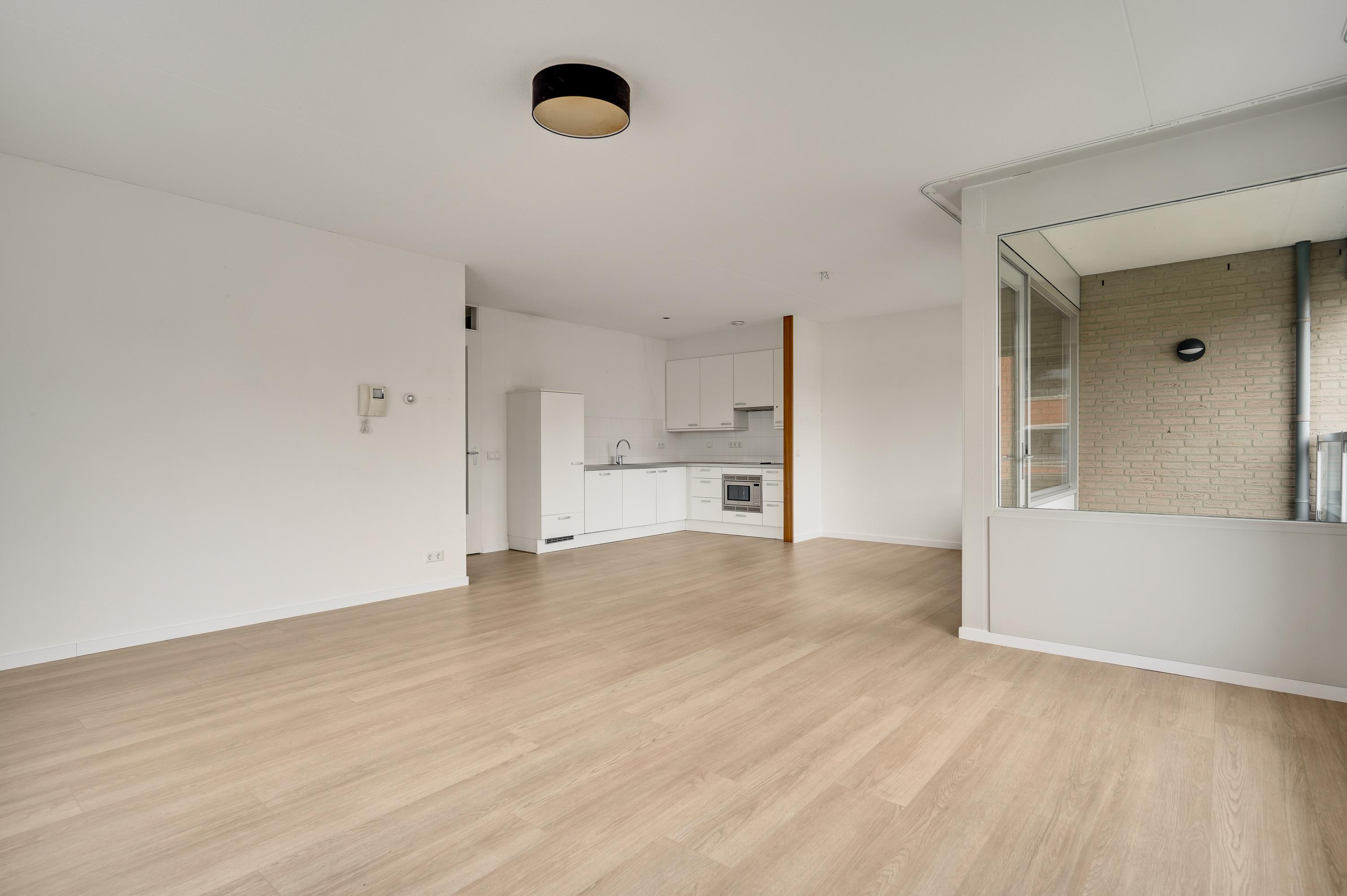 De woonkamer (circa 40 m2 inclusief keuken) is een goed in te delen leefruimte met lichtinval vanaf twee kanten. Voor een royale zithoek, een tv-meubel en de eettafel is genoeg plek. Het uitzicht op de mooie omliggende woningen maakt het wonen in dit appartement heel aantrekkelijk.