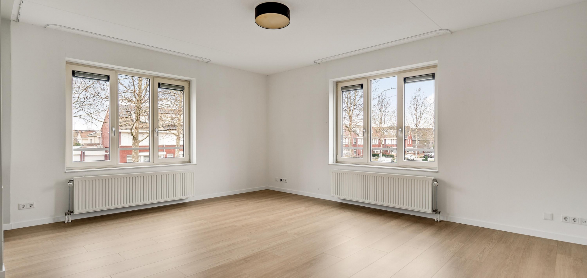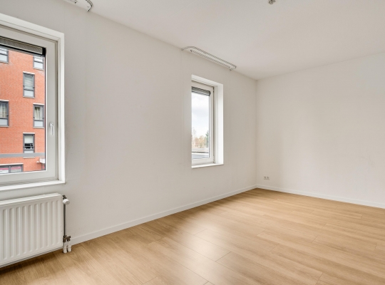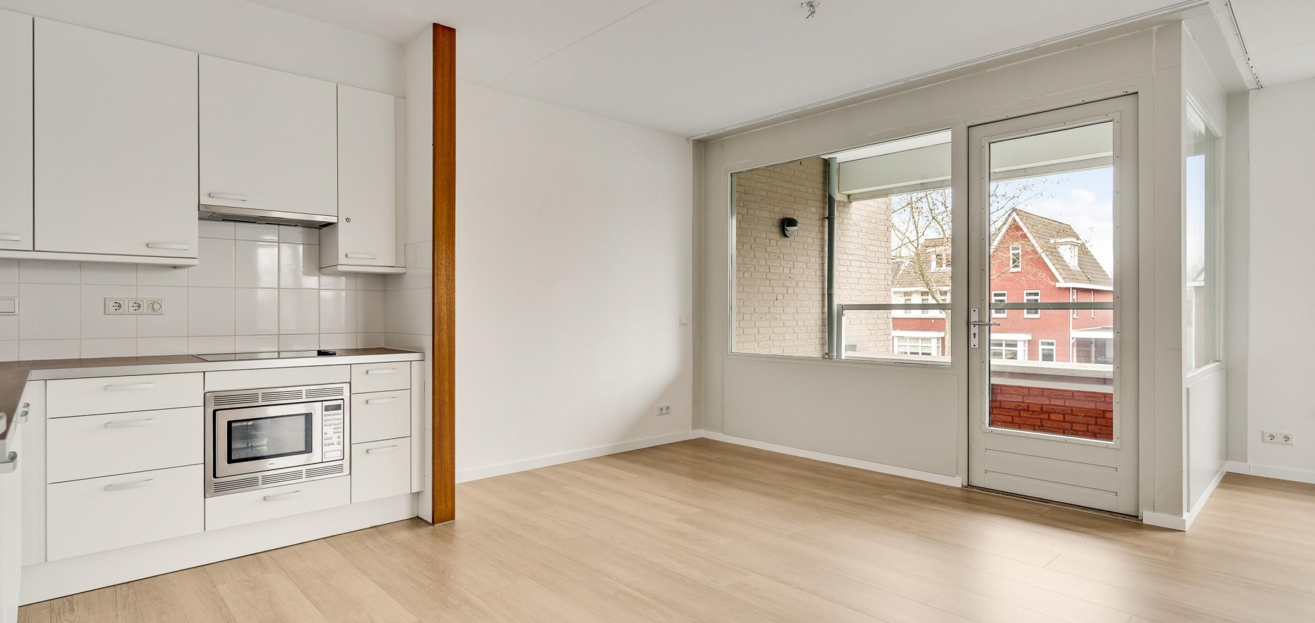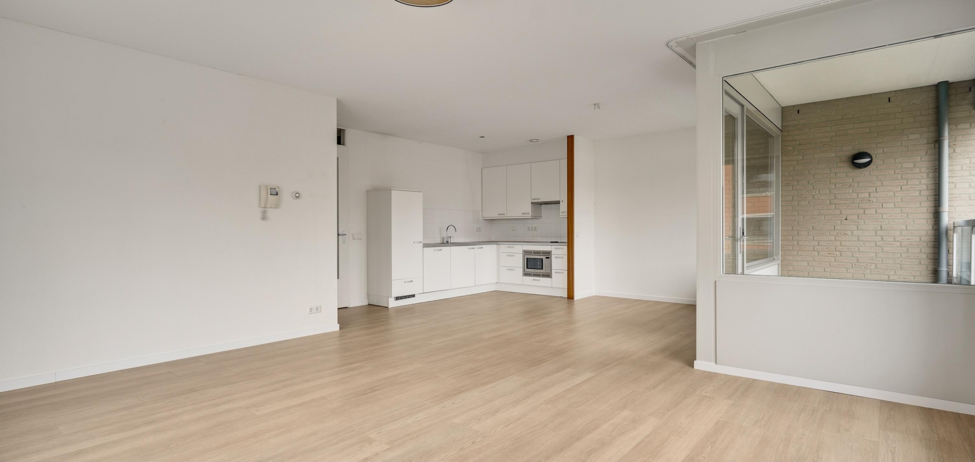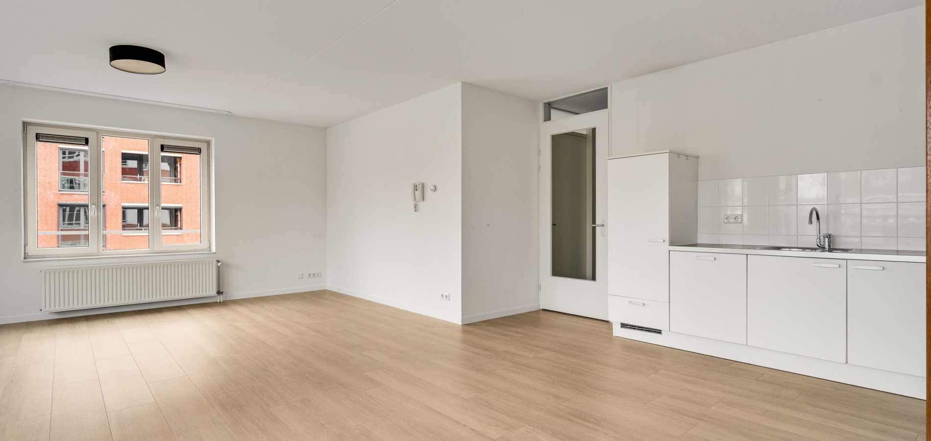 De woonkamer (circa 40 m2 inclusief keuken) is een goed in te delen leefruimte met lichtinval vanaf twee kanten. Voor een royale zithoek, een tv-meubel en de eettafel is genoeg plek. Het uitzicht op de mooie omliggende woningen maakt het wonen in dit appartement heel aantrekkelijk.