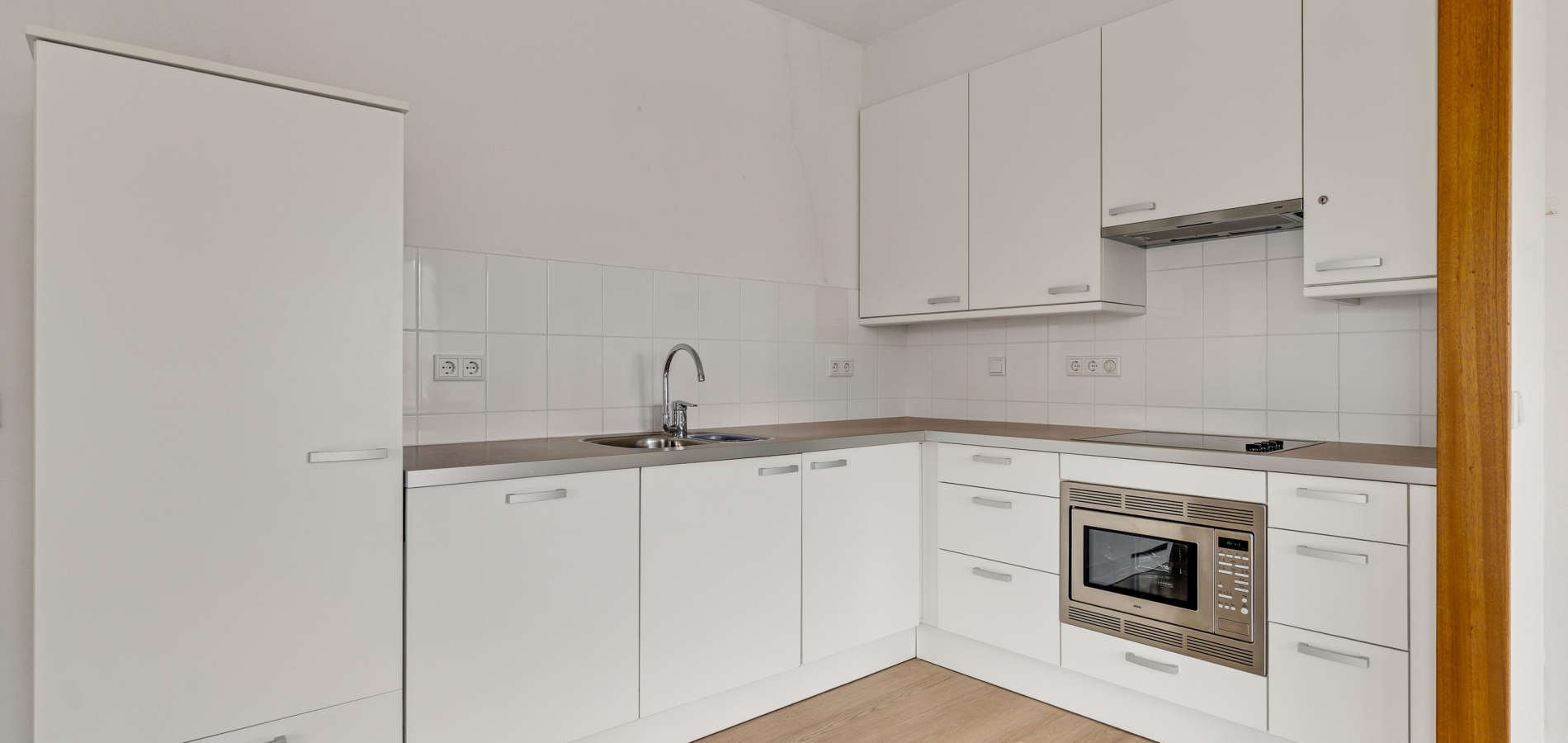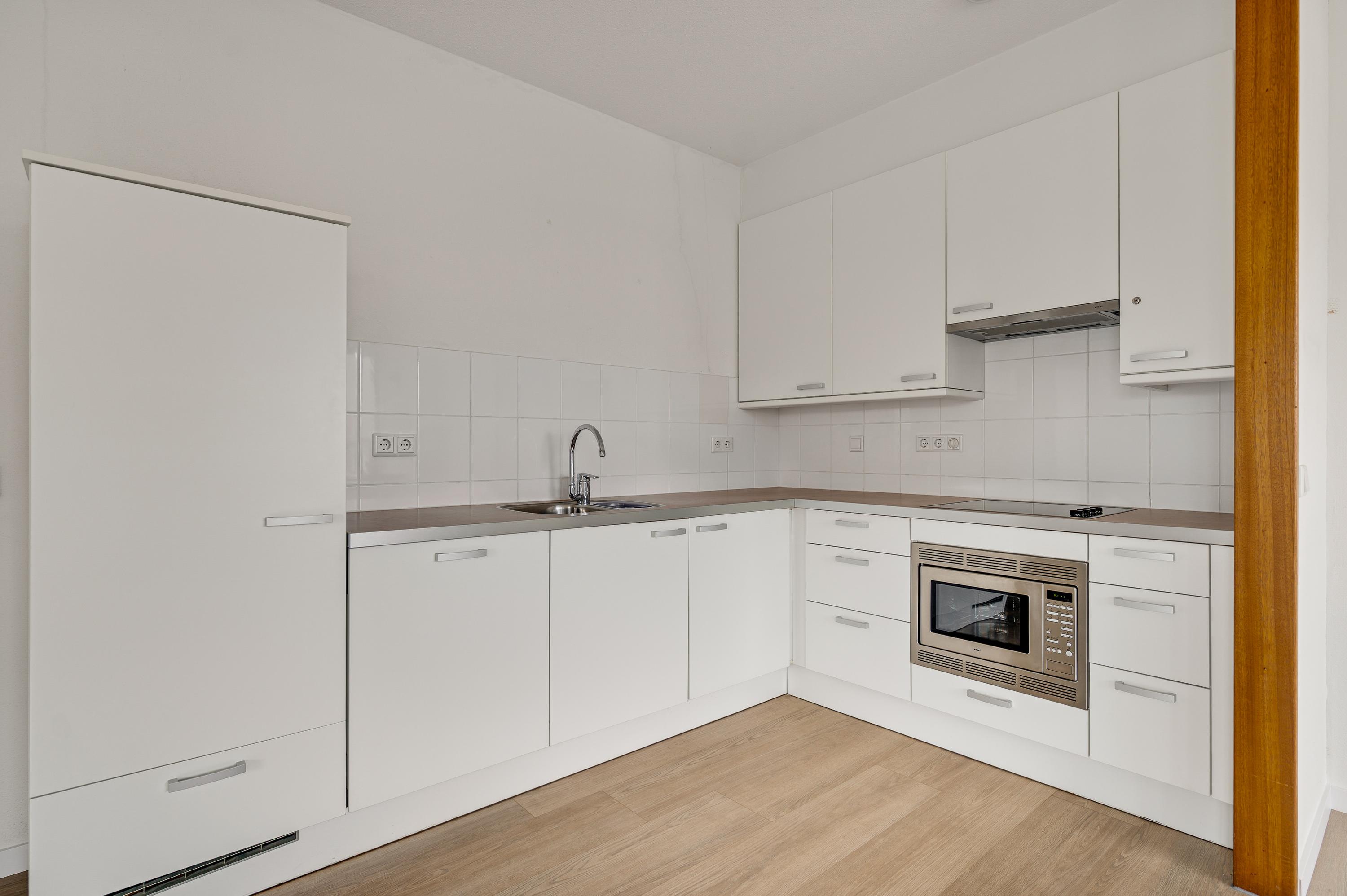 In de keuken staat een hoekopstelling met een kookplaat, afzuigkap, combimagnetron, vaatwasser en een koelkast. Naast de keuken is een berging/provisieruimte (circa 2,50 x 2,05) met de opstelling van de HR-ketel.
