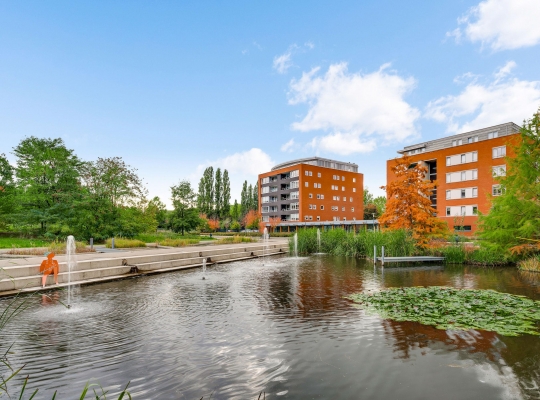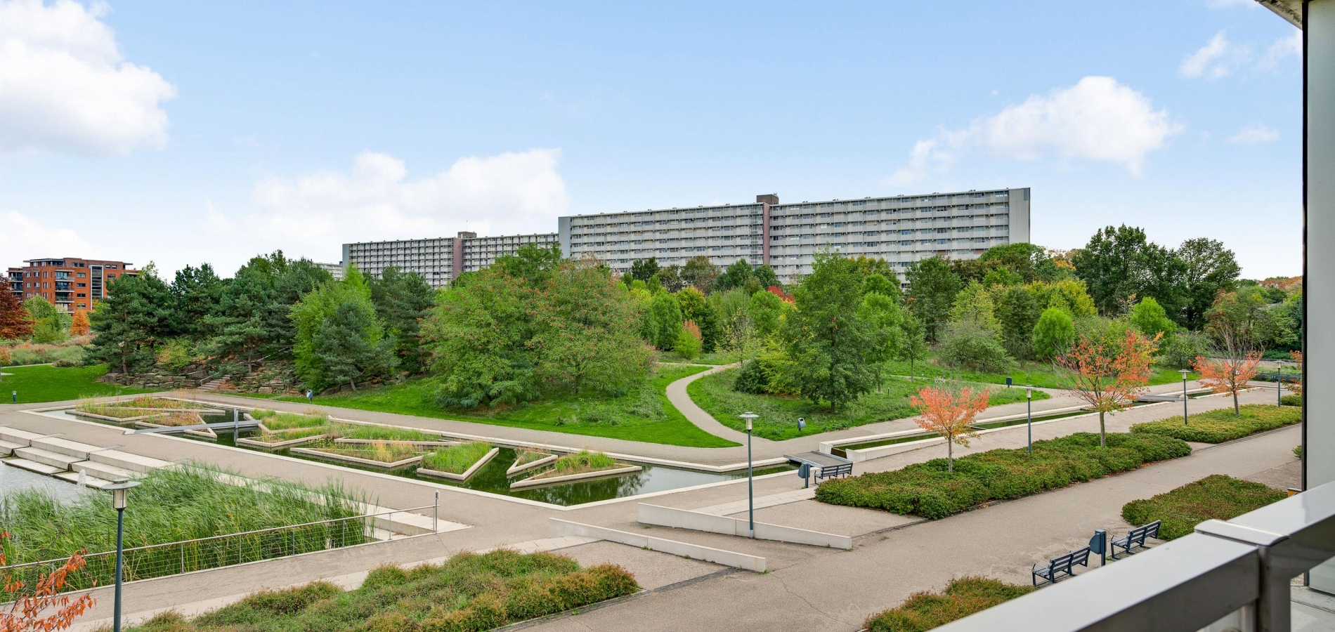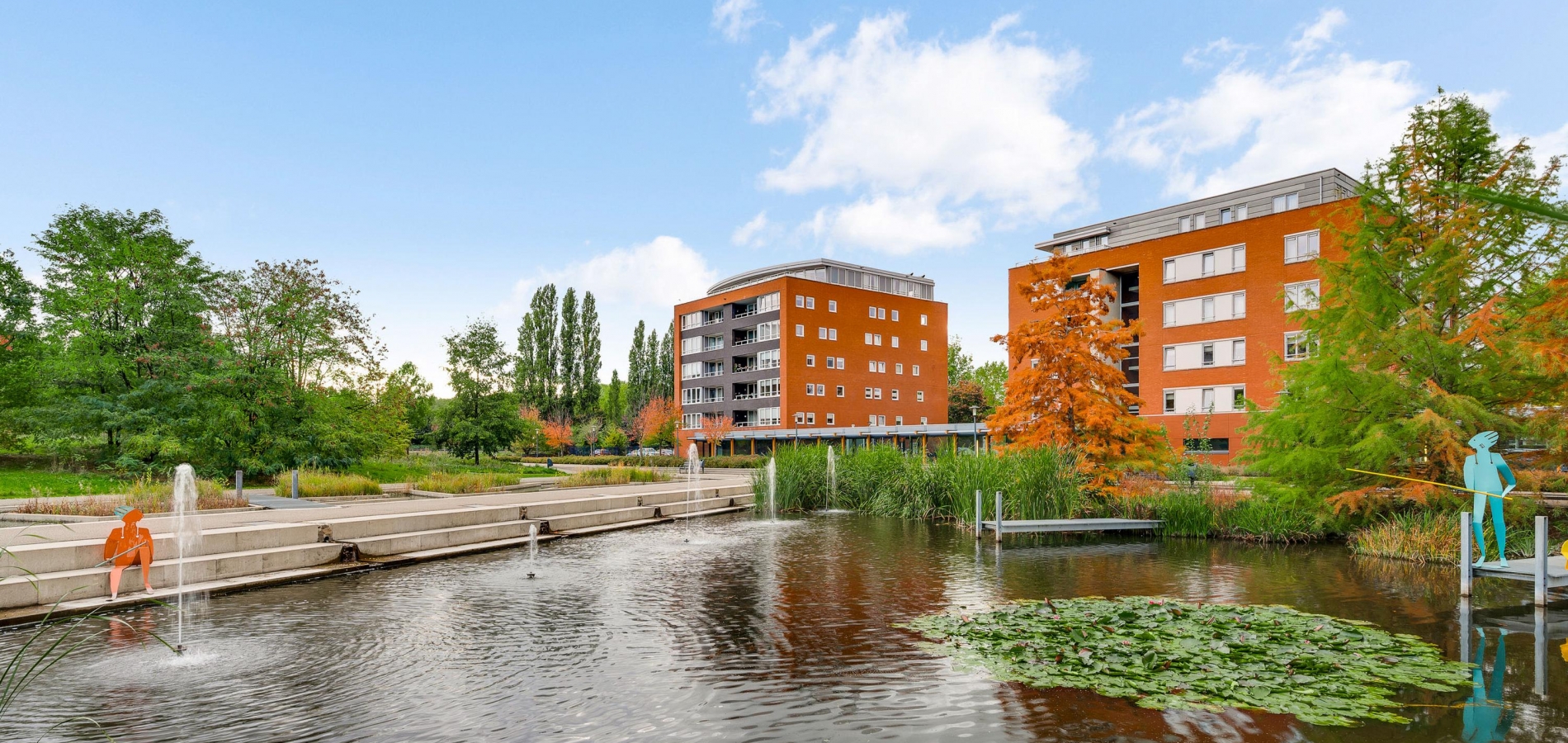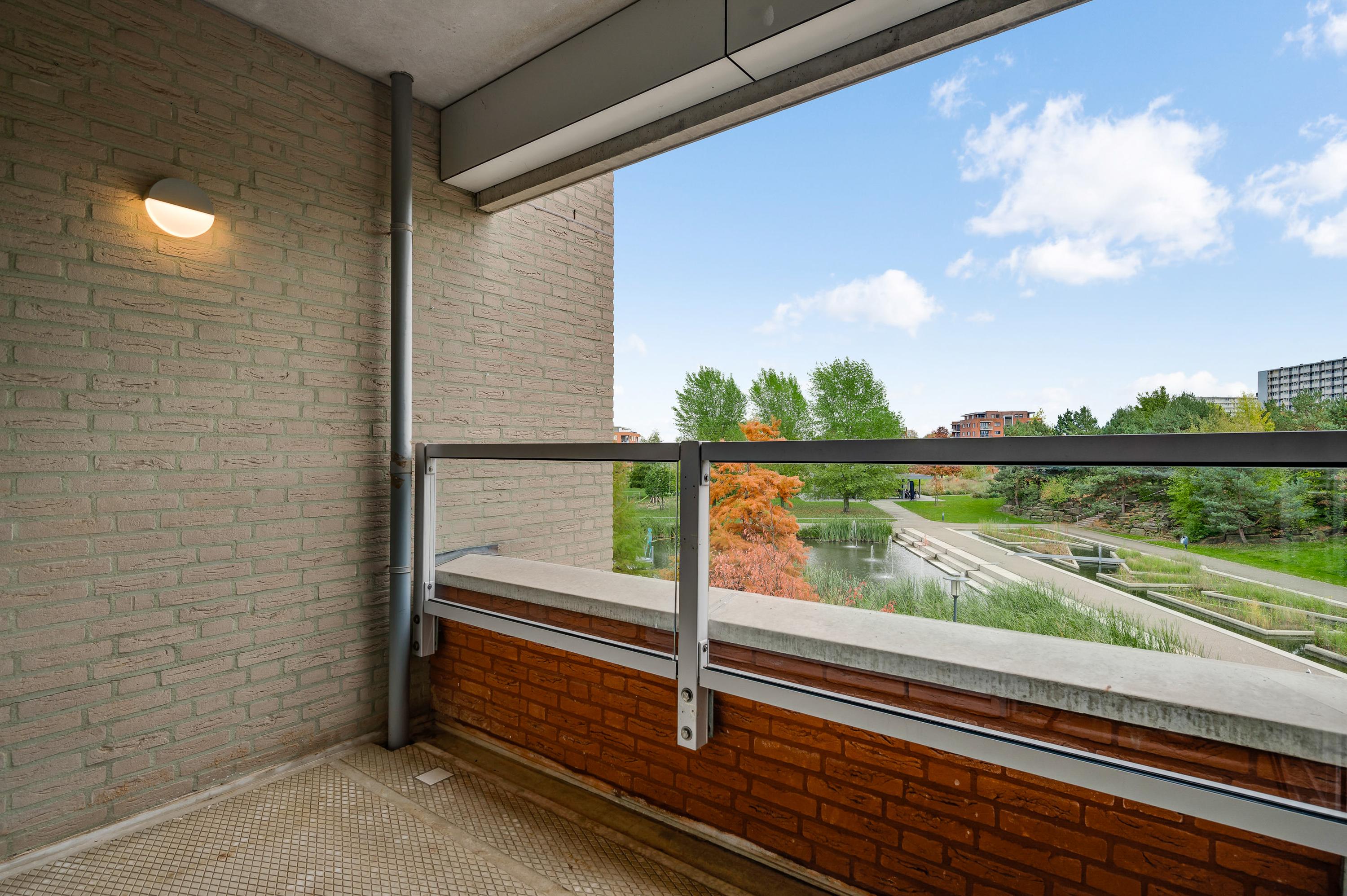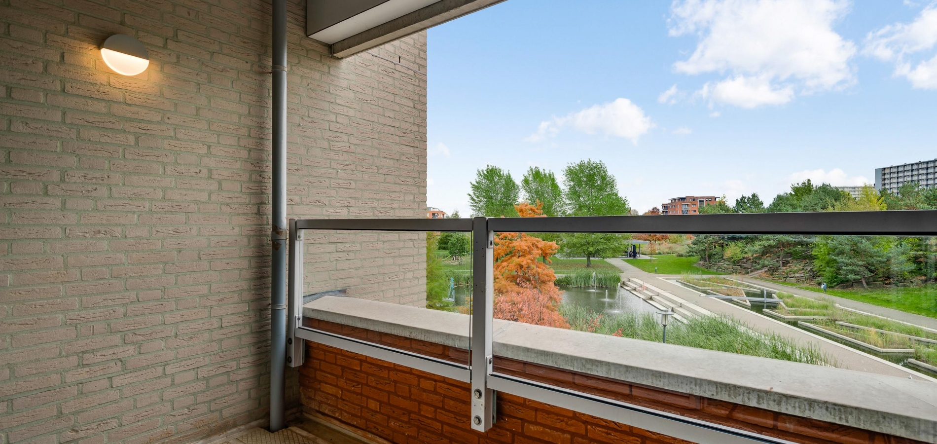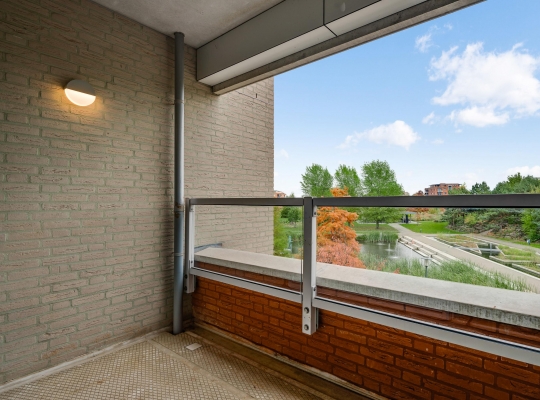 Het balkon (circa 3,12 x 1,75) is een fijne plek om buiten te zitten. Het uitzicht is fraai, onder andere naar de parkachtige omgeving met vijver.