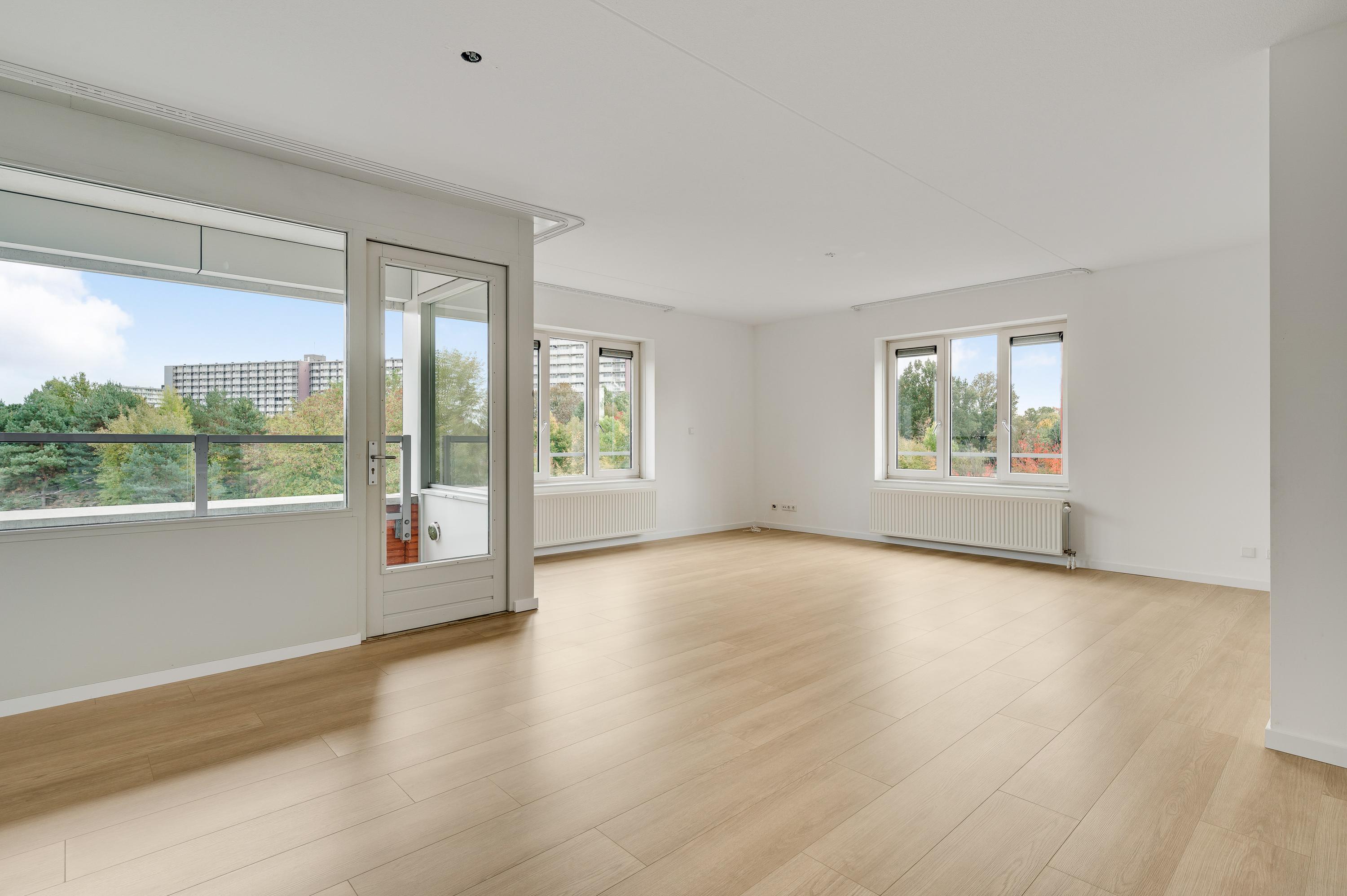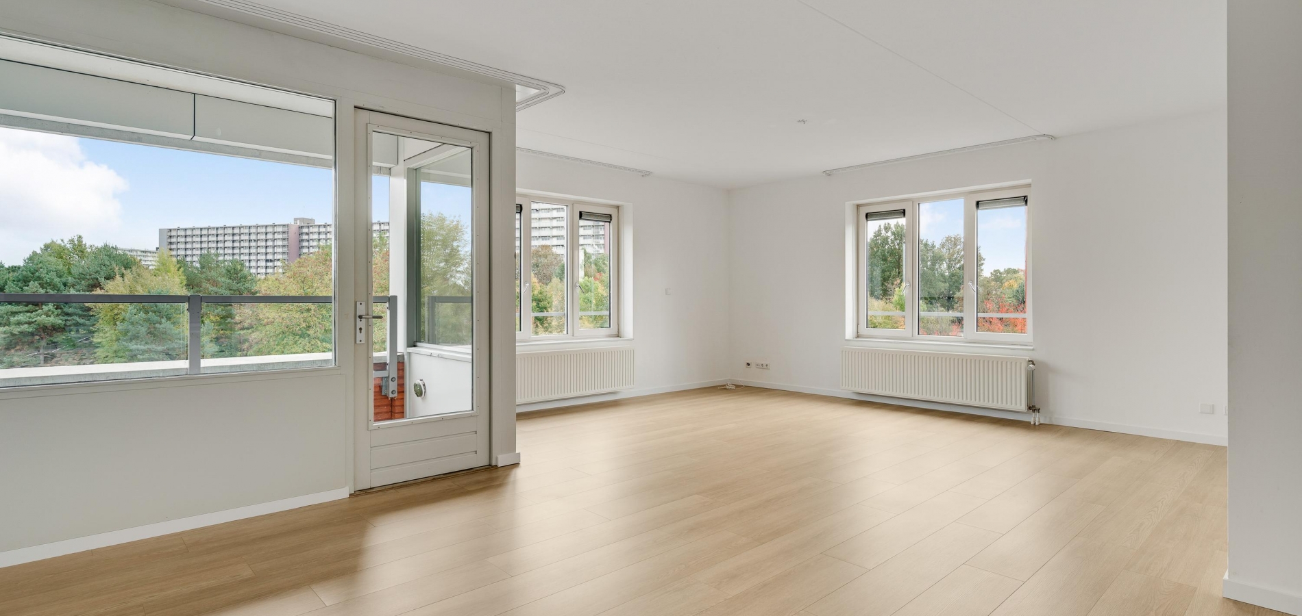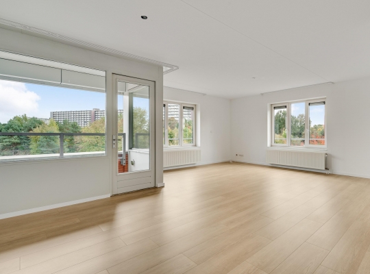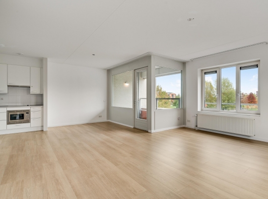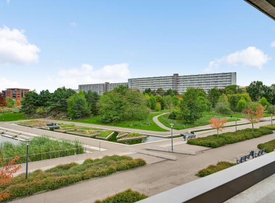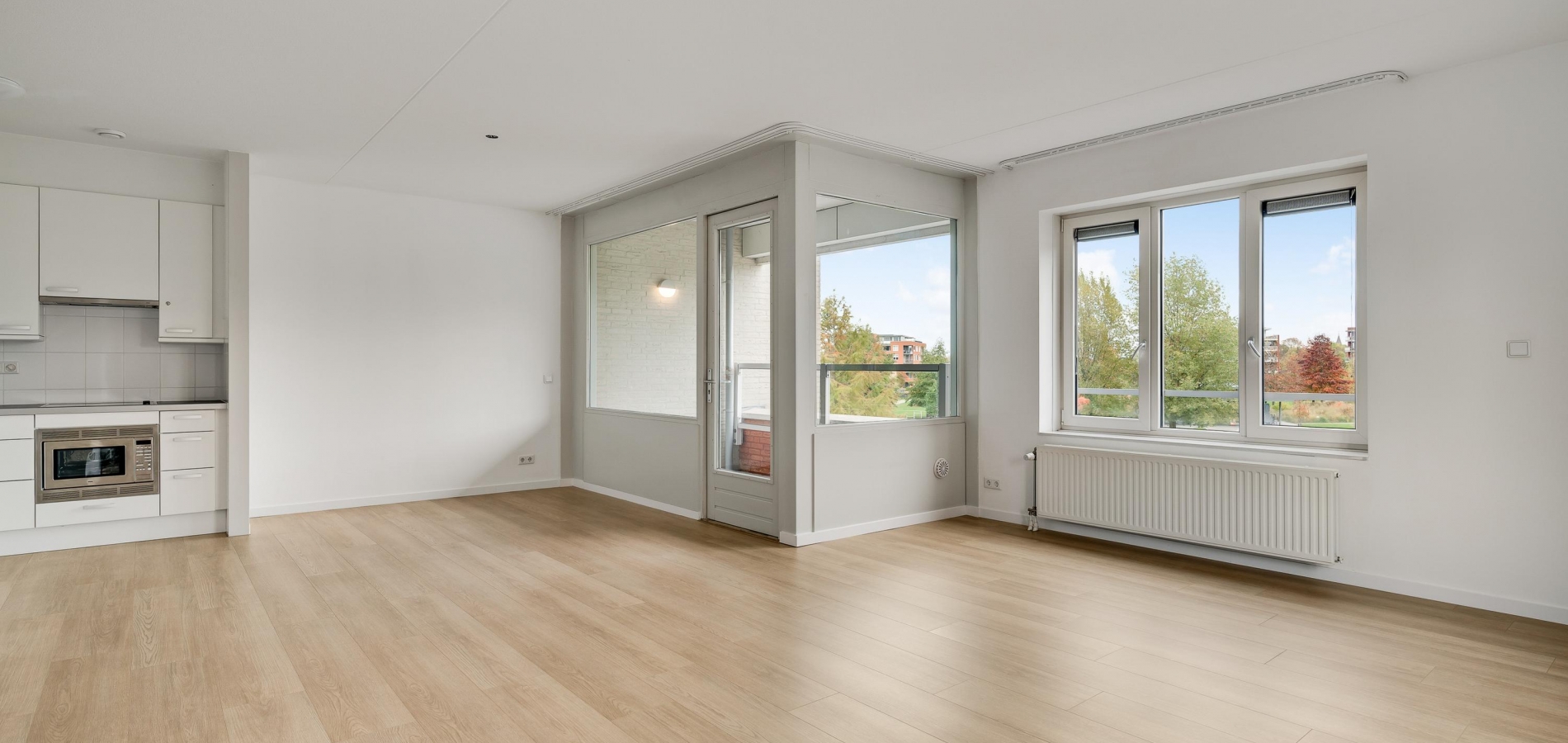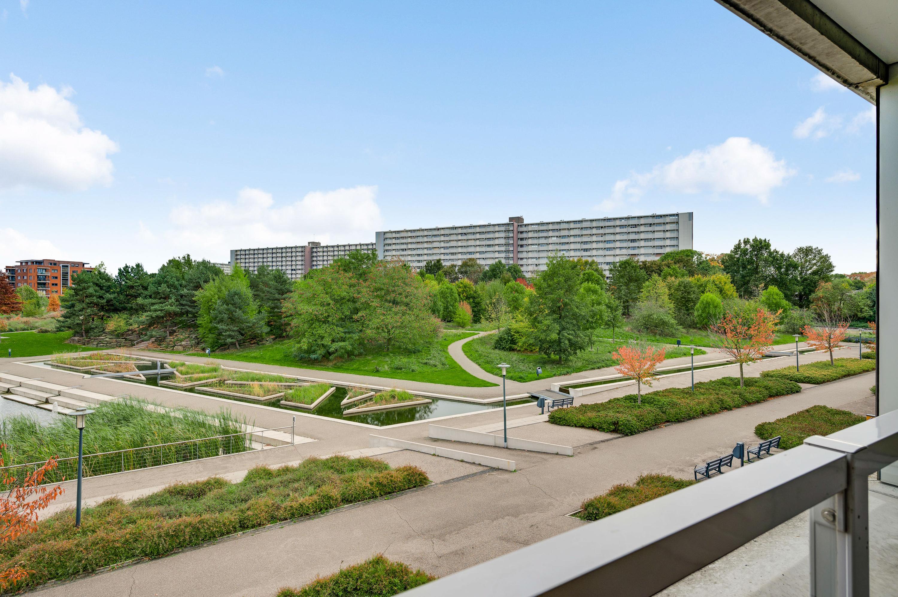 Het balkon (circa 3,12 x 1,75) is een fijne plek om buiten te zitten. Het uitzicht is fraai, onder andere naar de parkachtige omgeving met vijver.