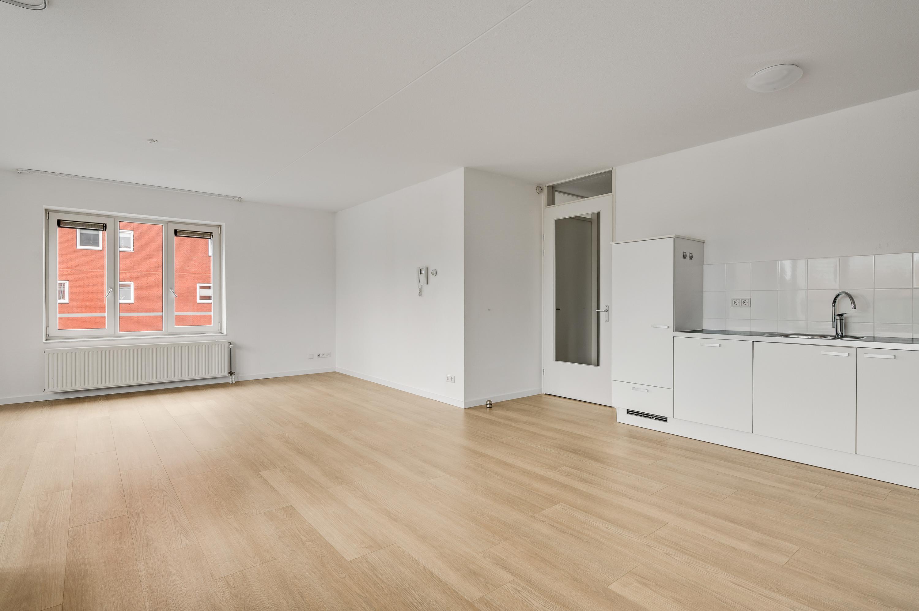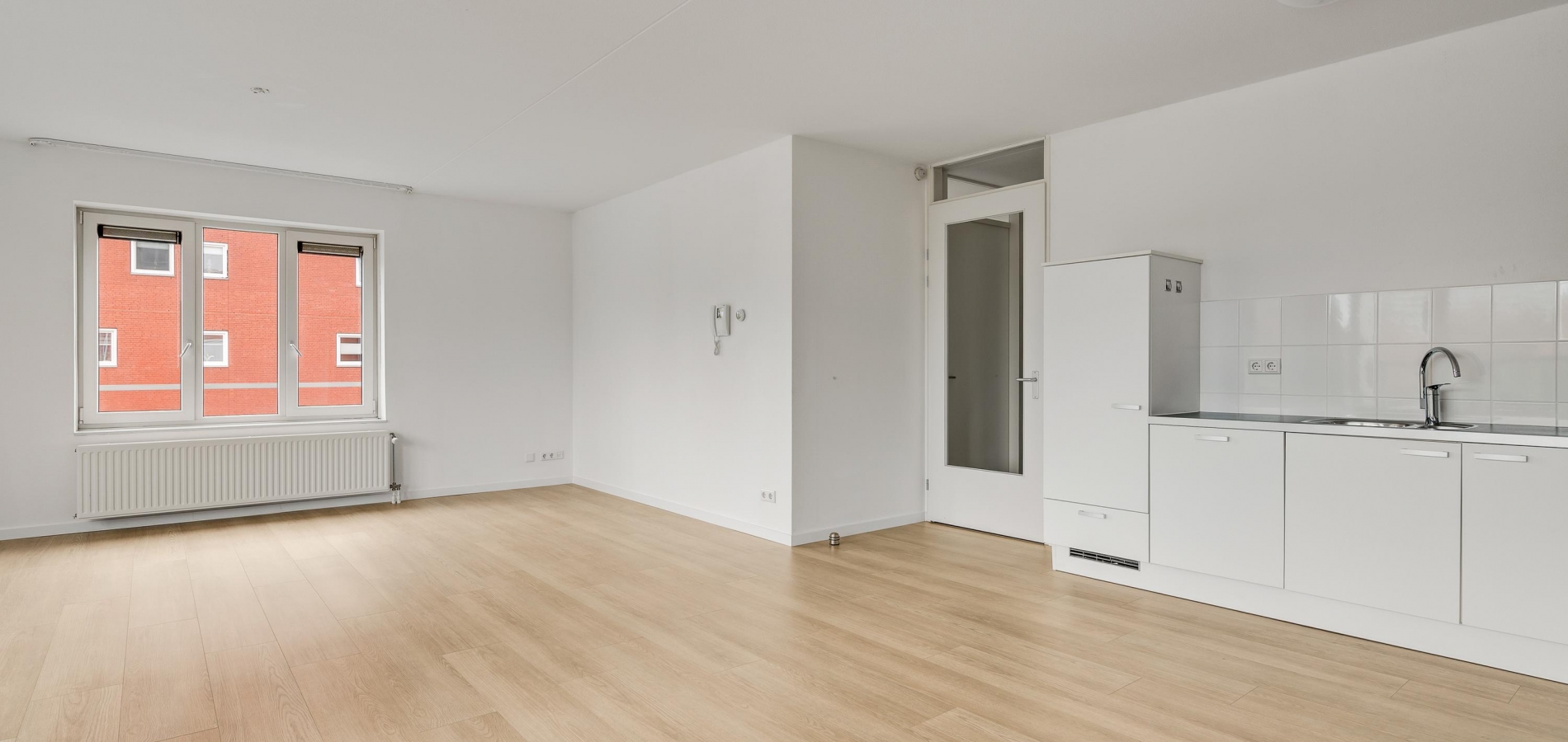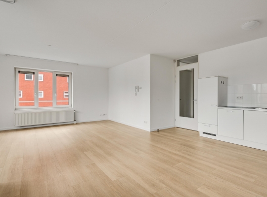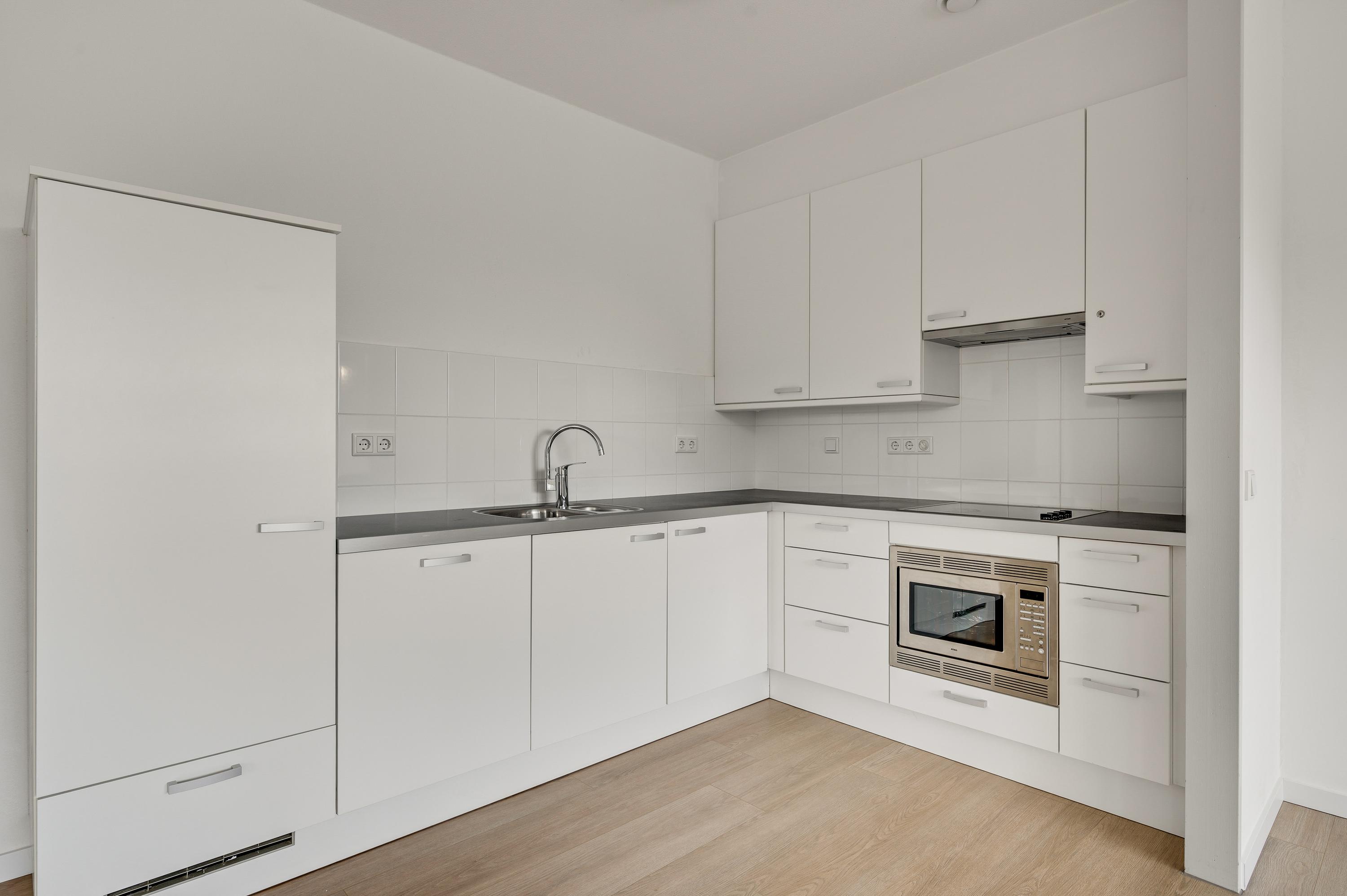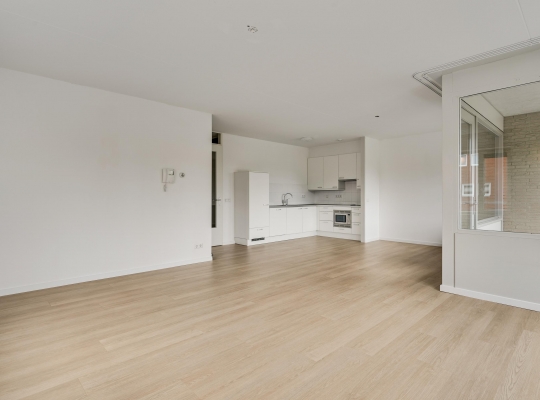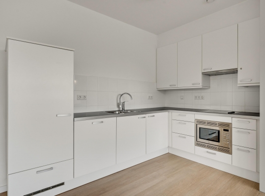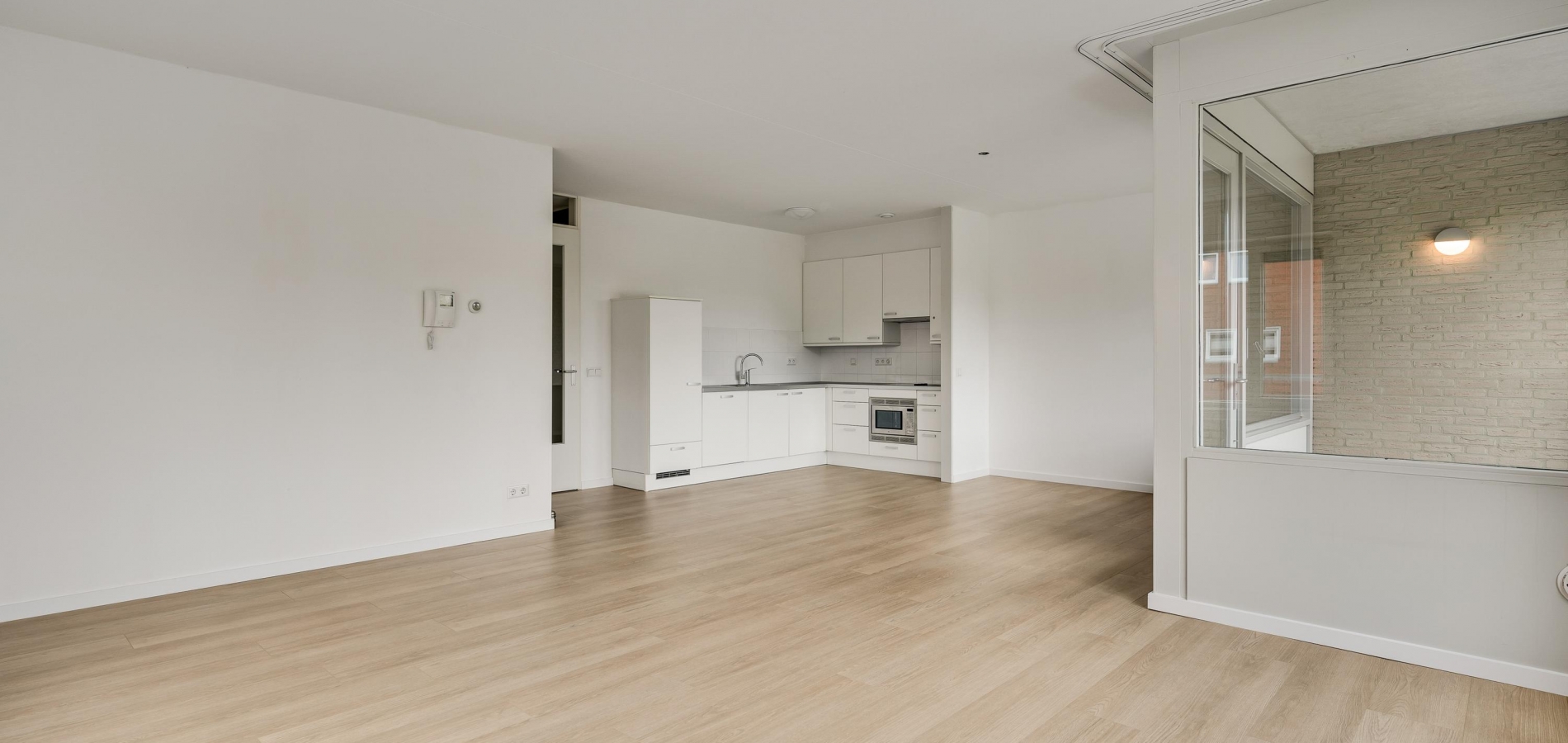 De woonkamer (circa 5,37 x 4,38) is een goed in te delen leefruimte met lichtinval vanaf twee kanten. Omdat de eettafel in de keuken kan staan, kunt u de woonkamer geheel als zitkamer indelen. In de keuken (circa 4,88 x 3,12) staat een hoekopstelling met een kookplaat, afzuigkap, combimagnetron, vaatwasser en een koelkast. Naast de keuken is een berging/provisieruimte (circa 2,46 x 2,05) met de verwarmings- en ventilatieunit.