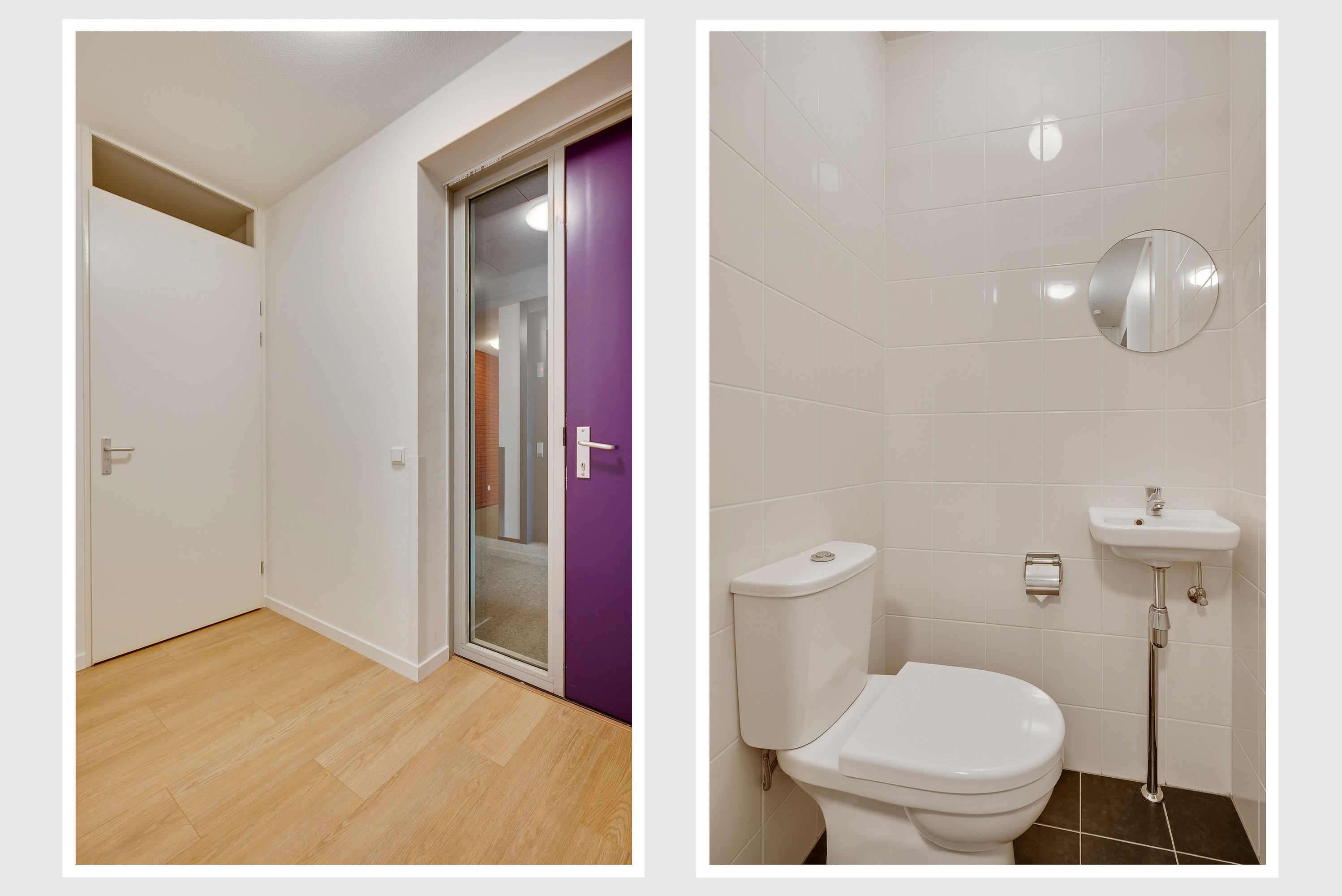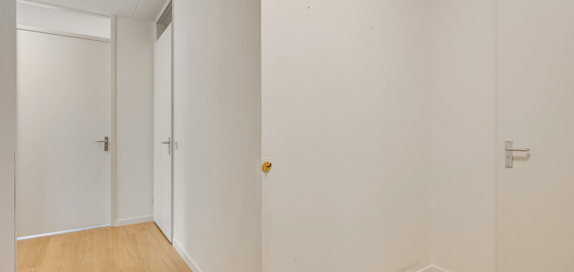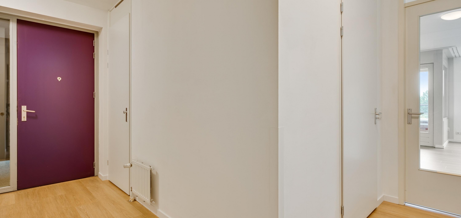 Of u nu met de trap of lift naar boven bent gegaan, de voordeur van dit gelijkvloerse appartement is binnen handbereik. In de ruime hal zijn de meterkast en de toiletruimte met fonteintje. De mooie laminaatvloer ligt niet alleen in de hal, maar in bijna het hele appartement.