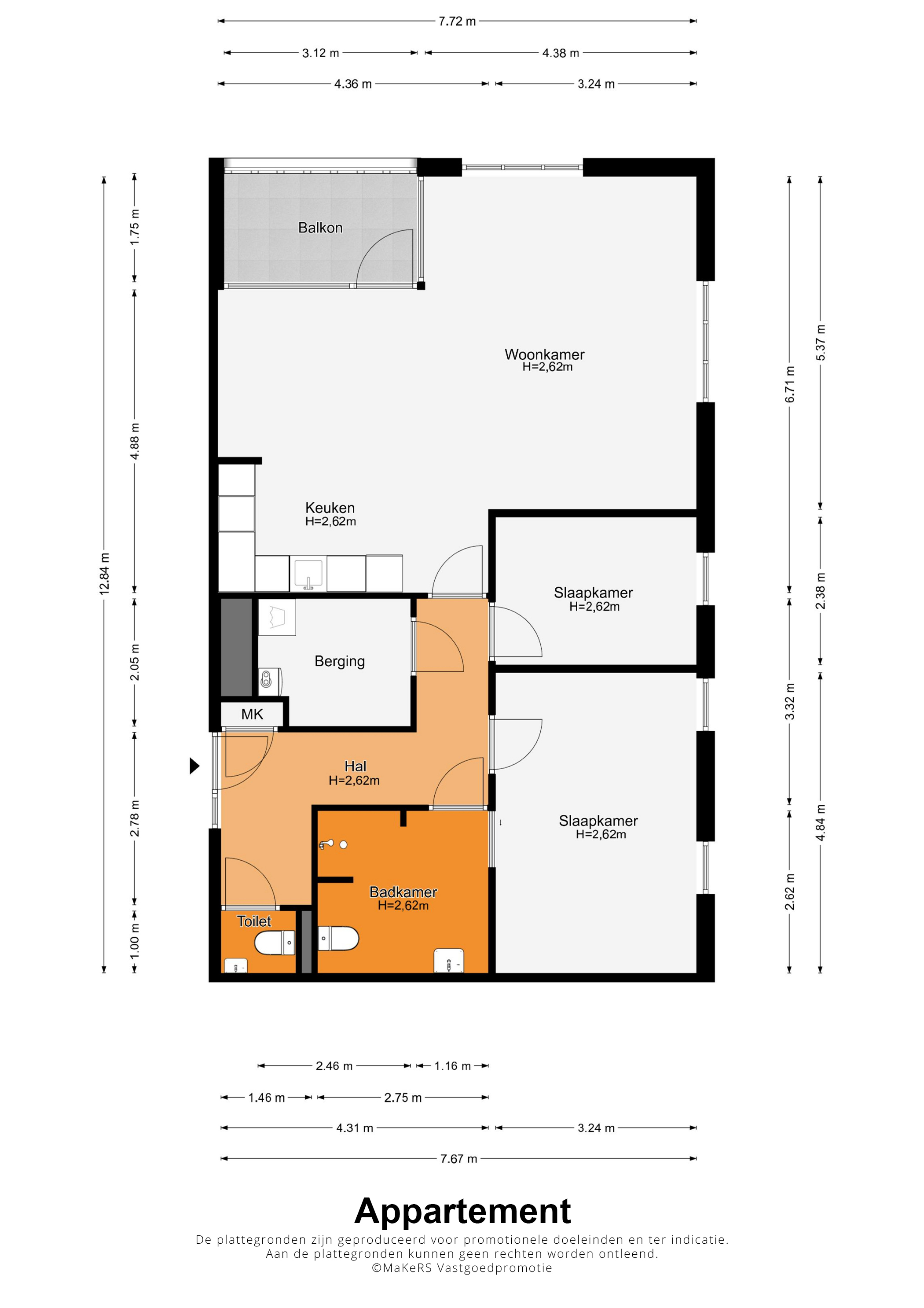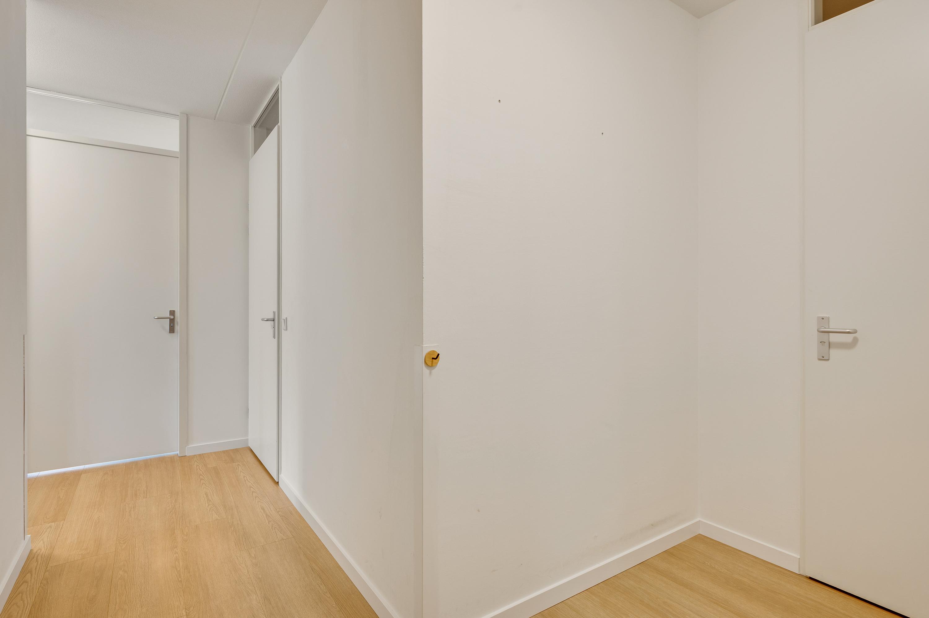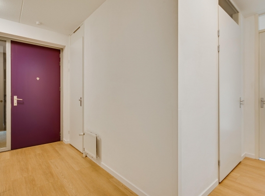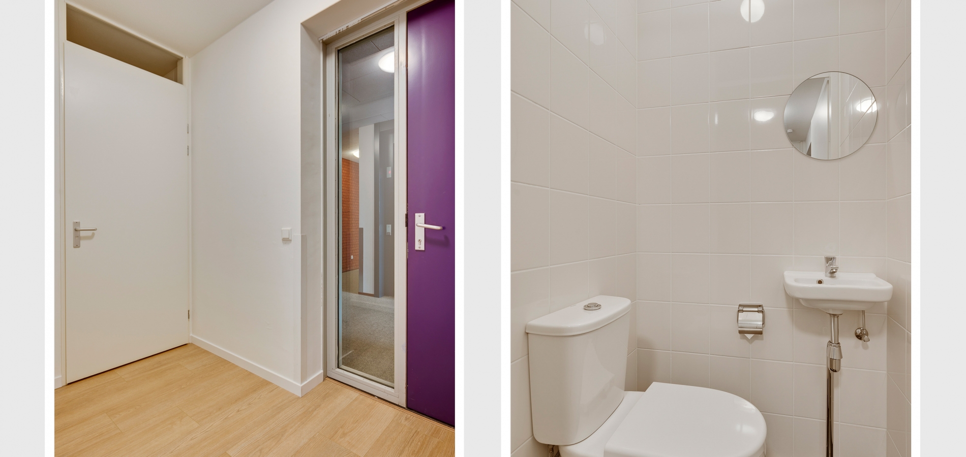 Of u nu met de trap of lift naar boven bent gegaan, de voordeur van dit gelijkvloerse appartement is binnen handbereik. In de ruime hal zijn de meterkast en de toiletruimte met fonteintje. De mooie laminaatvloer ligt niet alleen in de hal, maar in bijna het hele appartement.