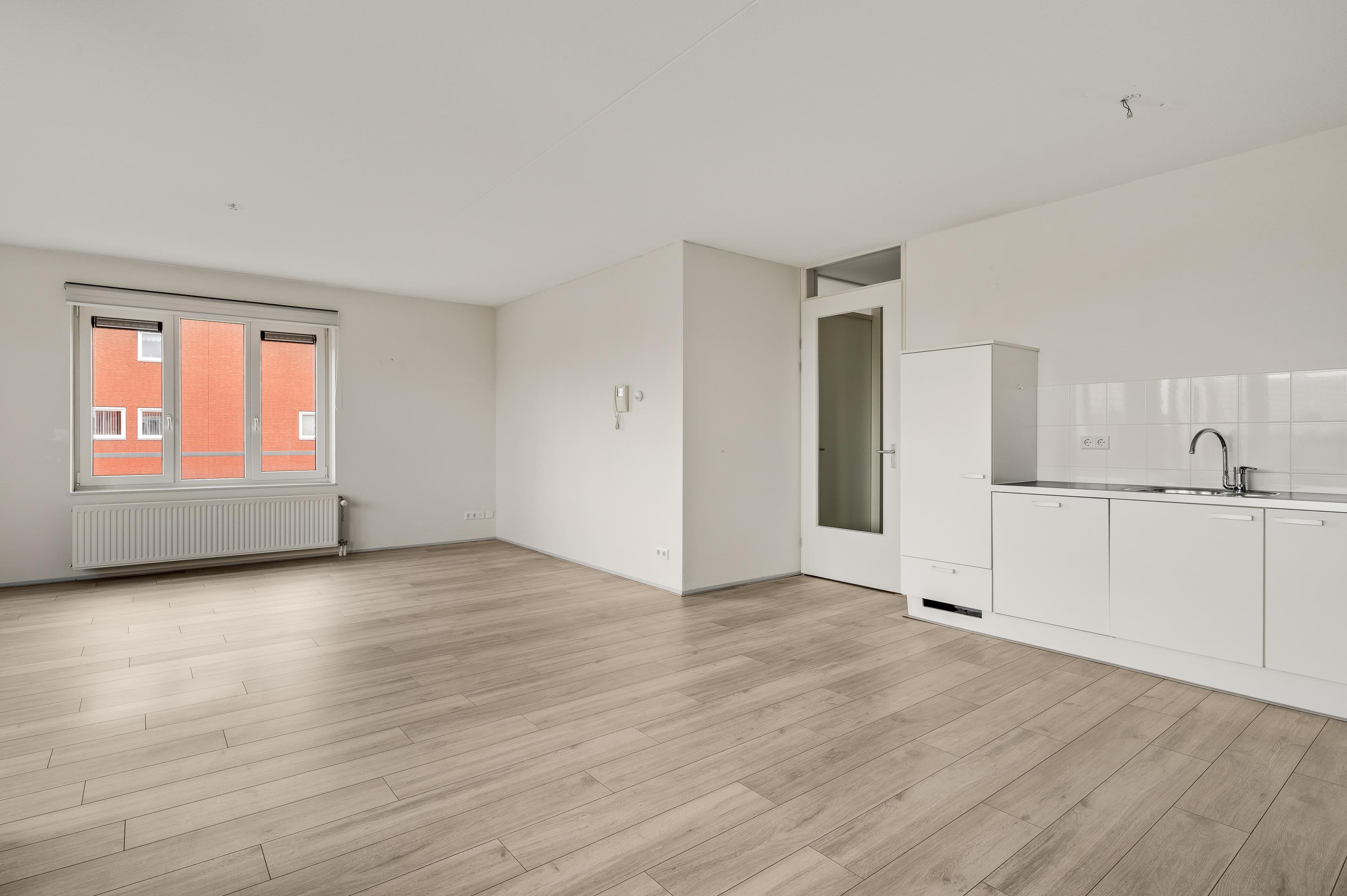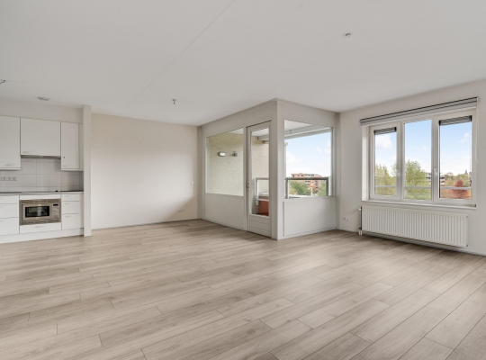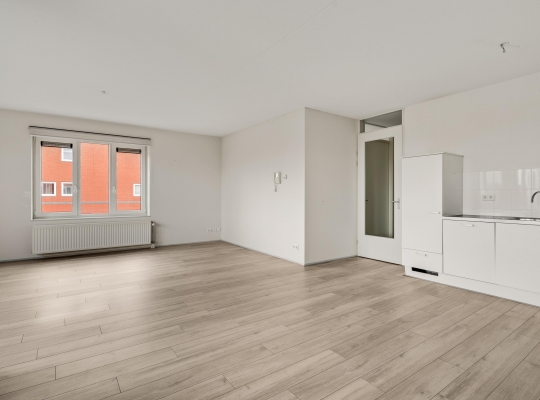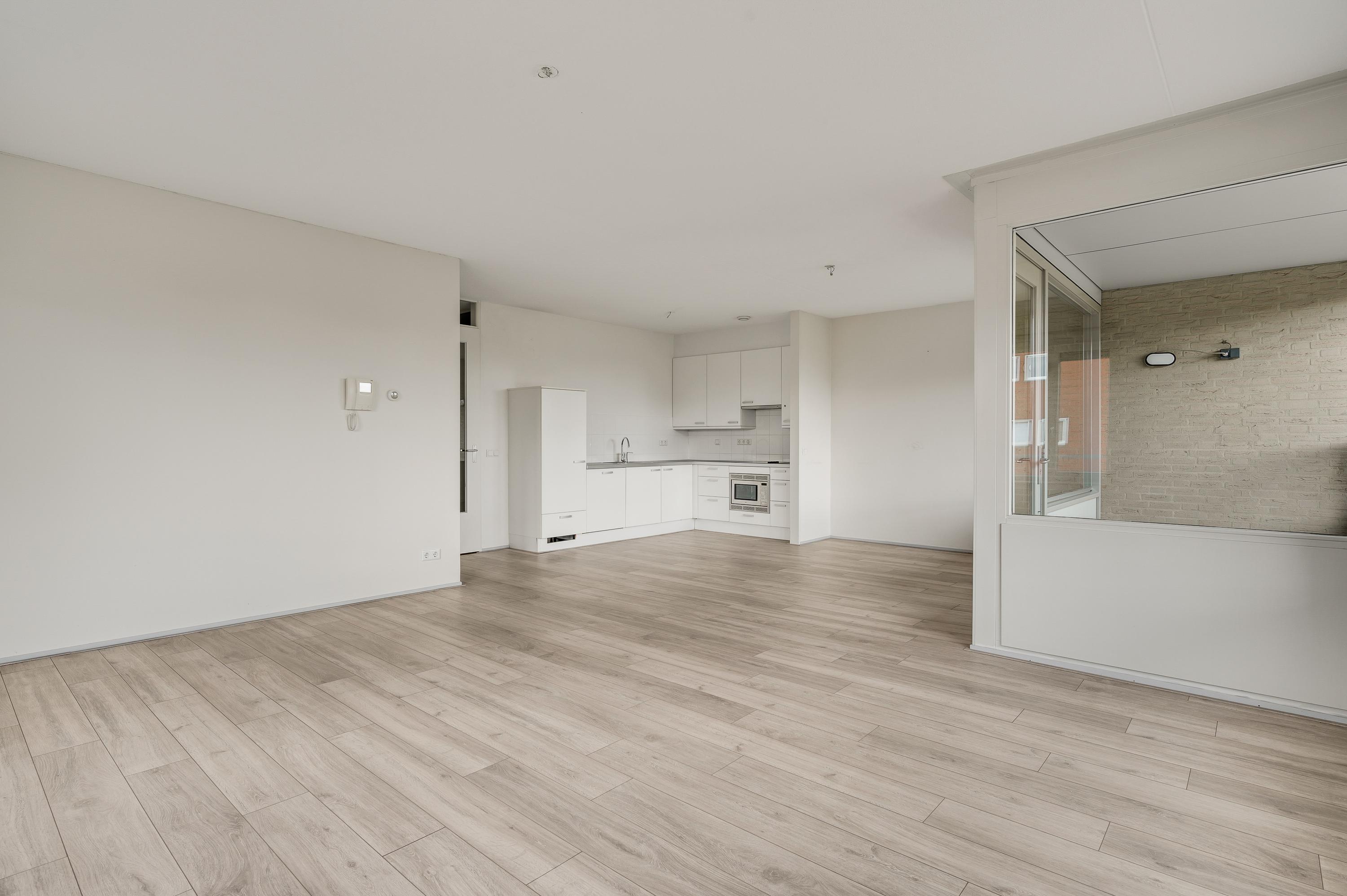De woonkamer (circa 5,35 x 4,38) is een goed in te delen leefruimte met lichtinval vanaf twee kanten. Omdat de eettafel in de keuken kan staan, kunt u de woonkamer geheel als zitkamer indelen. In de keuken (circa 4,88 x 3,12) staat een hoekopstelling met een kookplaat, afzuigkap, combimagnetron, vaatwasser en een koelkast. Naast de keuken is een berging/provisieruimte (circa 2,47 x 2,04) met de verwarmings- en ventilatieunit.