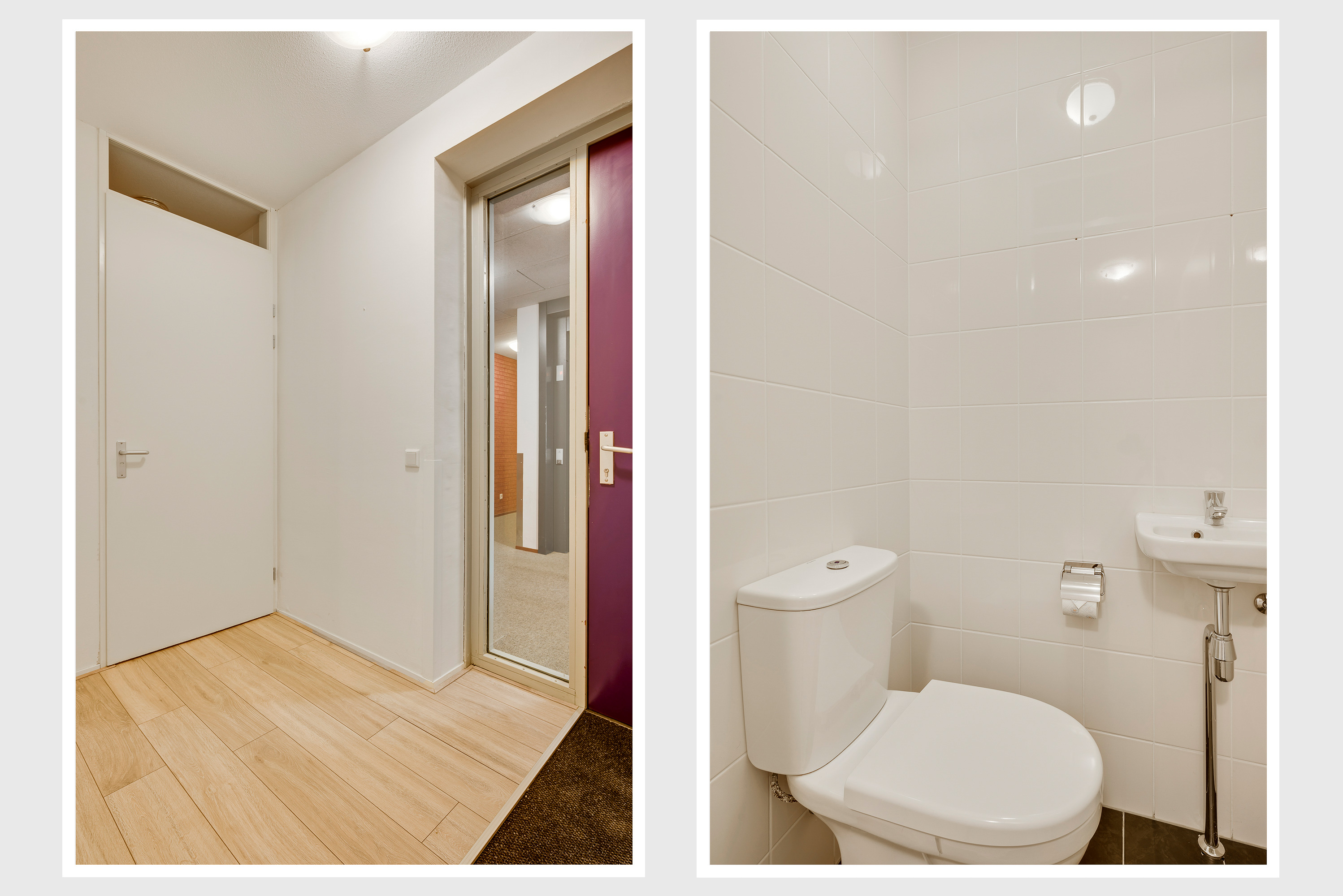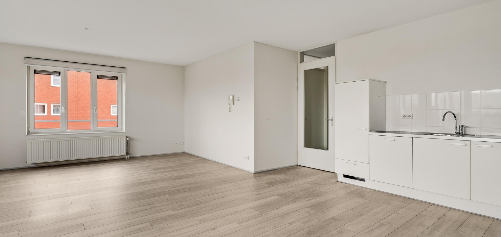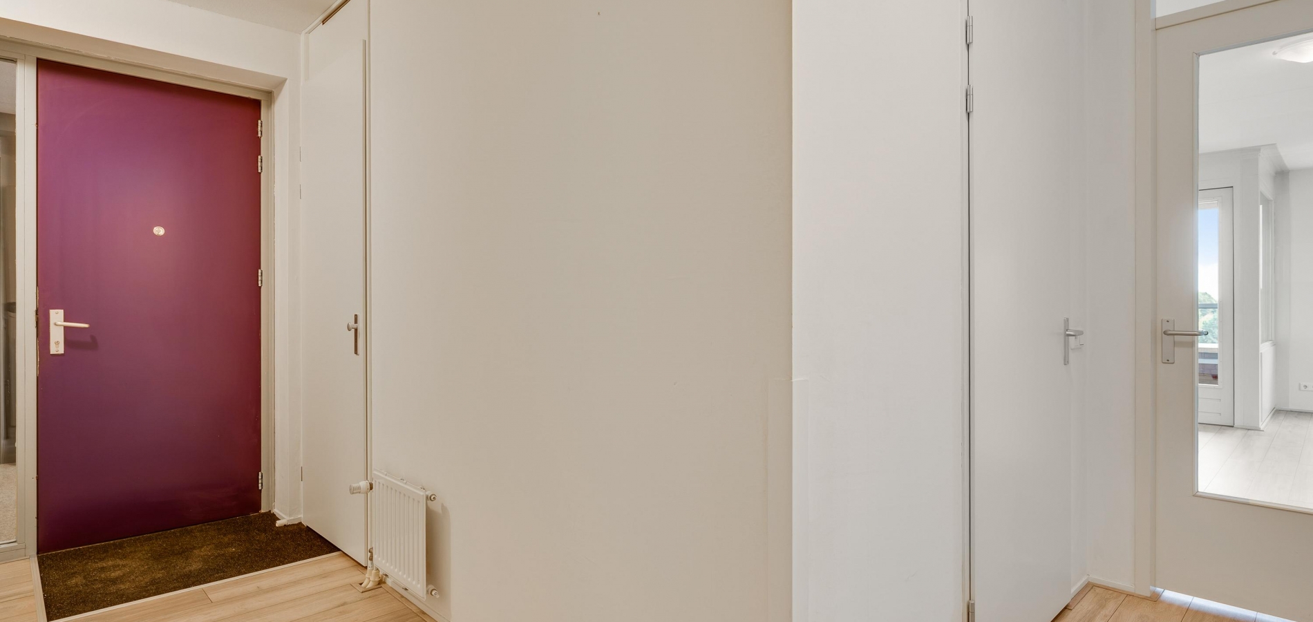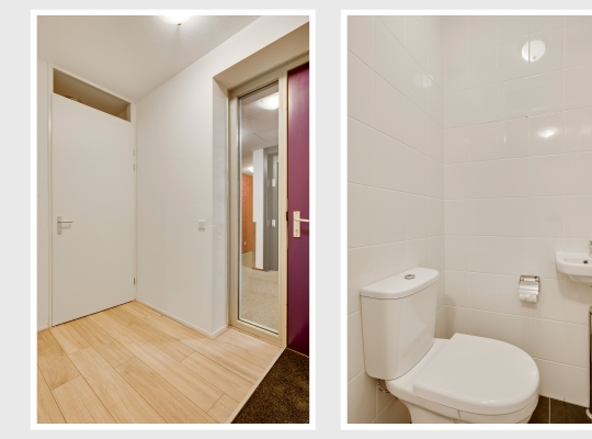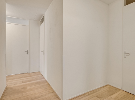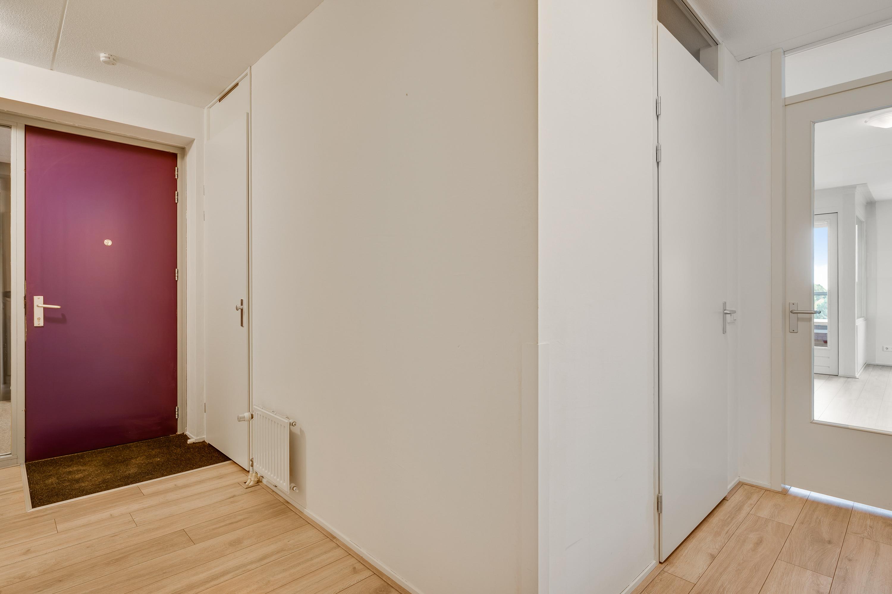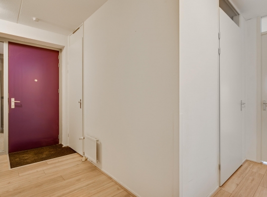 Of u nu met de trap of lift naar boven bent gegaan, de voordeur van dit gelijkvloerse appartement is binnen handbereik. In de ruime hal zijn de meterkast en de toiletruimte met fonteintje. De mooie laminaatvloer ligt niet alleen in de hal, maar in bijna het hele appartement.