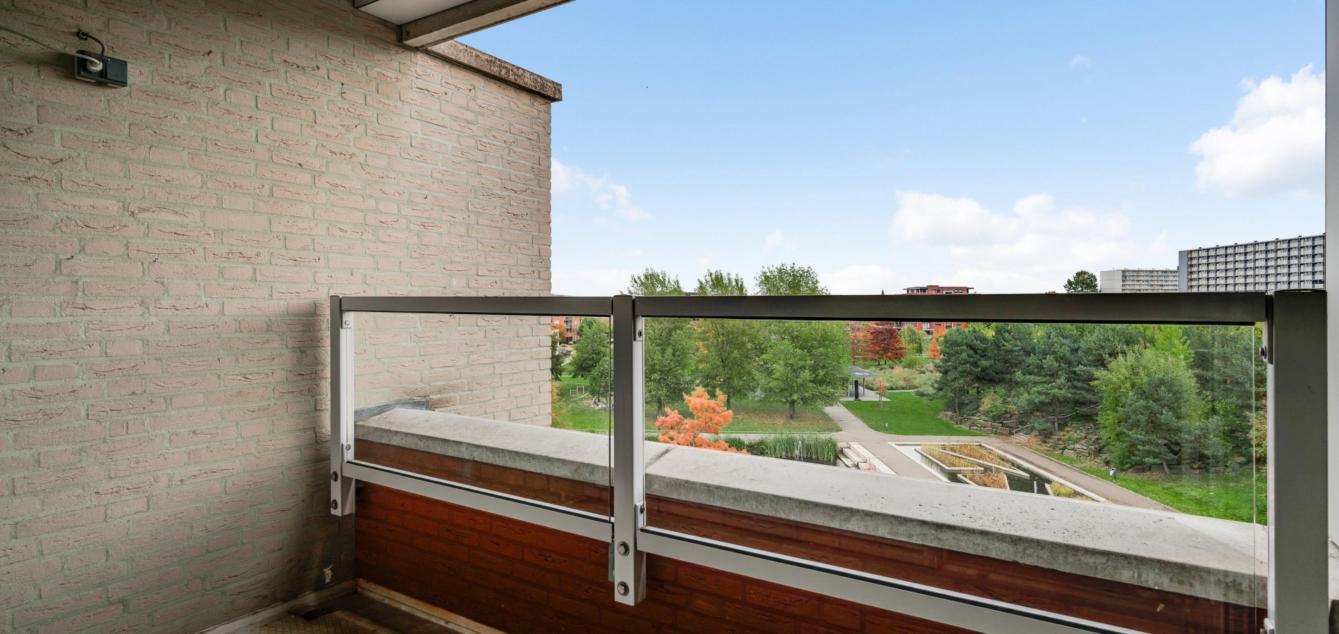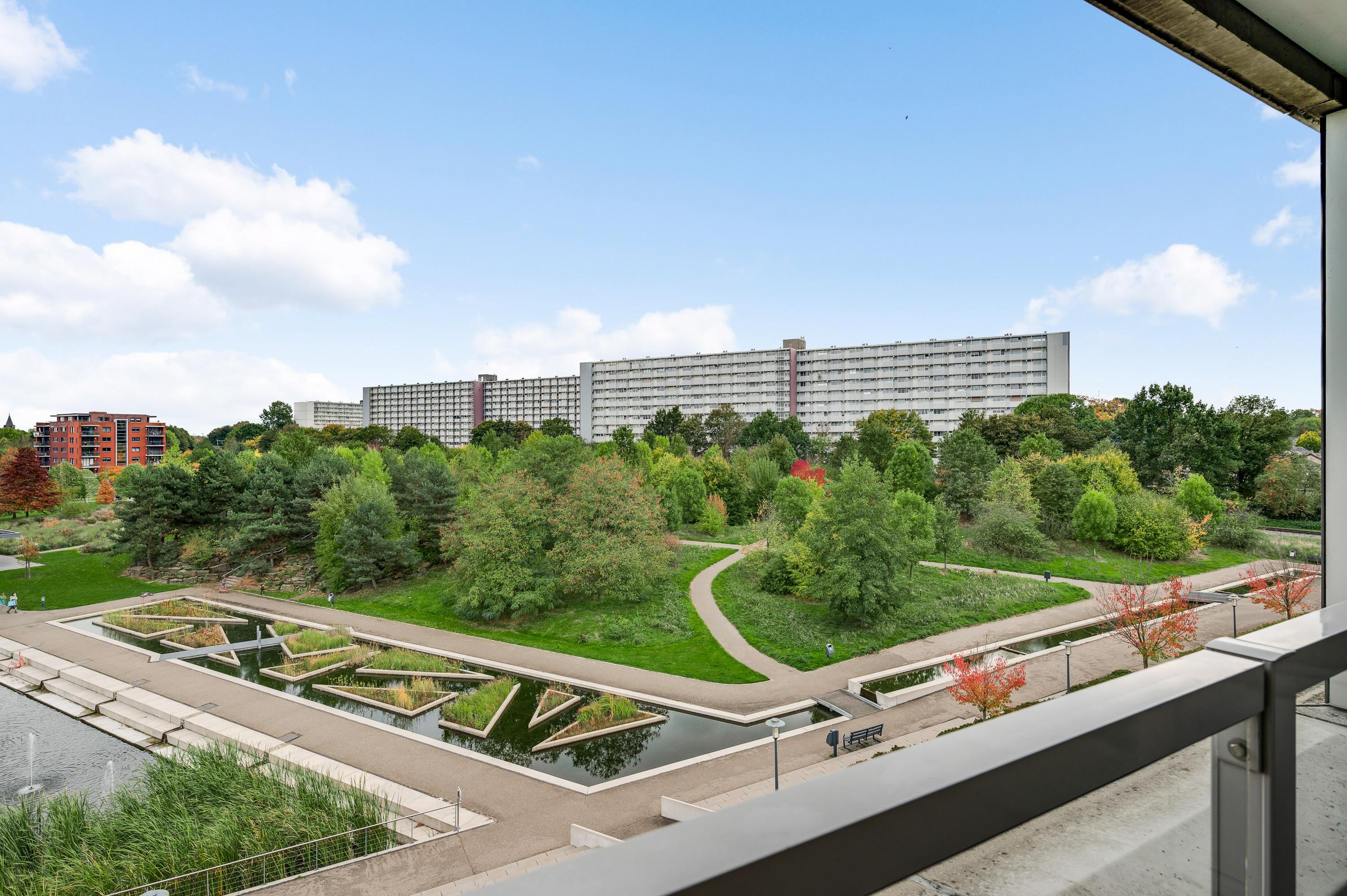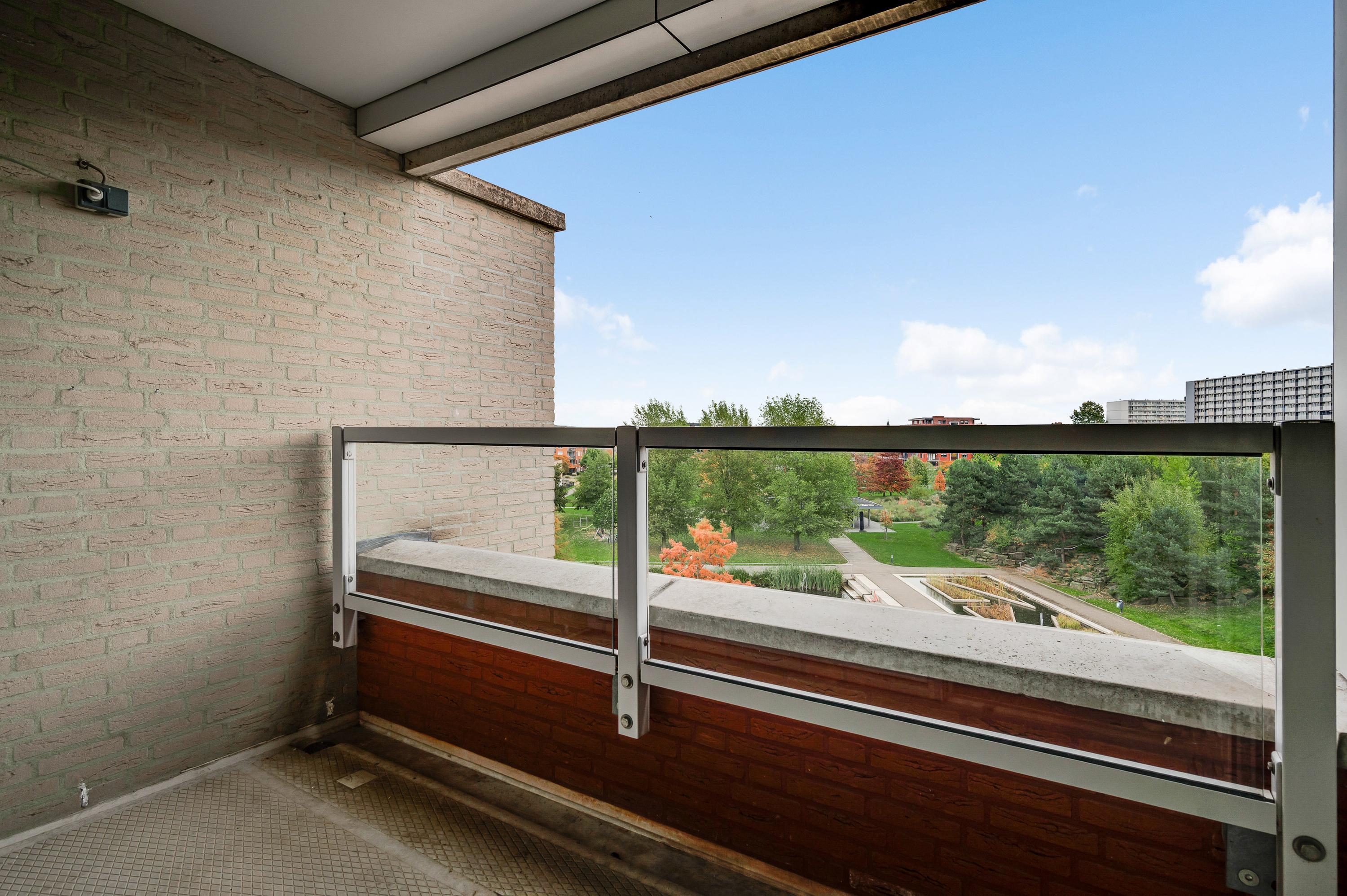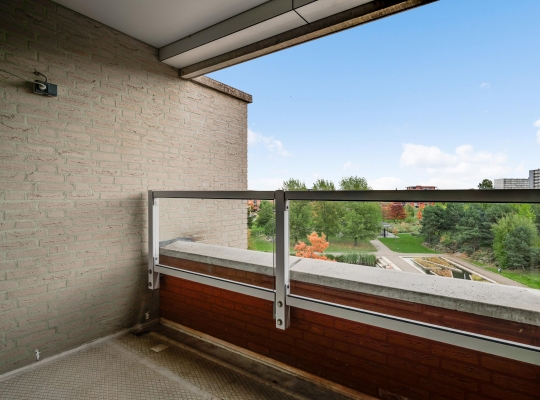 Het balkon (circa 3,12 x 1,75) is een fijne plek om buiten te zitten. Het uitzicht is fraai, onder andere naar de parkachtige omgeving met vijver.
