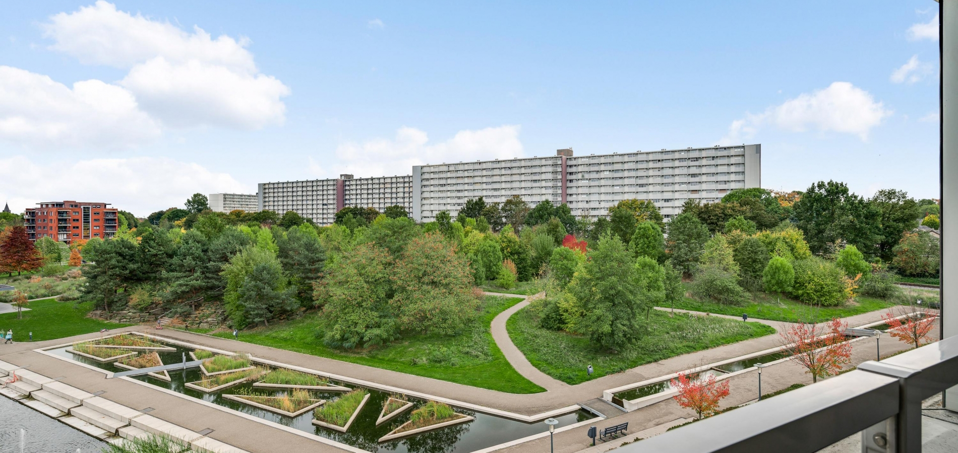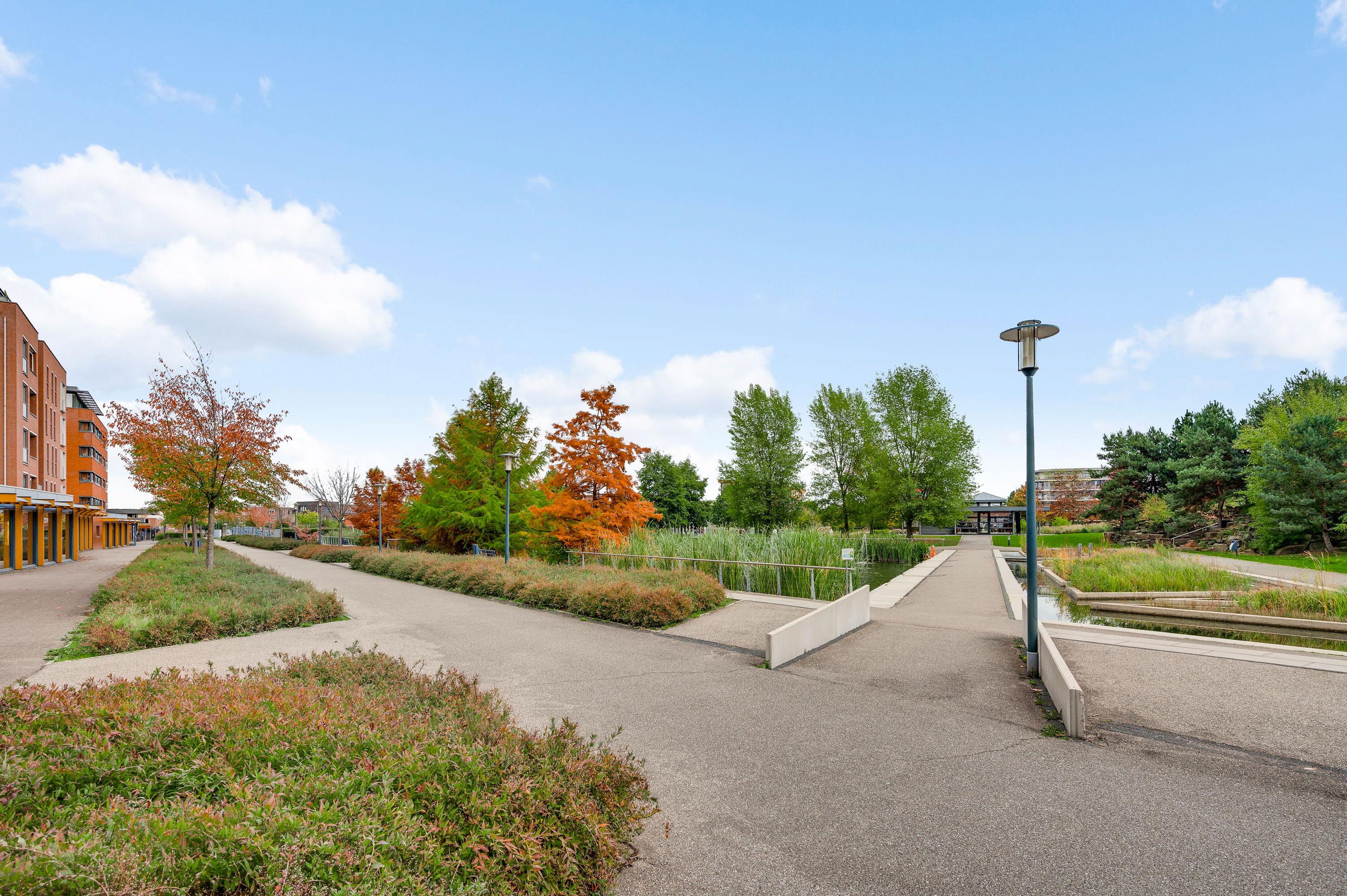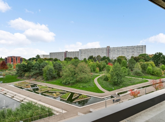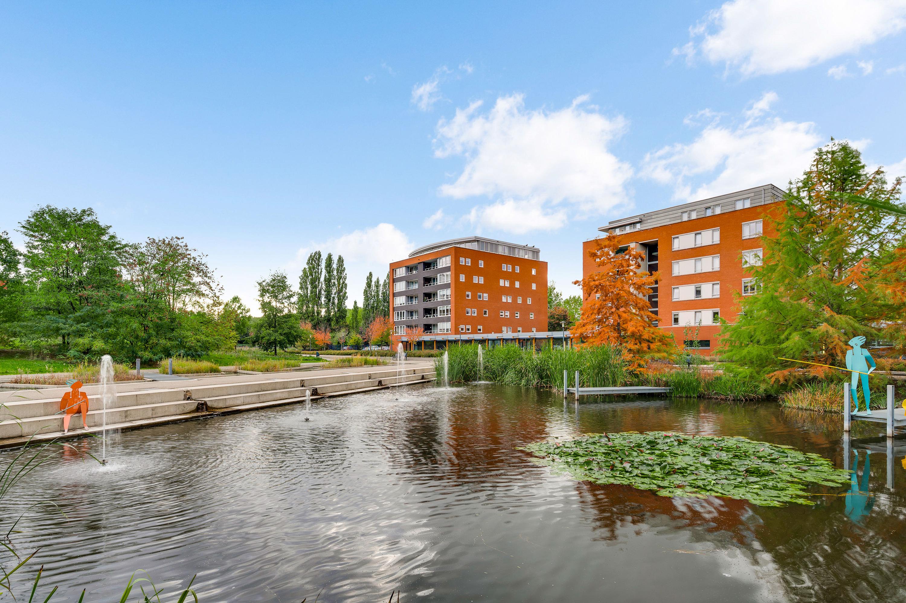 Het balkon (circa 3,12 x 1,75) is een fijne plek om buiten te zitten. Het uitzicht is fraai, onder andere naar de parkachtige omgeving met vijver.