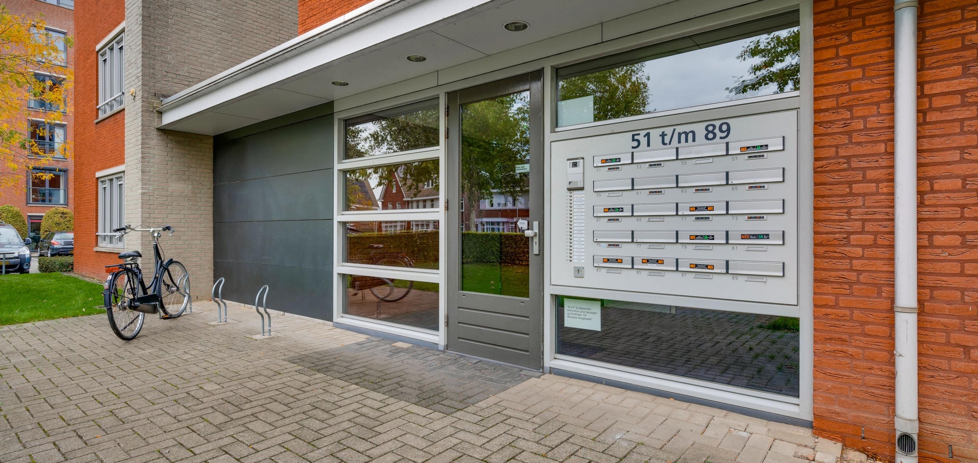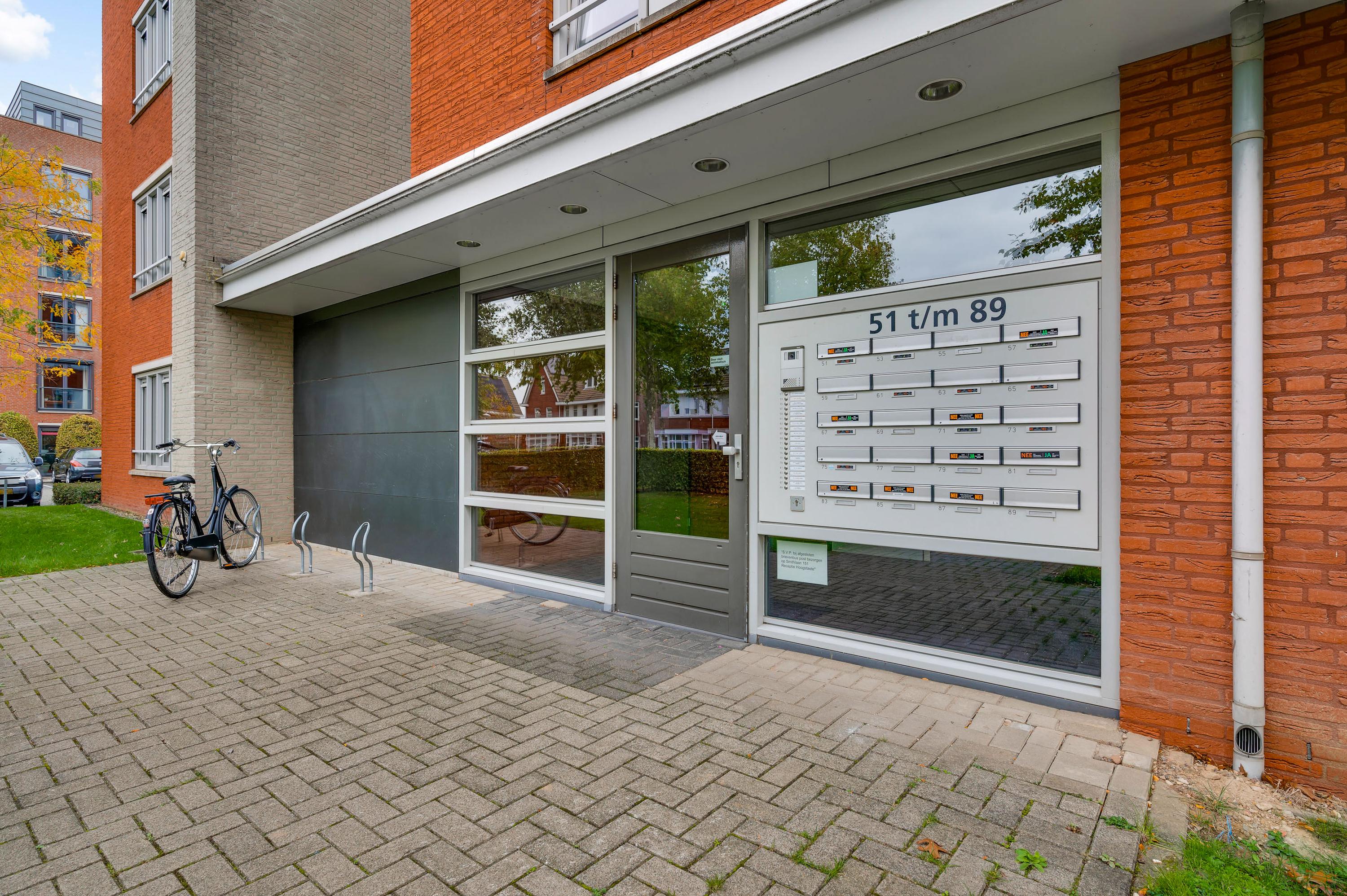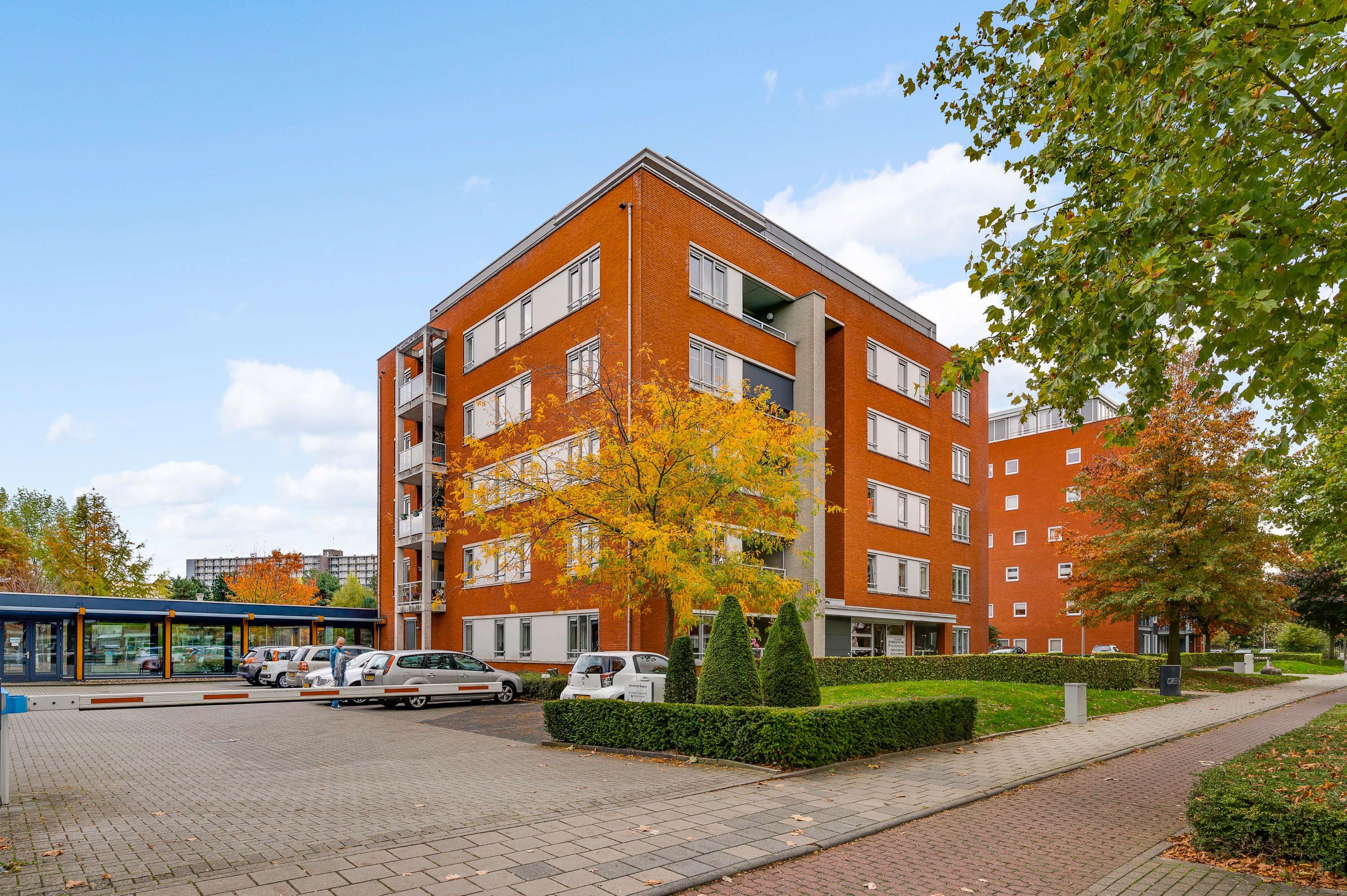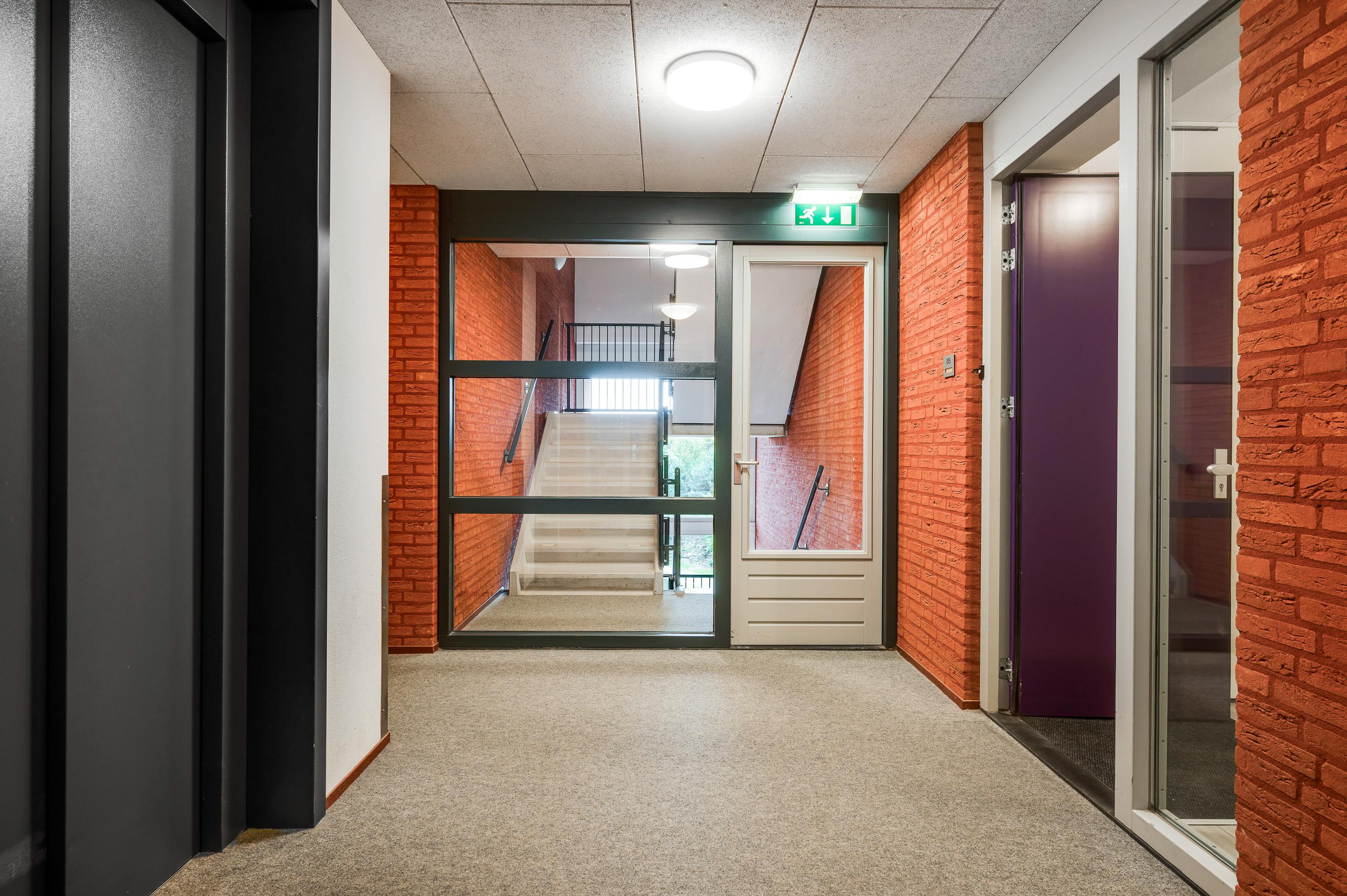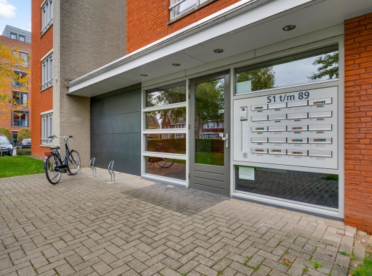 Bij de centrale entree zijn de brievenbussen, het bellentableau en de video-intercom. Eenmaal binnen kunt u met de trap of lift naar het appartement, gesitueerd op de vierde verdieping. Bij het appartement hoort een privéberging van circa 3,02 x 1,74 meter. Vlak naast het gebouw is een parkeerterrein, aan de straatzijde afgesloten met een slagboom.