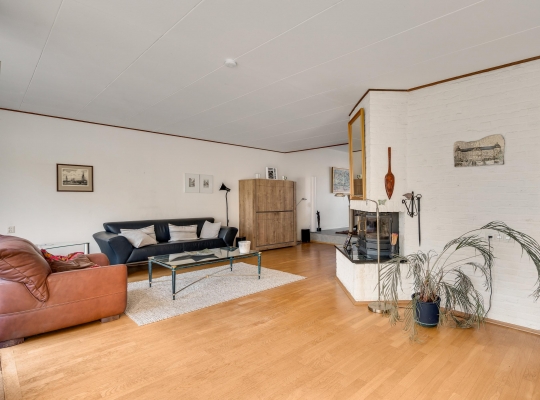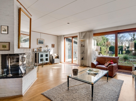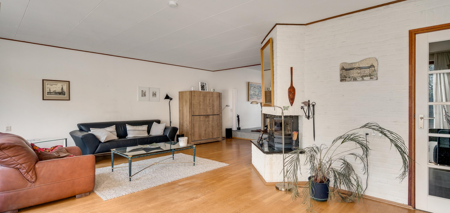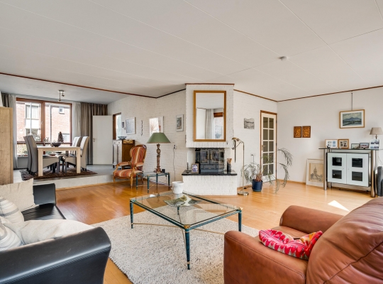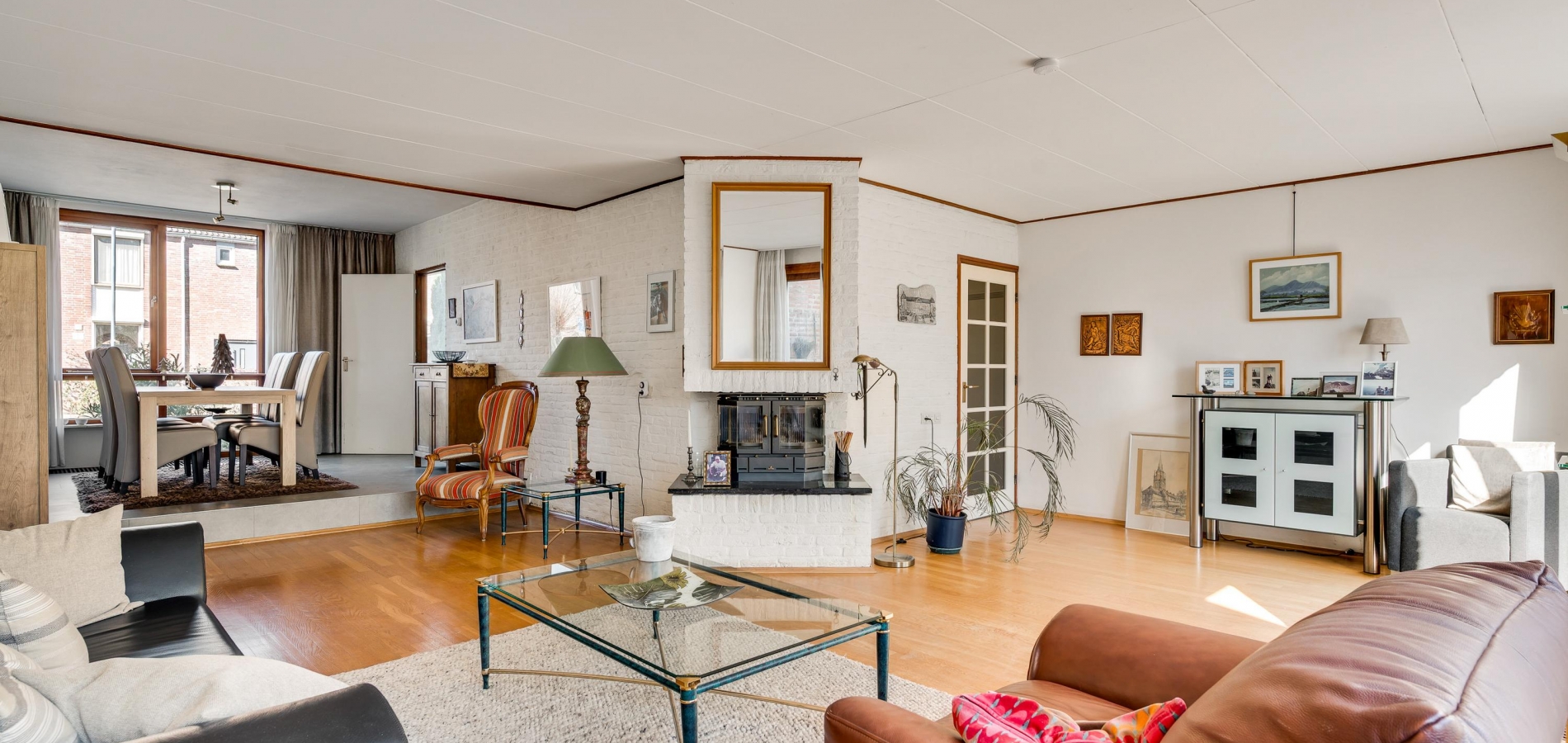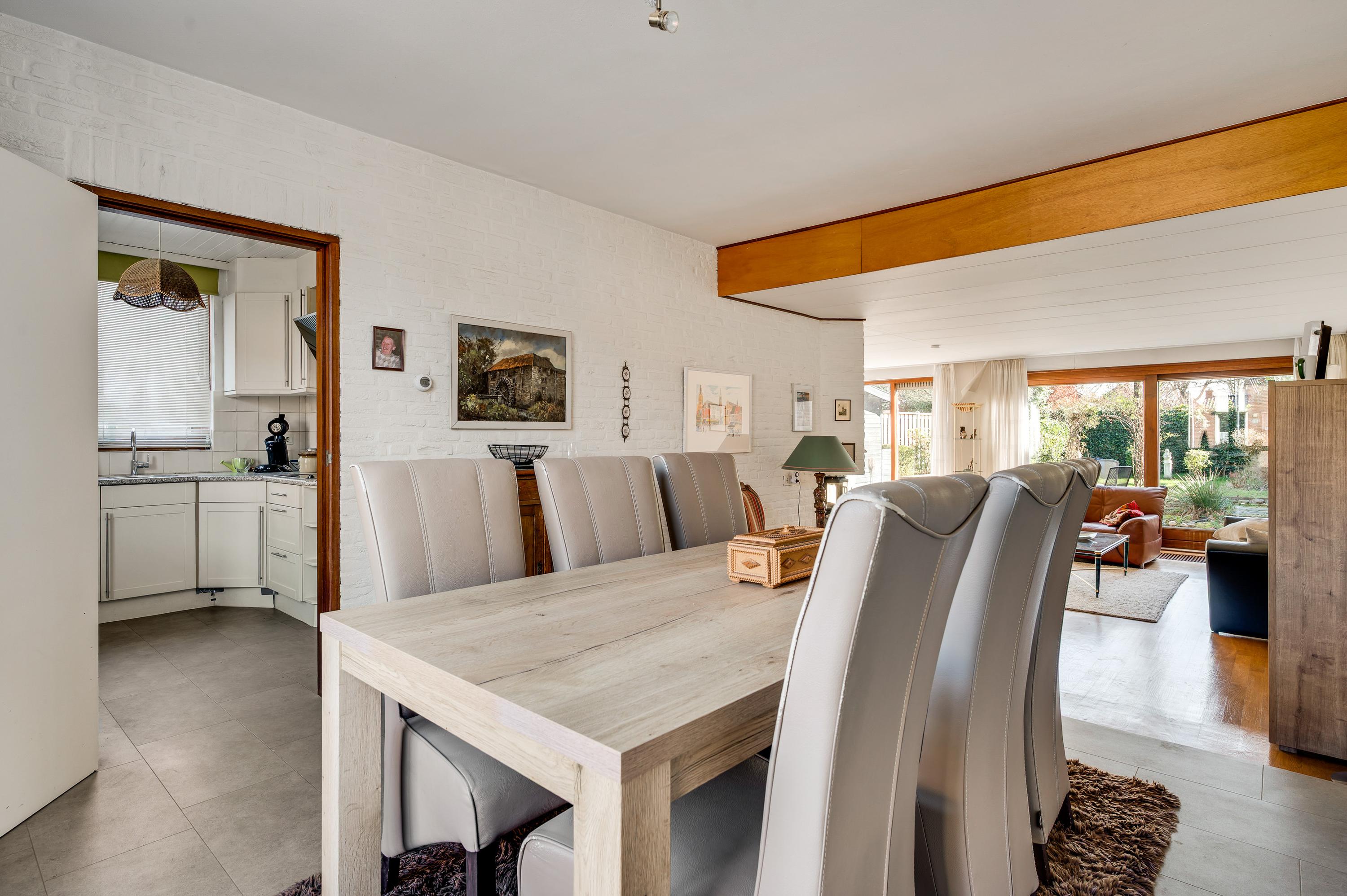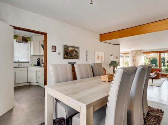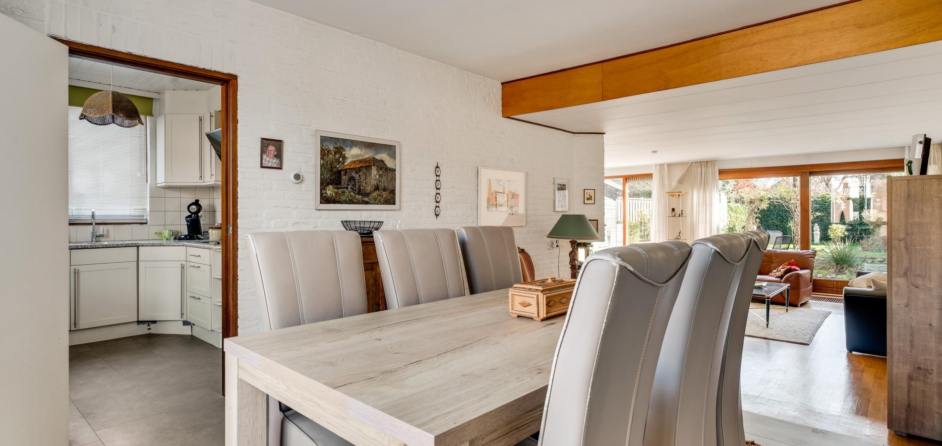 Vanuit de keuken is er toegang tot de eetkamer, die in open verbinding met de woonkamer staat. De totale oppervlakte is circa 48 m2, met een schuifpui en een inbouwhaard bij het zitgedeelte. Het niveauverschil tussen het zit- en het eetgedeelte is een subtiel detail, met parket bij het zitgedeelte en een tegelvloer bij het eetgedeelte.
