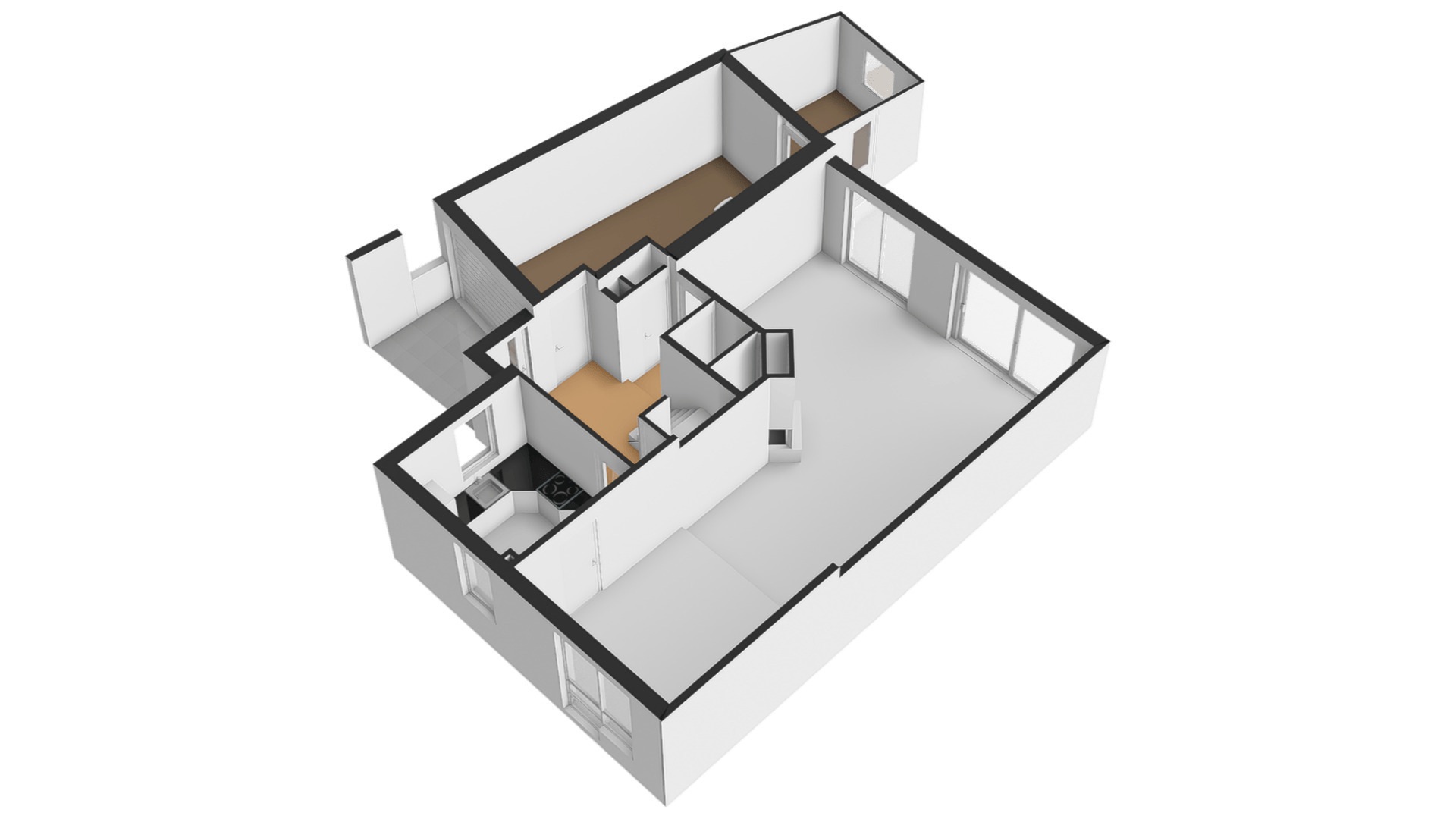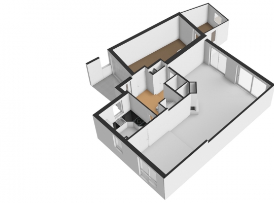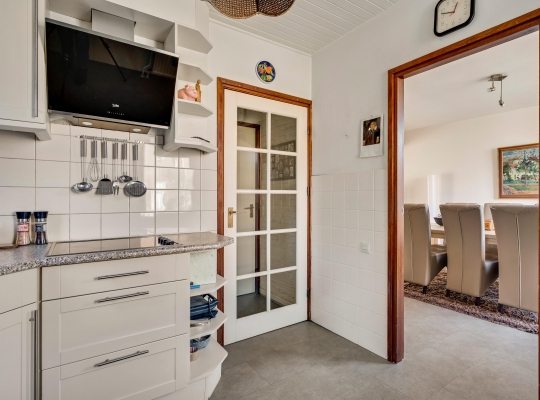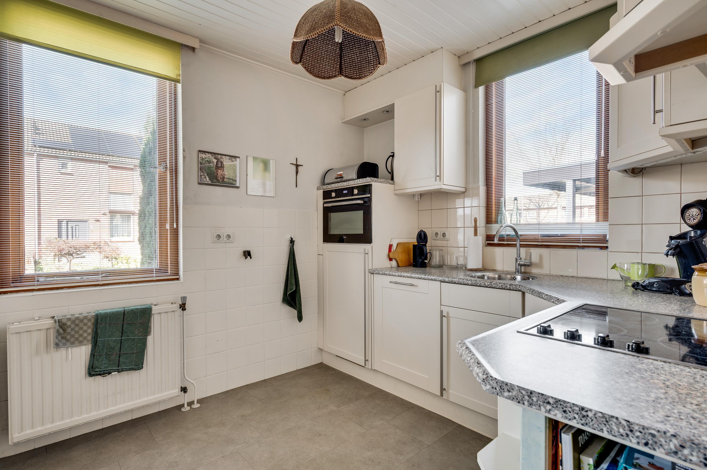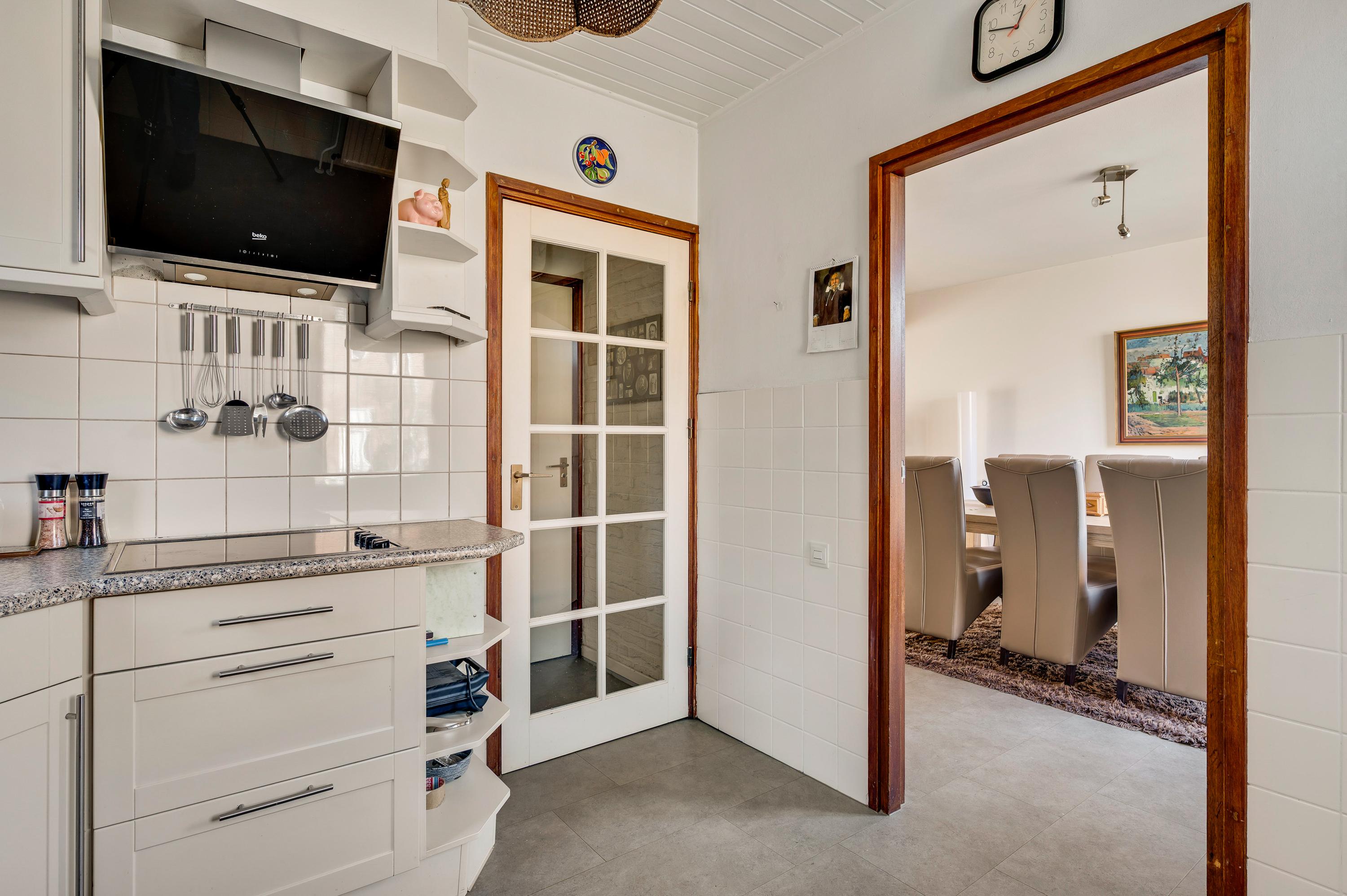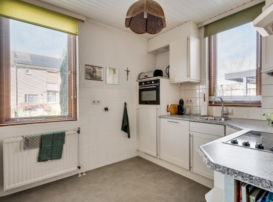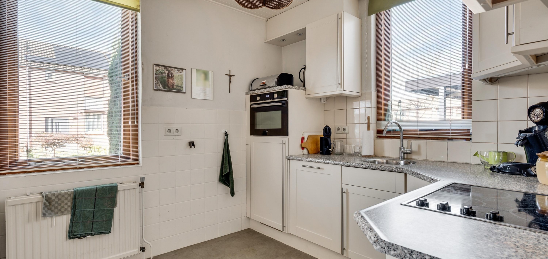 Aan de voorzijde is de dichte keuken (circa 2,89 x 2,81) met lichtinval vanaf twee kanten. De hoekopstelling is uitgevoerd met een granietlook aanrechtblad en de keramische kookplaat, afzuigkap, oven, vaatwasser en koelkast zijn ingebouwd.