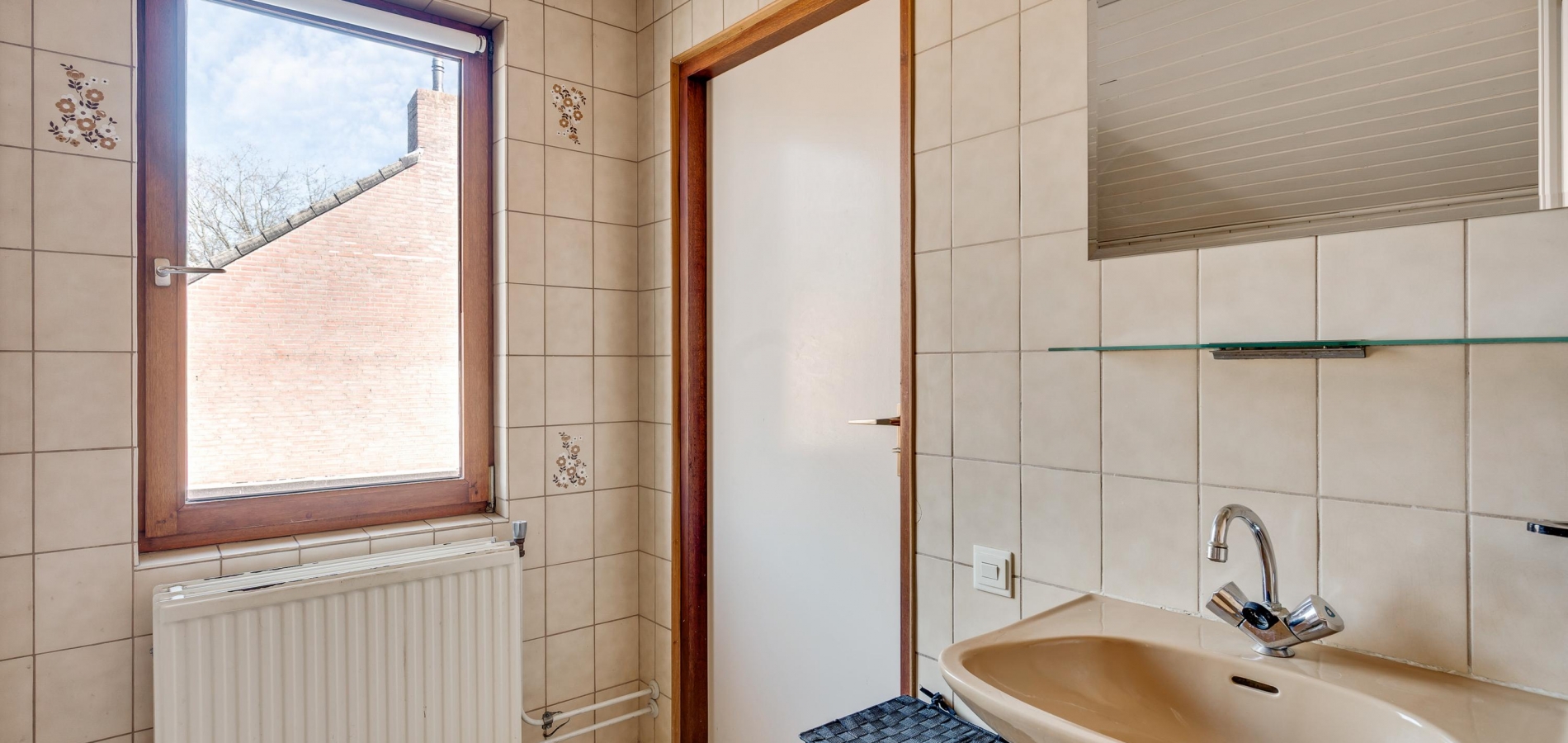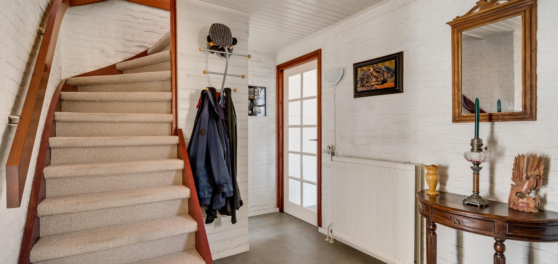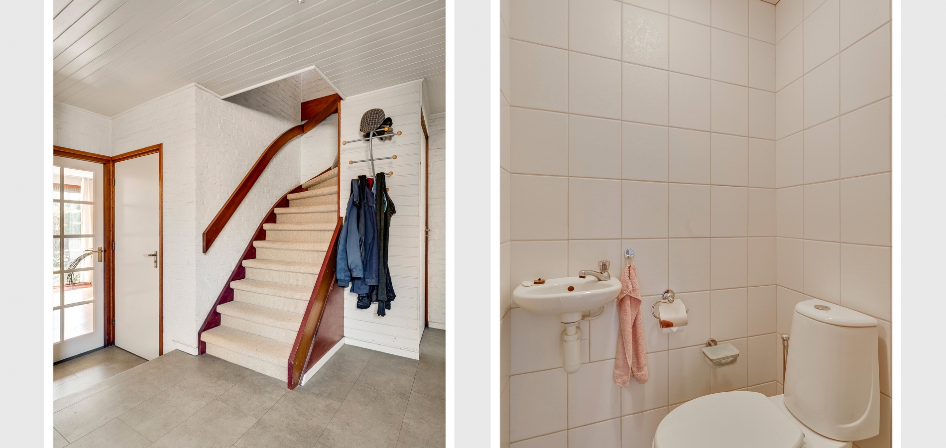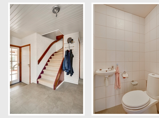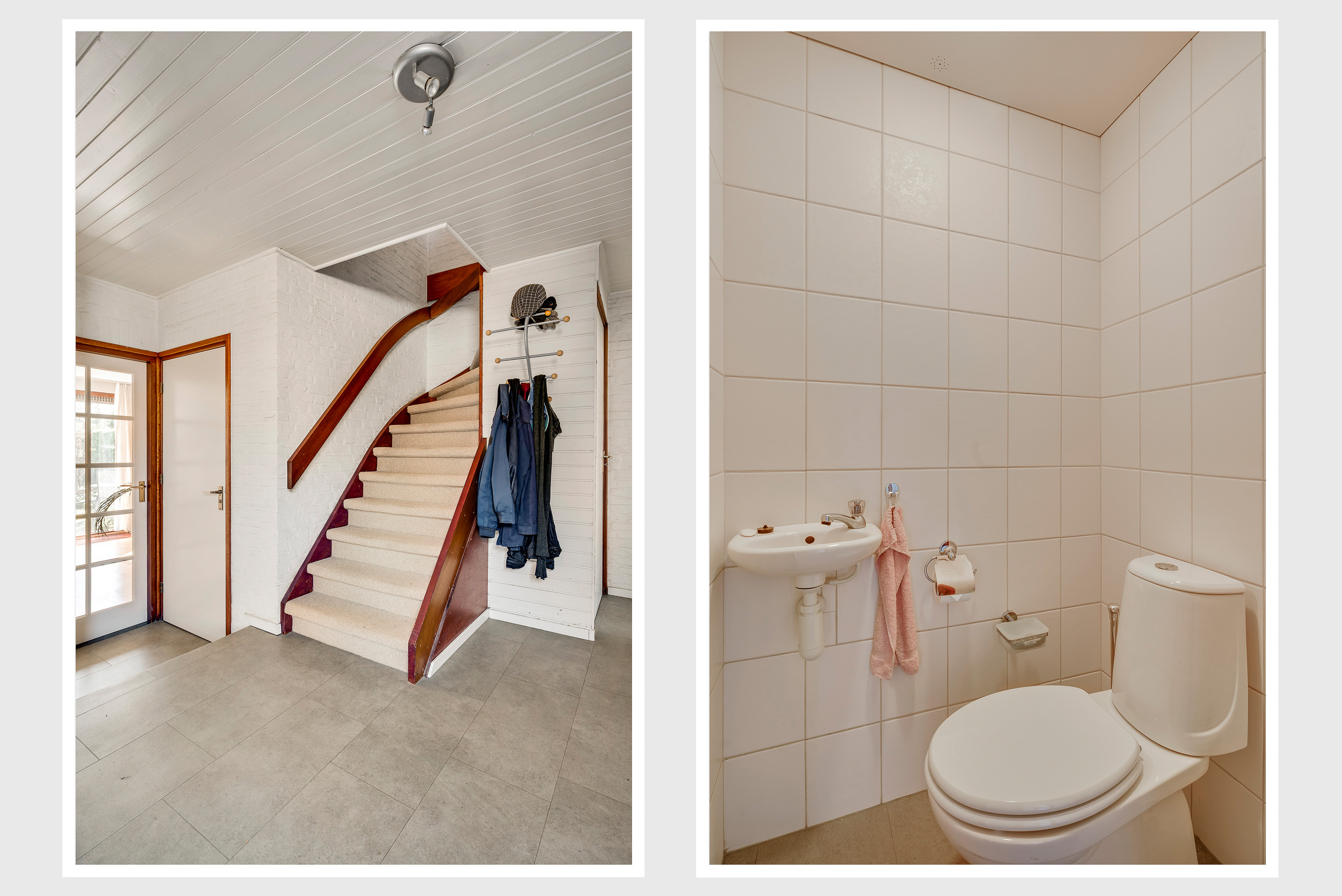 Voor de garage is een overkapping, met de voordeur van dit verrassend ruime woonhuis. Achter de voordeur is de ruime hal met de meterkast en de toiletruimte met fonteintje, uitgevoerd in lichte kleuren.