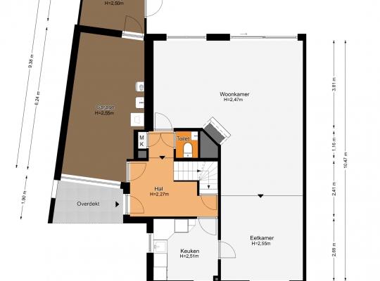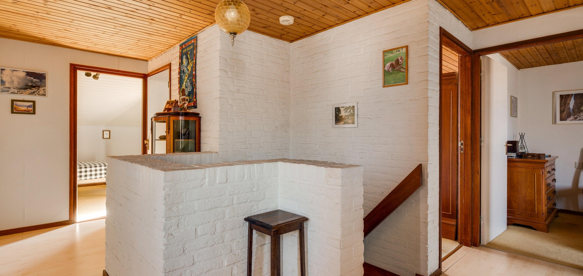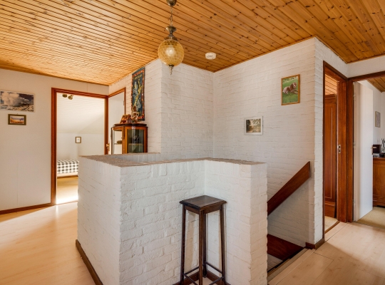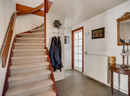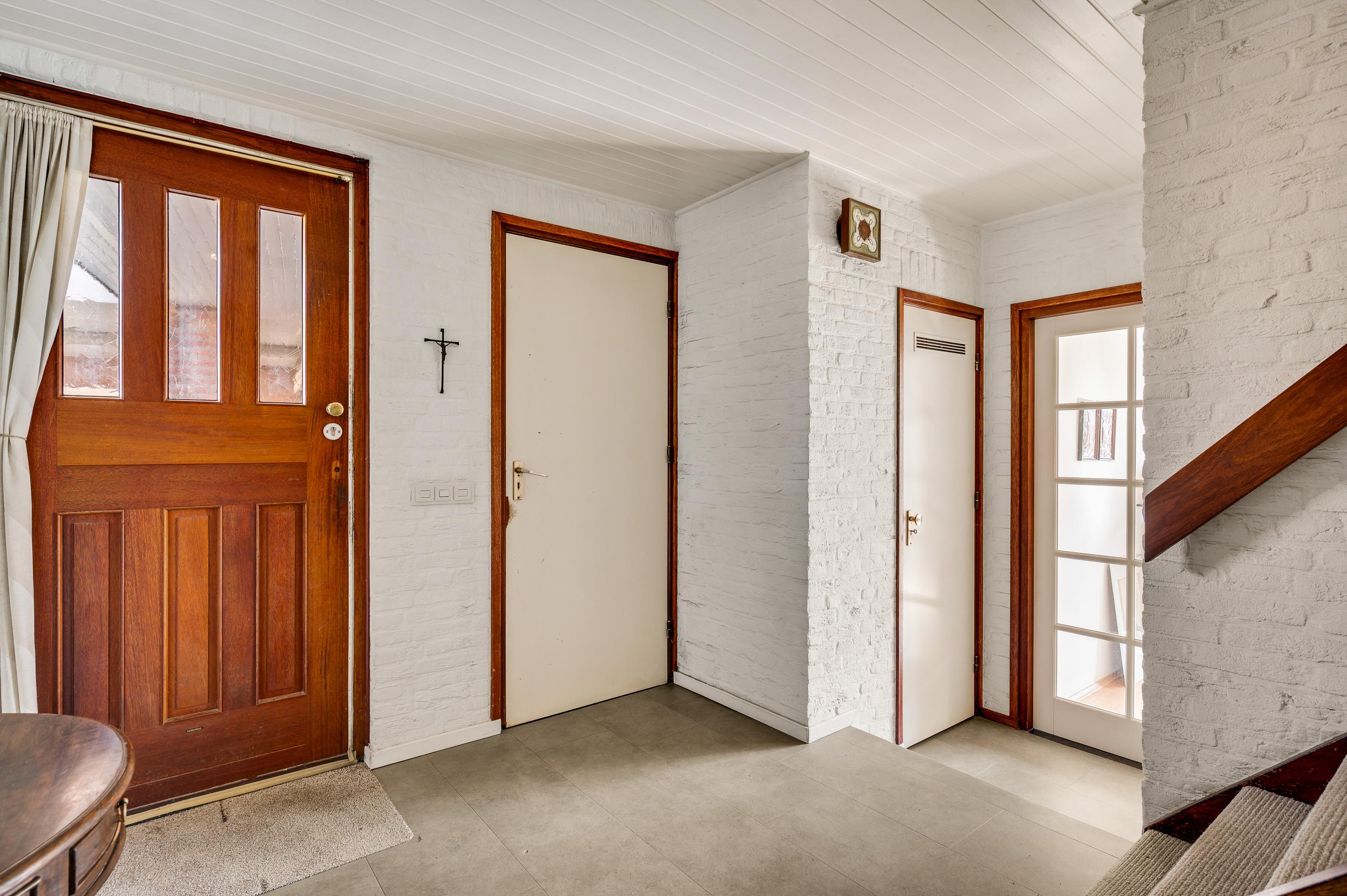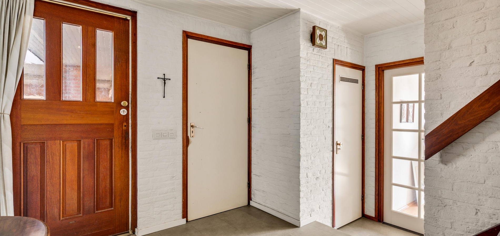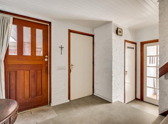 Voor de garage is een overkapping, met de voordeur van dit verrassend ruime woonhuis. Achter de voordeur is de ruime hal met de meterkast en de toiletruimte met fonteintje, uitgevoerd in lichte kleuren.