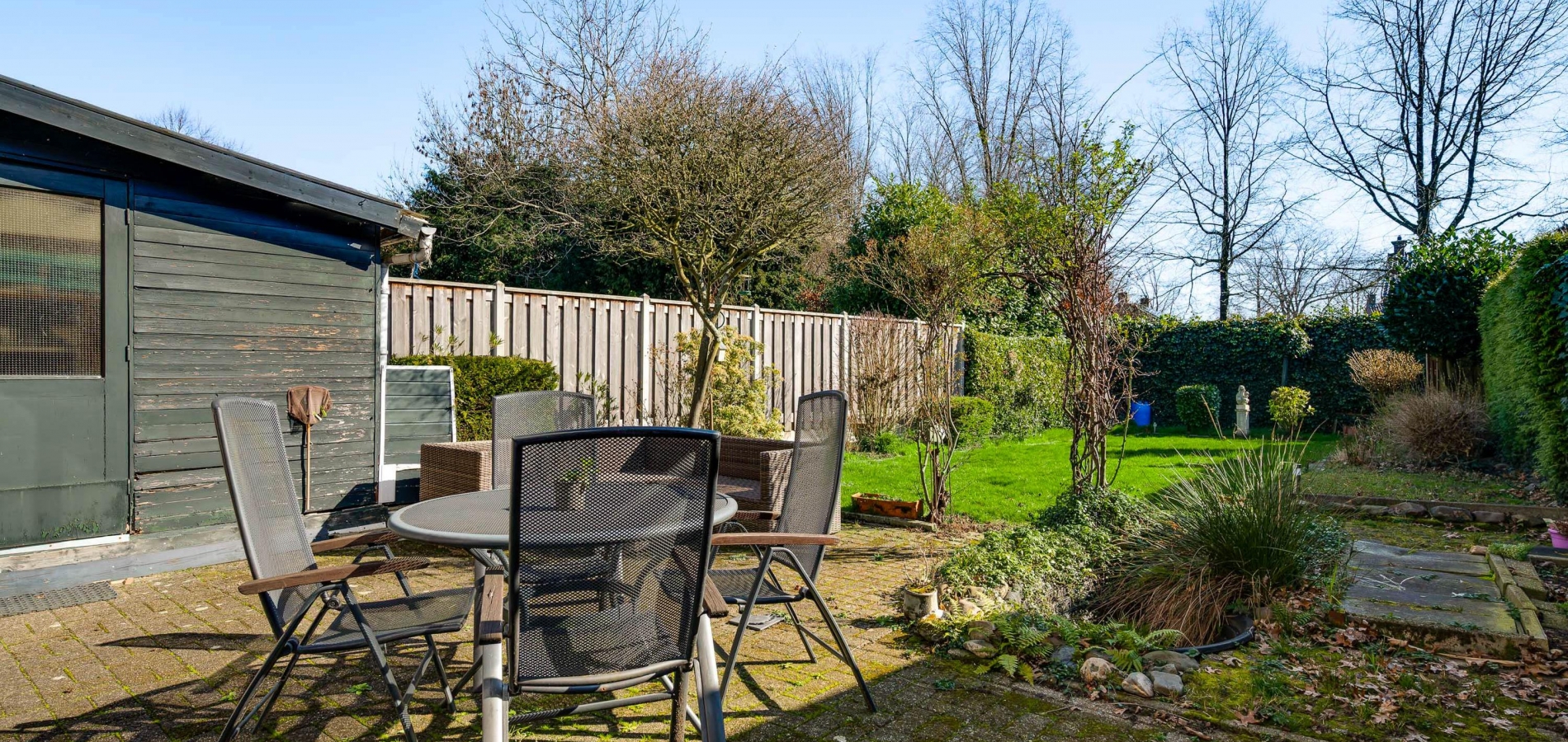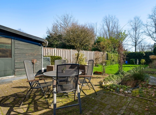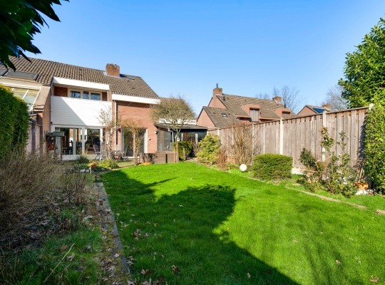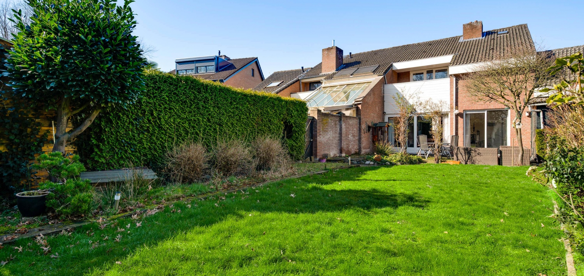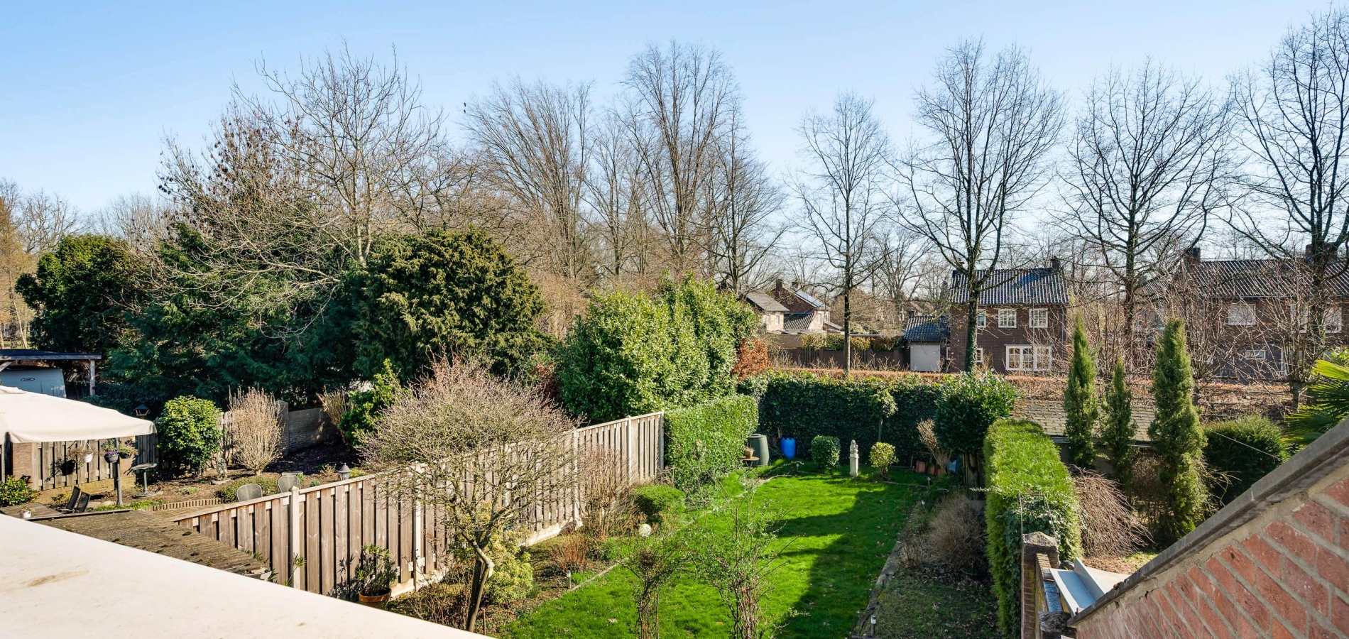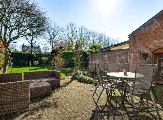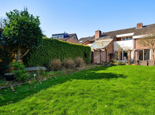 In de mooi aangelegde voortuin ziet u gevarieerd groen en op de oprit is ruimte voor meerdere auto’s. Via de woonkamer loopt u de diepe tuin in, gesitueerd op het oosten. Het grote terras is een fijne plek om buiten te zitten en verder is er veel groen, waar kinderen kunnen spelen op het gazon.