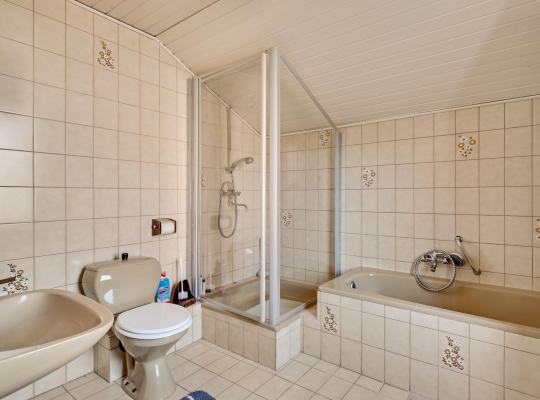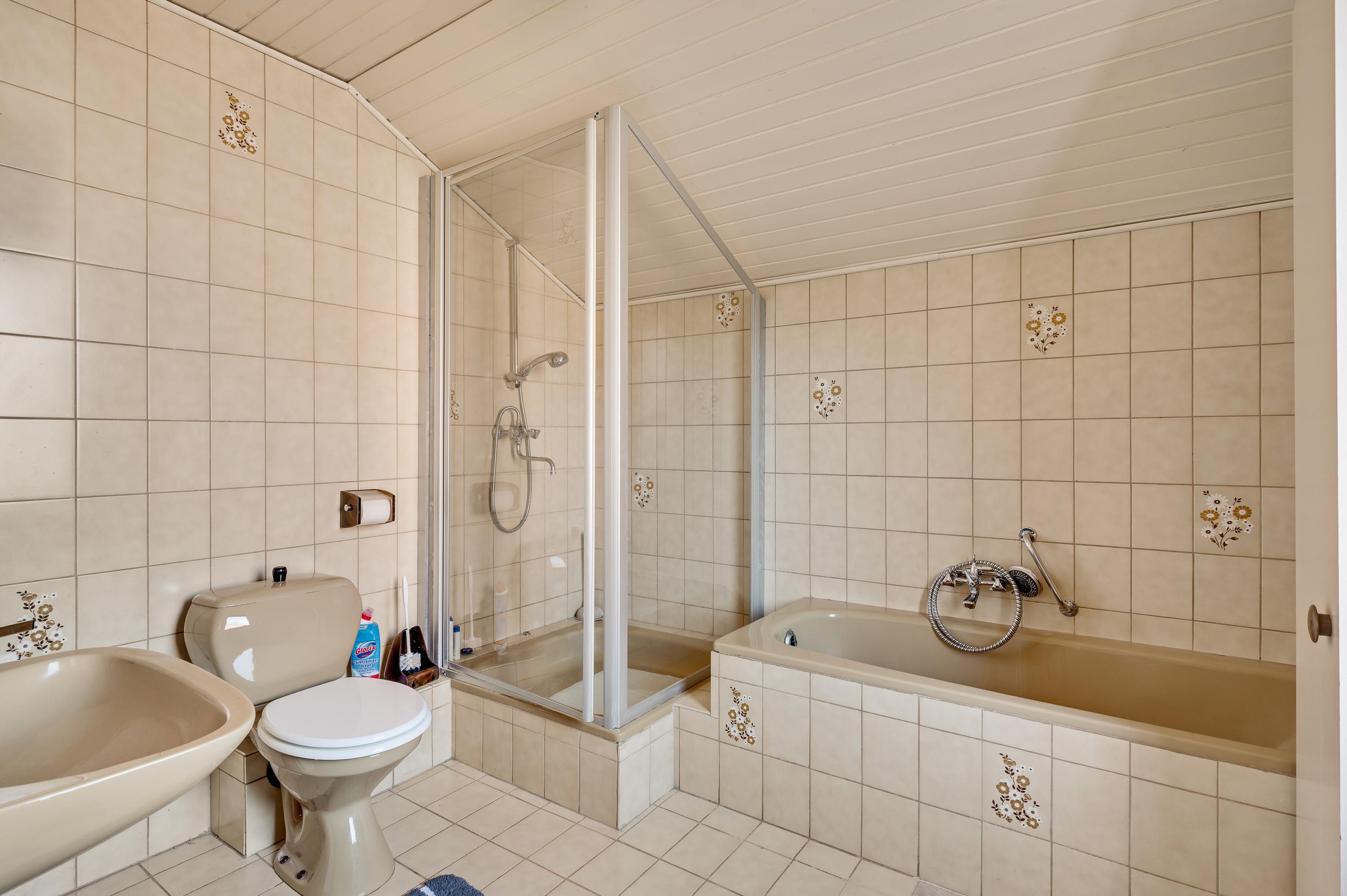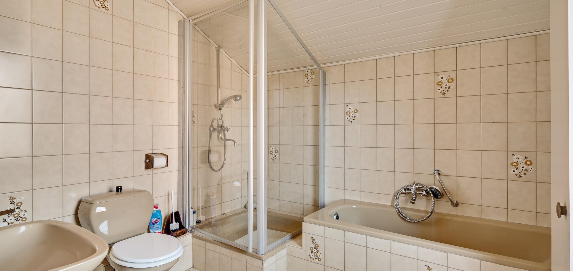 De badkamer (circa 2,80 x 2,46) is ingedeeld met een bad, aparte douche, een toilet en een wastafel. Deze ruimte is nog origineel uit het bouwjaar van het huis. Boven de garage is een zolder (circa 4,86 x 3,70/3,14), met de mogelijkheid om een extra (slaap)kamer te realiseren.