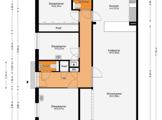 Het linkerdeel van de bungalow is ingedeeld met drie slaapkamers en de badkamer. Slaapkamer I (ca. 3,38 x 2,84) met wastafel bevindt zicht aan de voorzijde en slaapkamer II (ca. 3,40 x 2,32) grenst aan de oprit. Slaapkamer III (ca. 3,40/2,78 x 4,22) met vaste kastenwand aan de achterzijde is ingericht als hoofdslaapkamer. De badkamer (ca. 2,32 x 1,58) is ingedeeld met een bad/douchecombinatie, wastafelmeubel, spiegelkast, handdoekenradiator en een wandcloset.