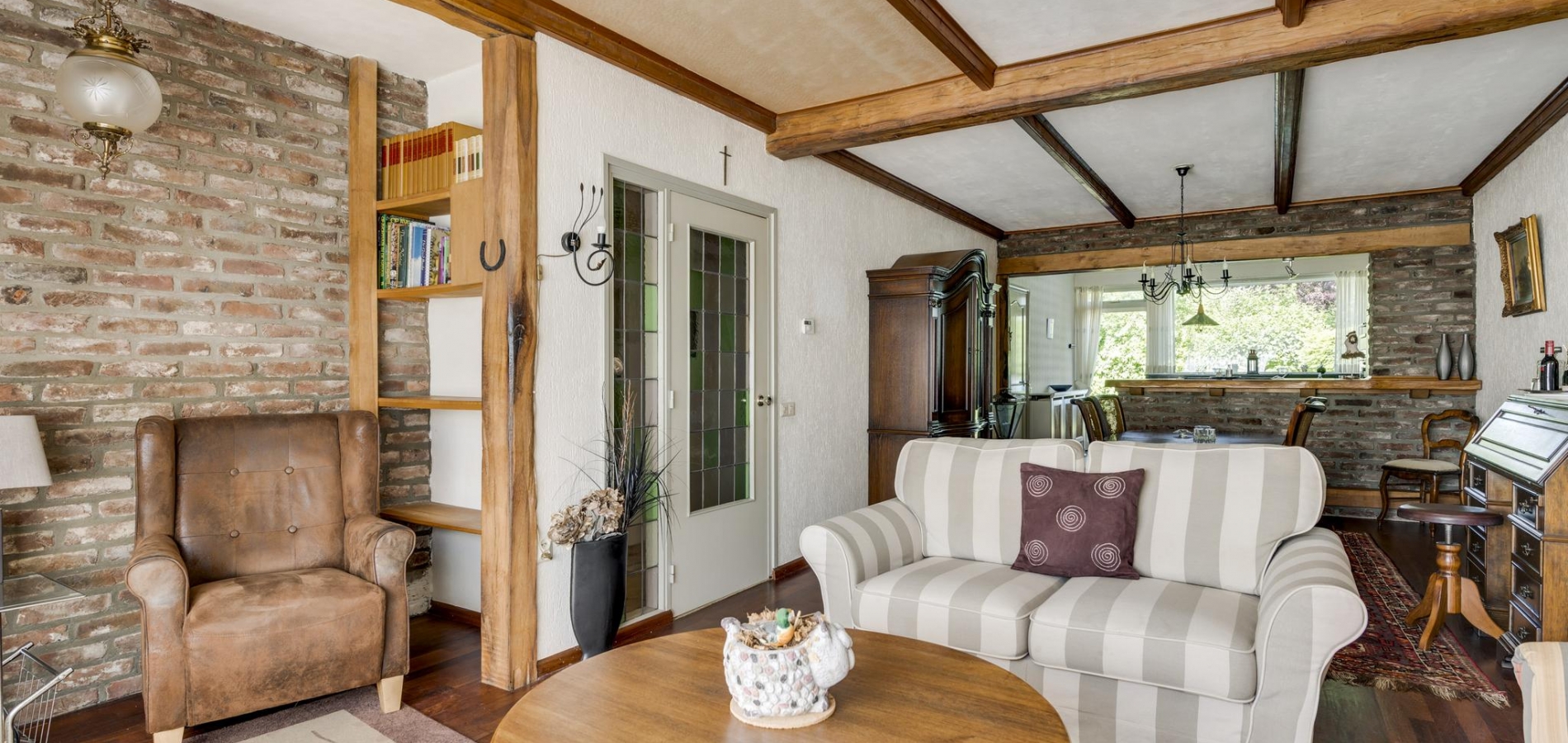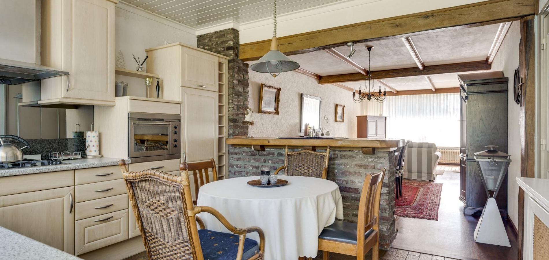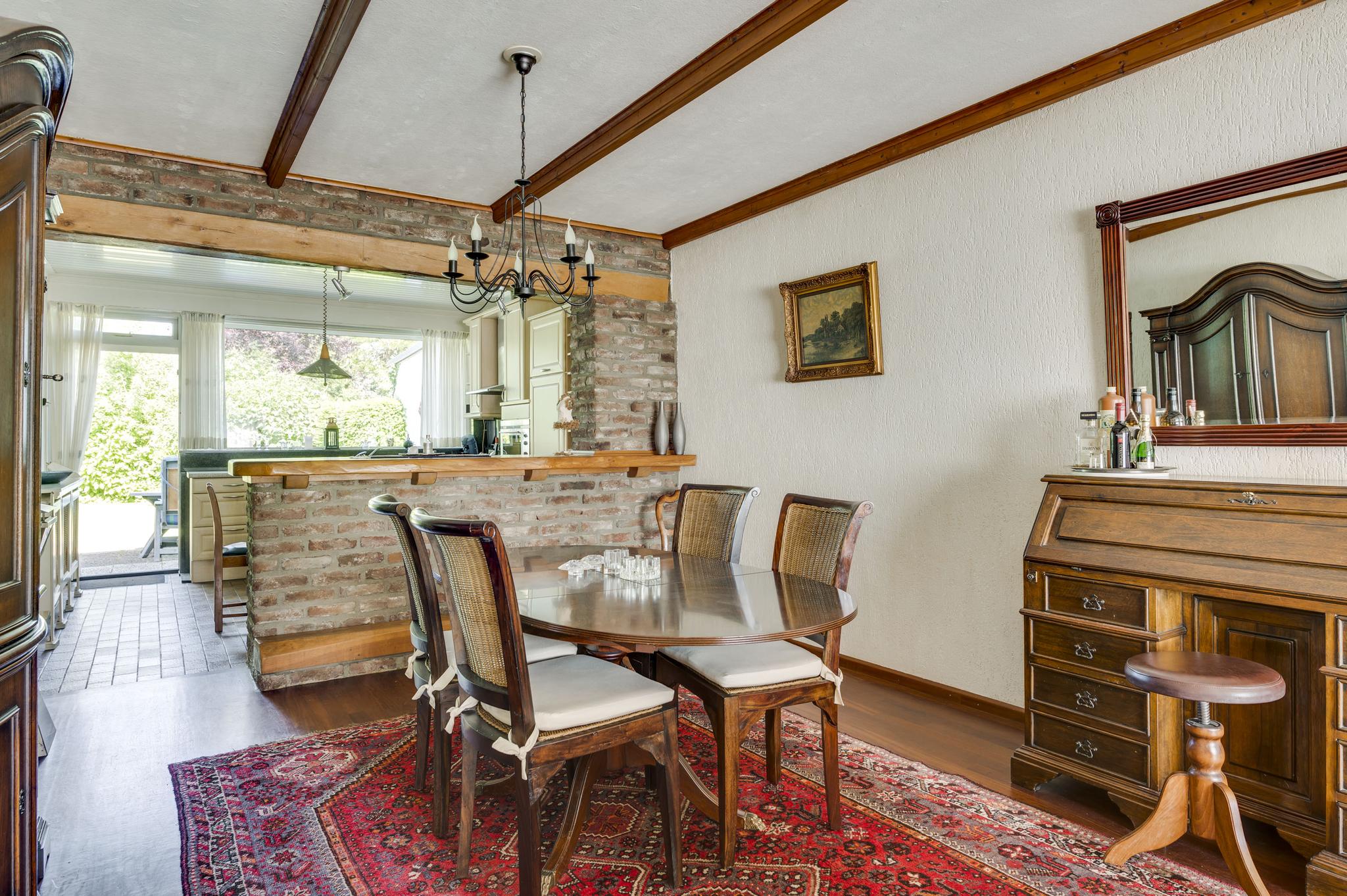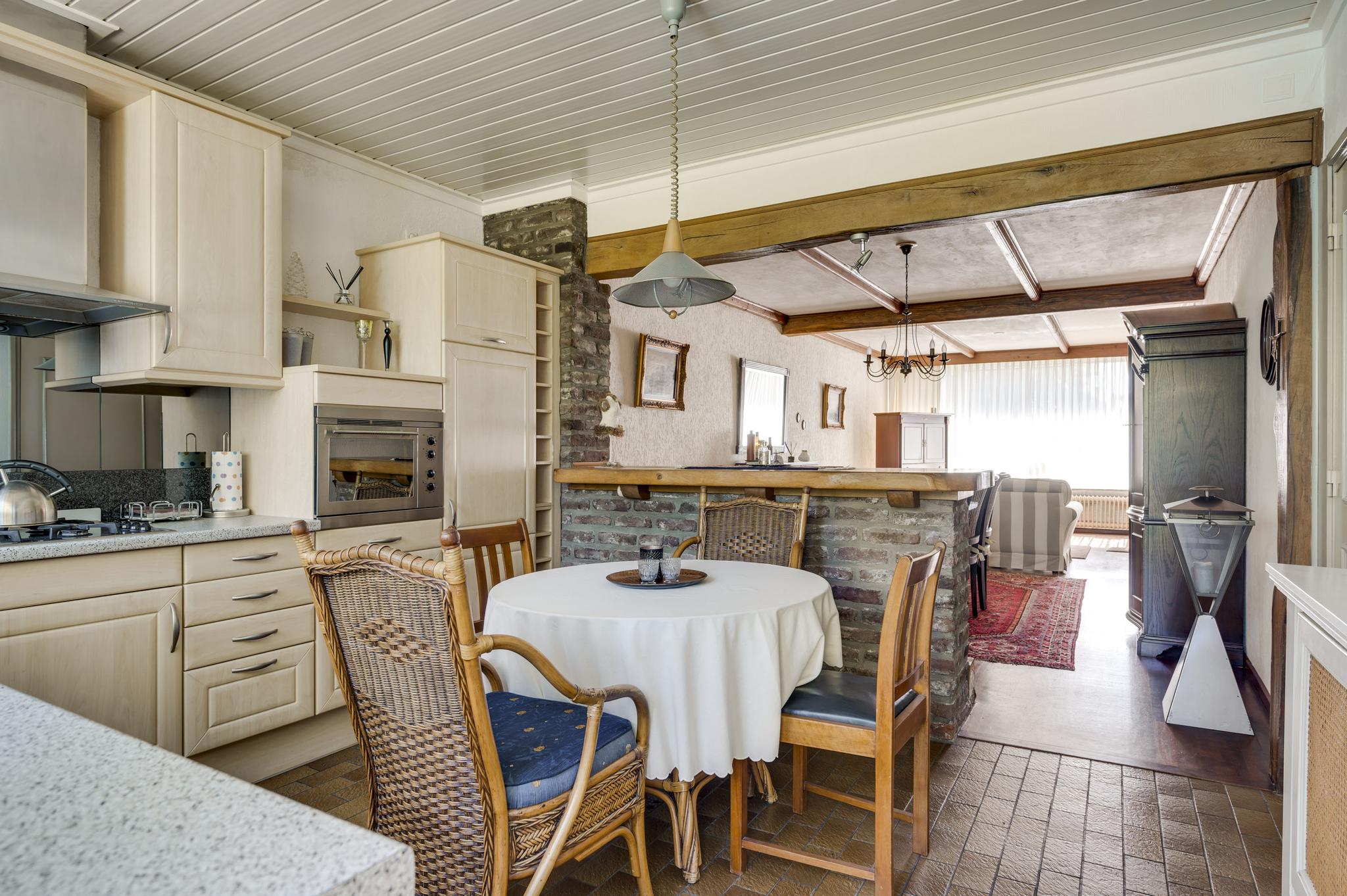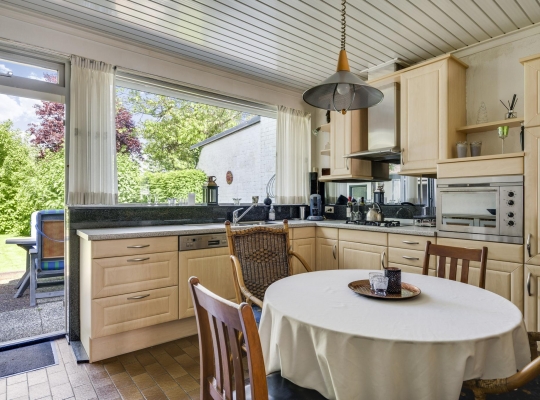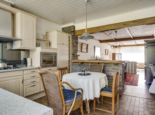 De woon-/eetkamer (ca. 8,20 x 4,80/3,70) met parketvloer staat in halfopen verbinding met de keuken (ca. 3,38 x 3,70). Het resultaat is een lichte, sfeervolle leefruimte van ca. 47 m2 met uitzicht naar de voor- en achtertuin. In de keuken staat een lichte hoekopstelling (1995) met een gaskookplaat, afzuigkap, vaatwasser, koelkast en een combimagnetron.