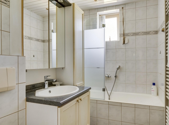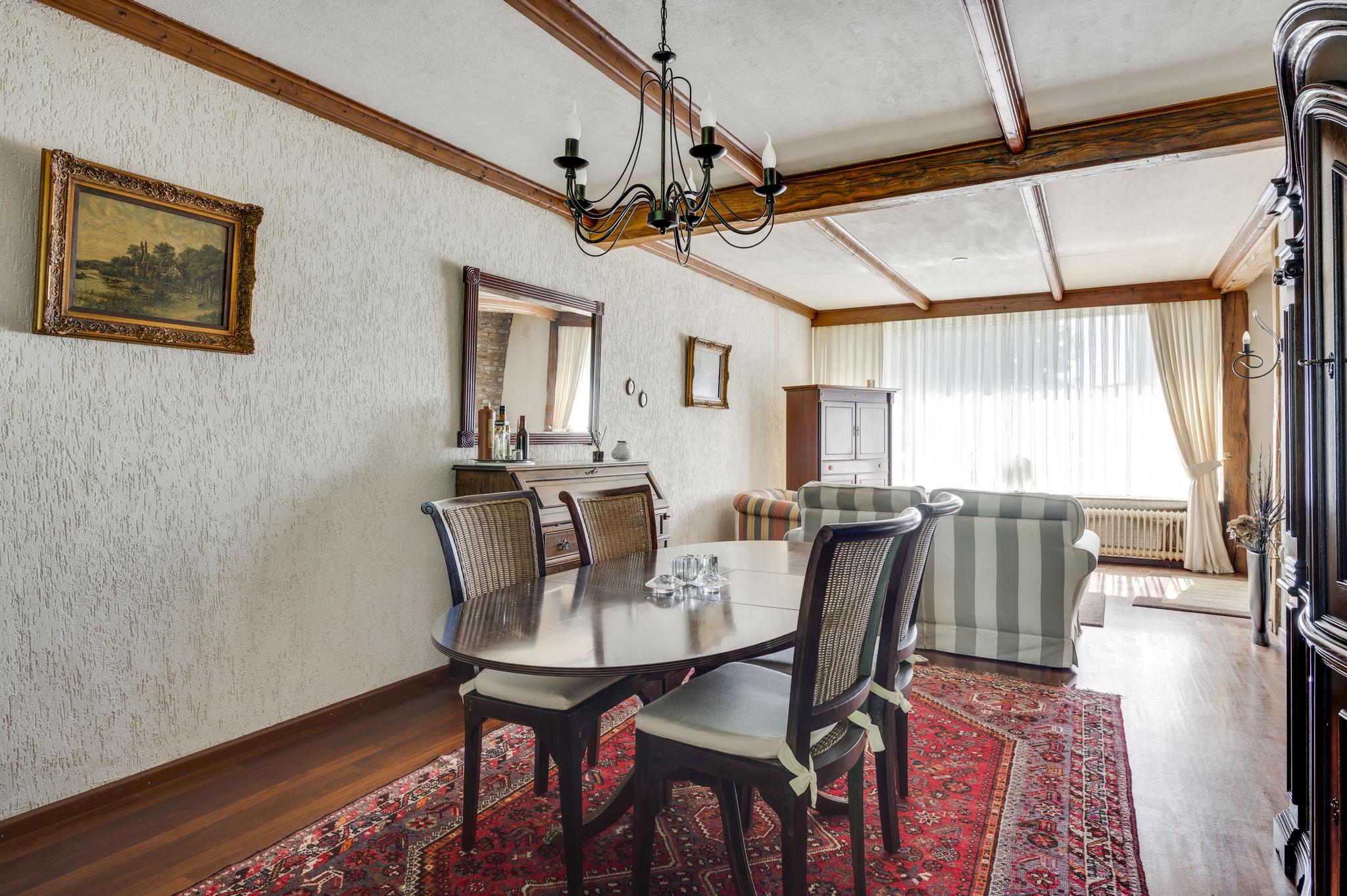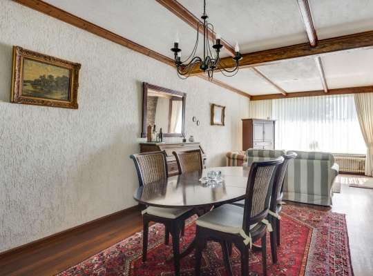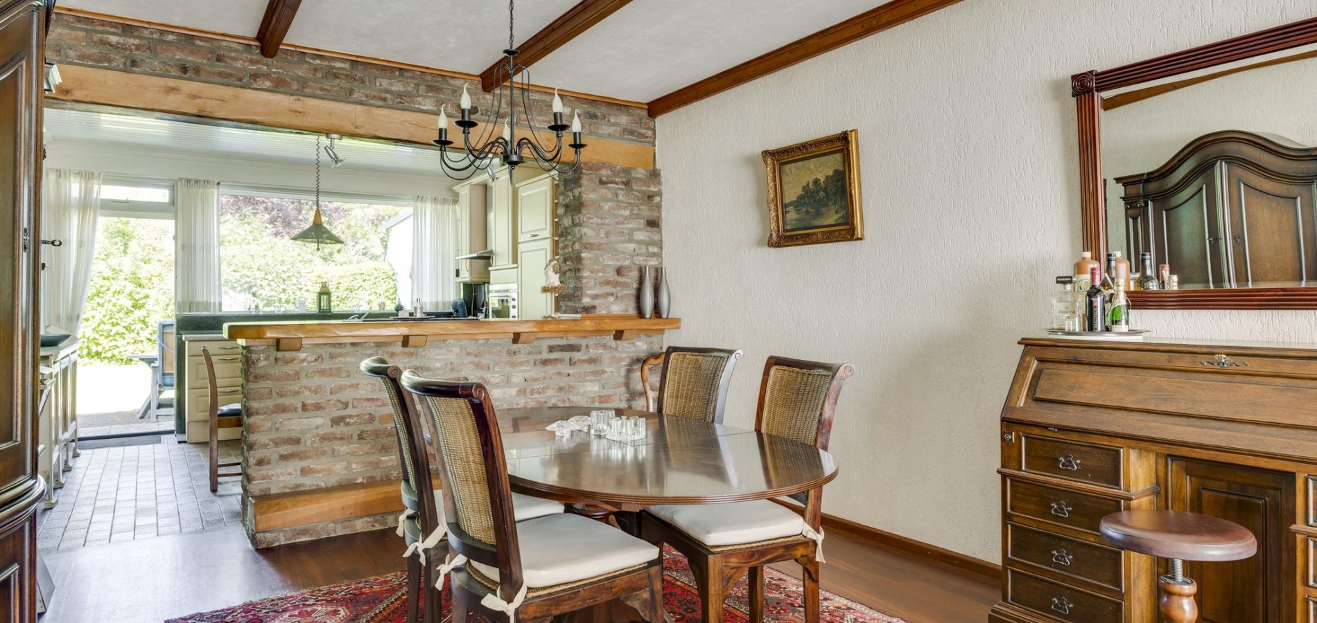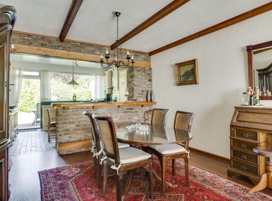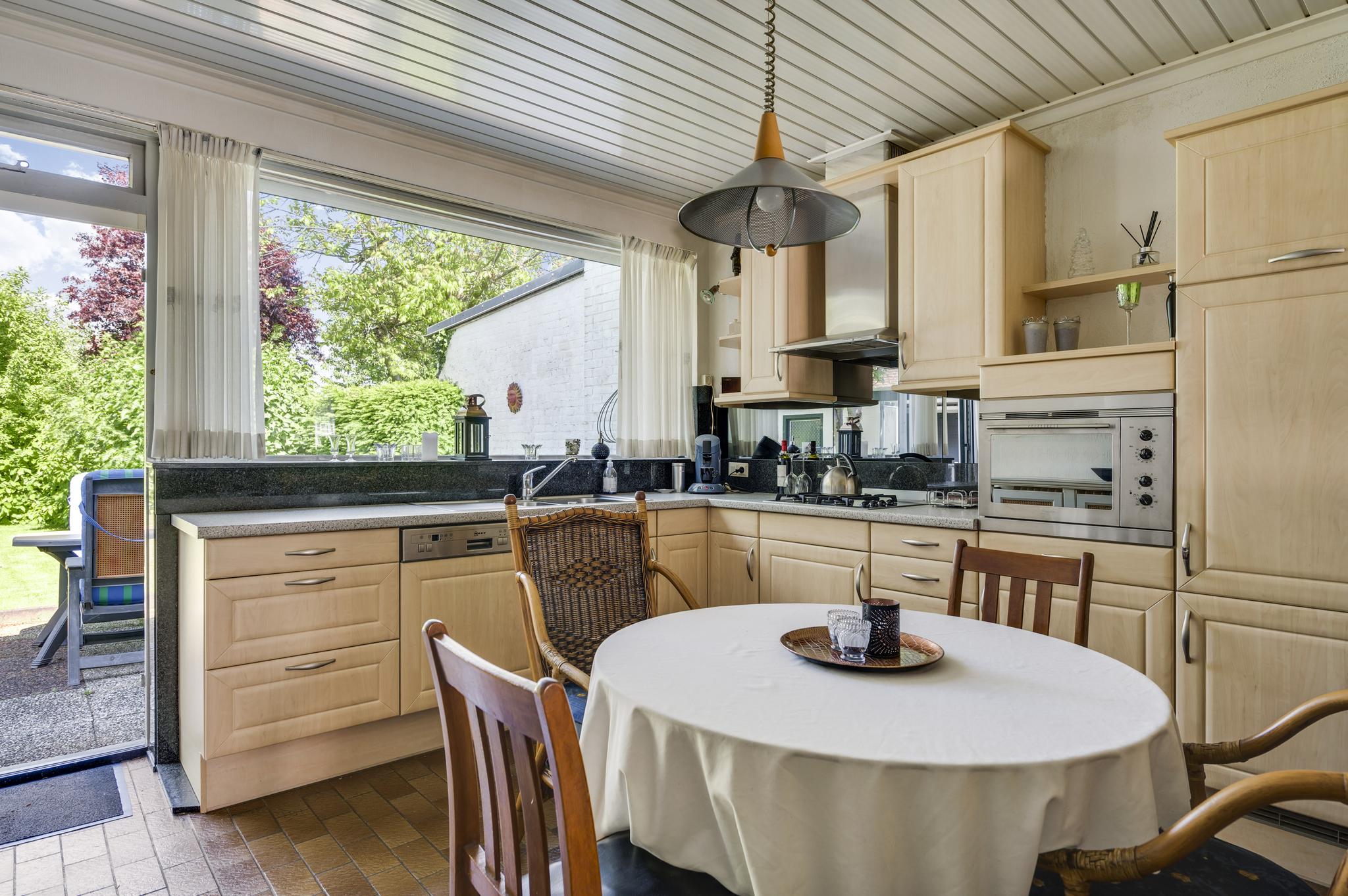 De woon-/eetkamer (ca. 8,20 x 4,80/3,70) met parketvloer staat in halfopen verbinding met de keuken (ca. 3,38 x 3,70). Het resultaat is een lichte, sfeervolle leefruimte van ca. 47 m2 met uitzicht naar de voor- en achtertuin. In de keuken staat een lichte hoekopstelling (1995) met een gaskookplaat, afzuigkap, vaatwasser, koelkast en een combimagnetron.