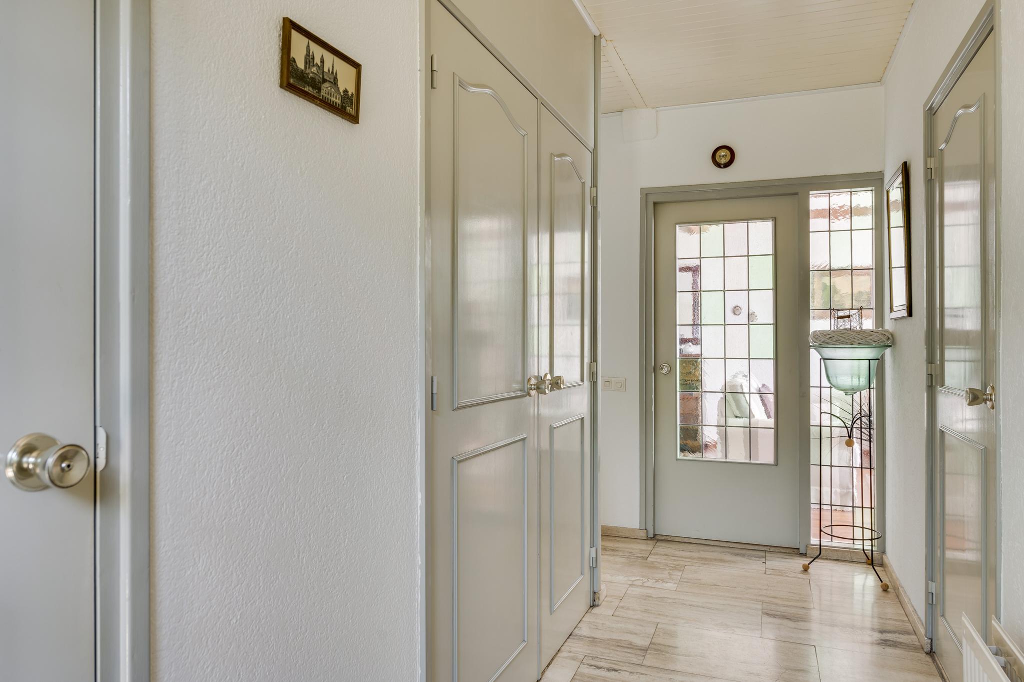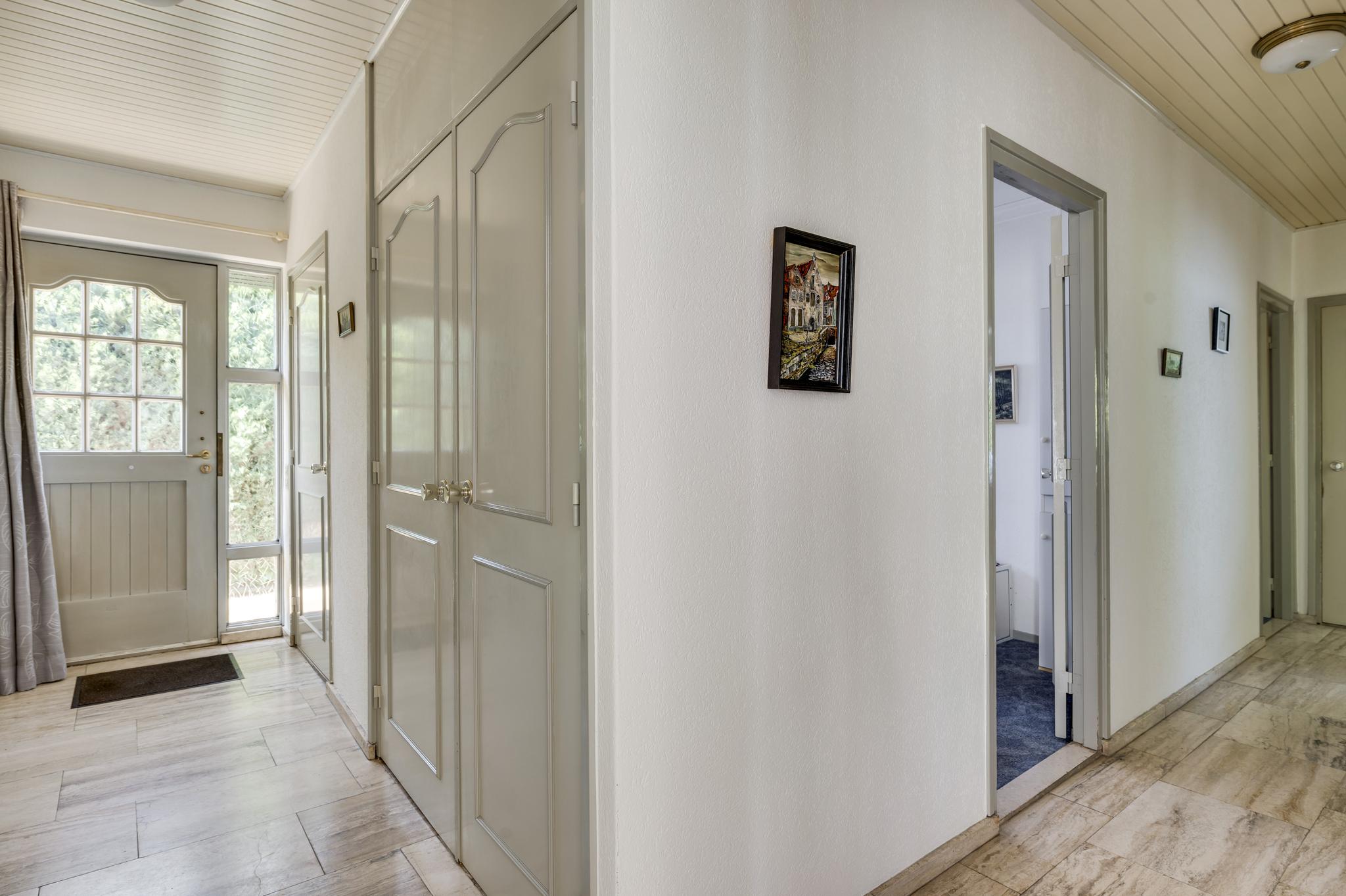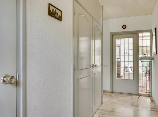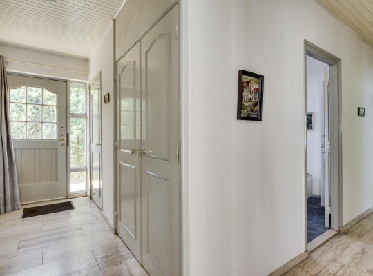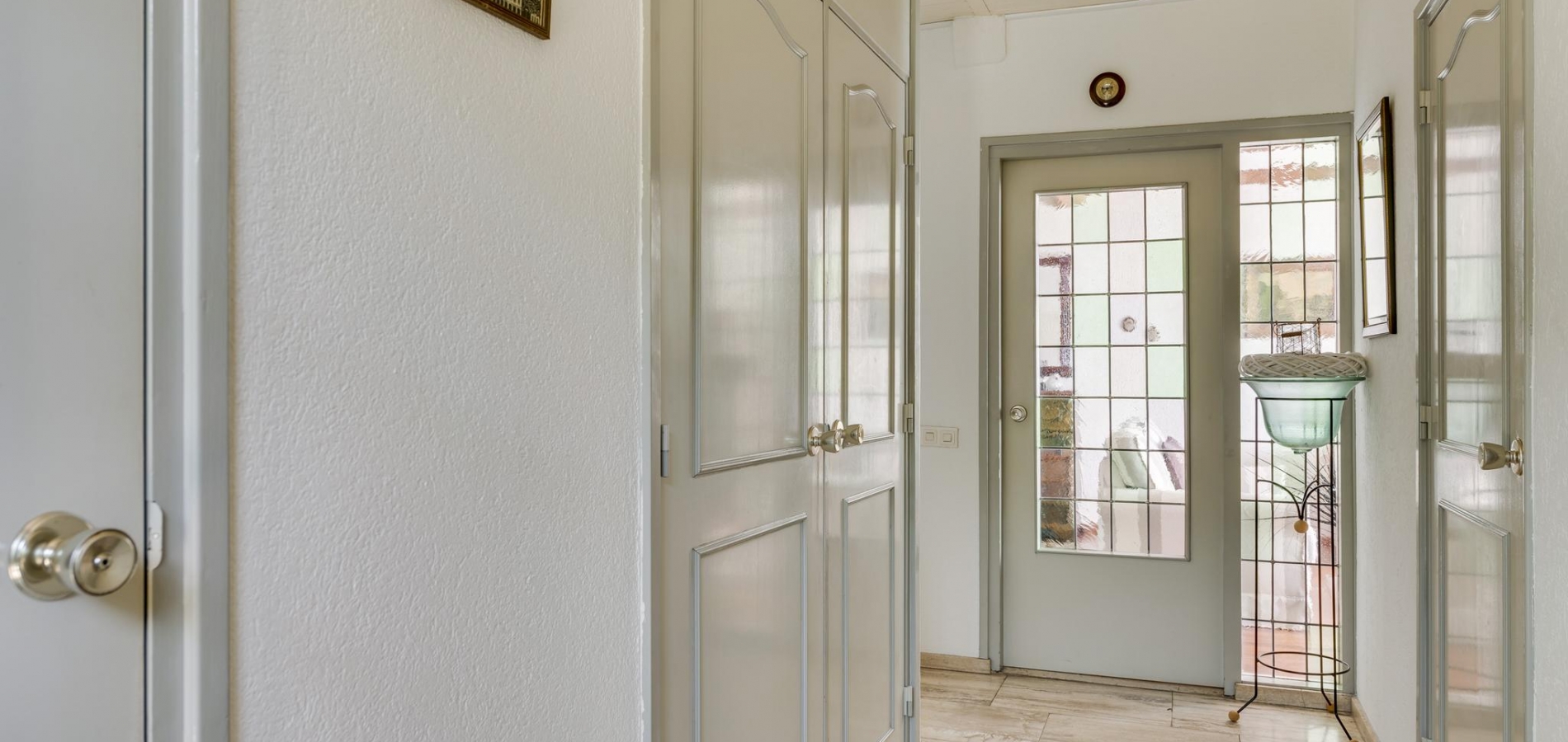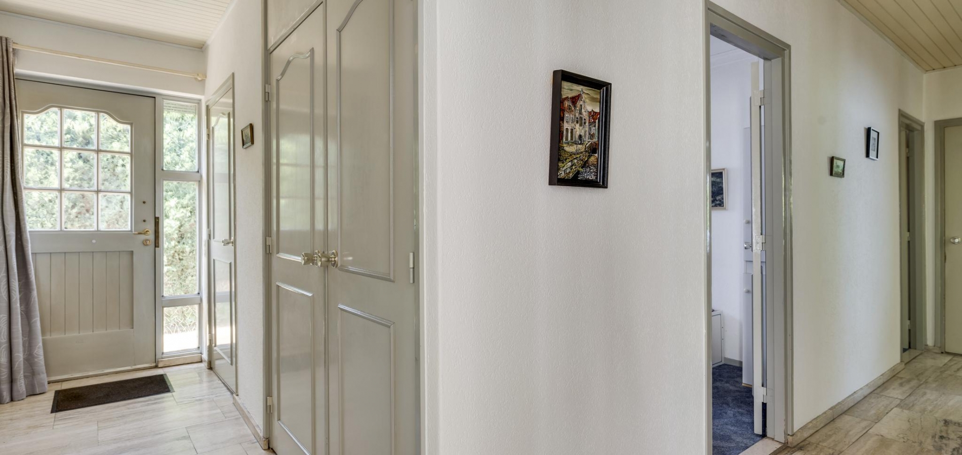 Aan de linkerzijde, bij de oprit, is de entree van deze gelijkvloerse bungalow. Aan de L-vormige hal grenzen onder andere de meterkast, een garderobekast en de toiletruimte met fonteintje. Een van de klassieke paneeldeuren is voorzien van glas in lood, uitgevoerd in zachte kleuren.