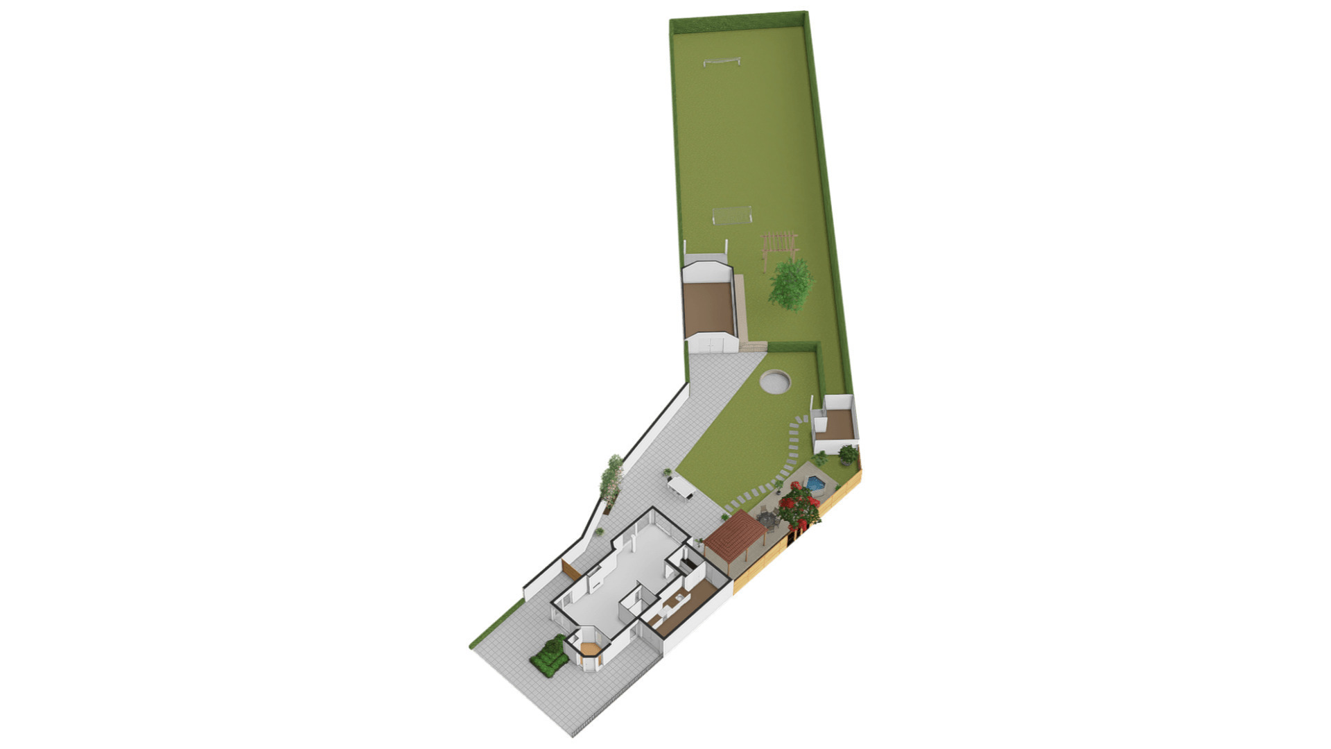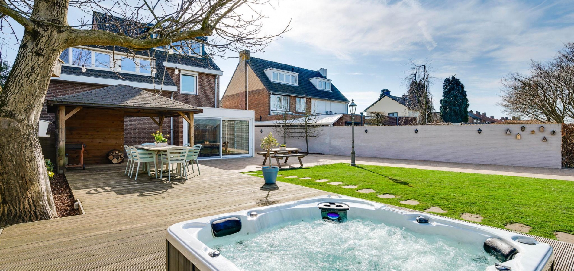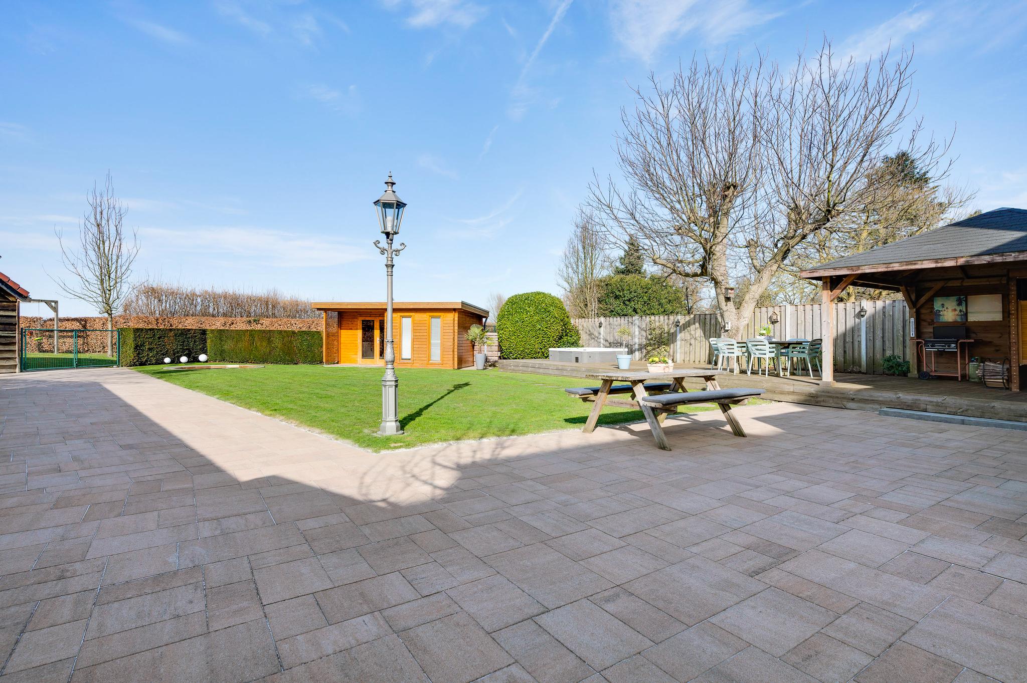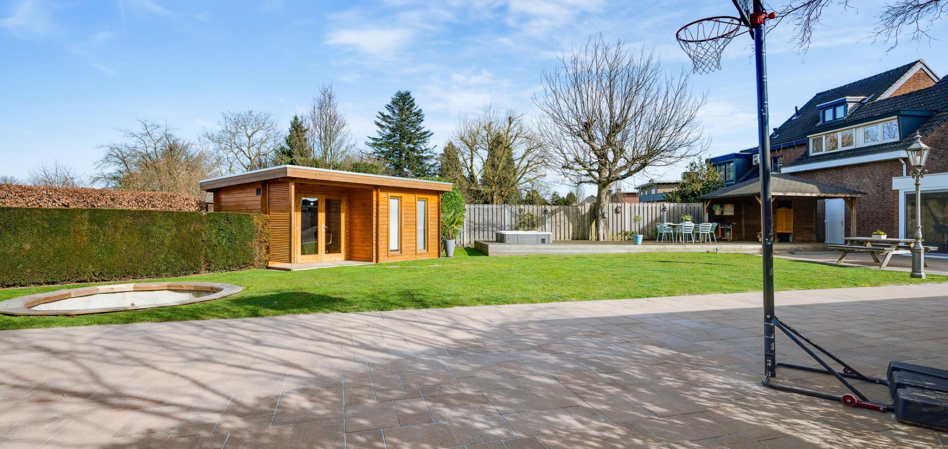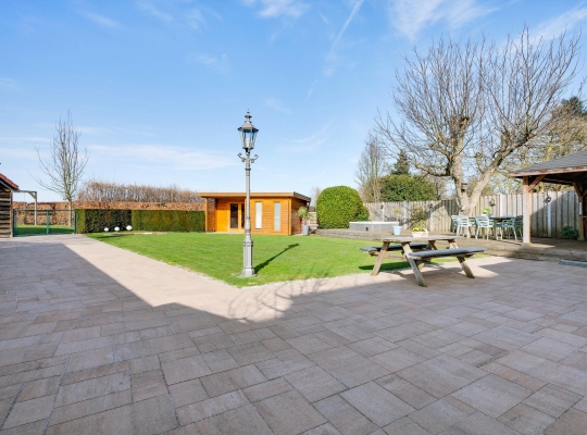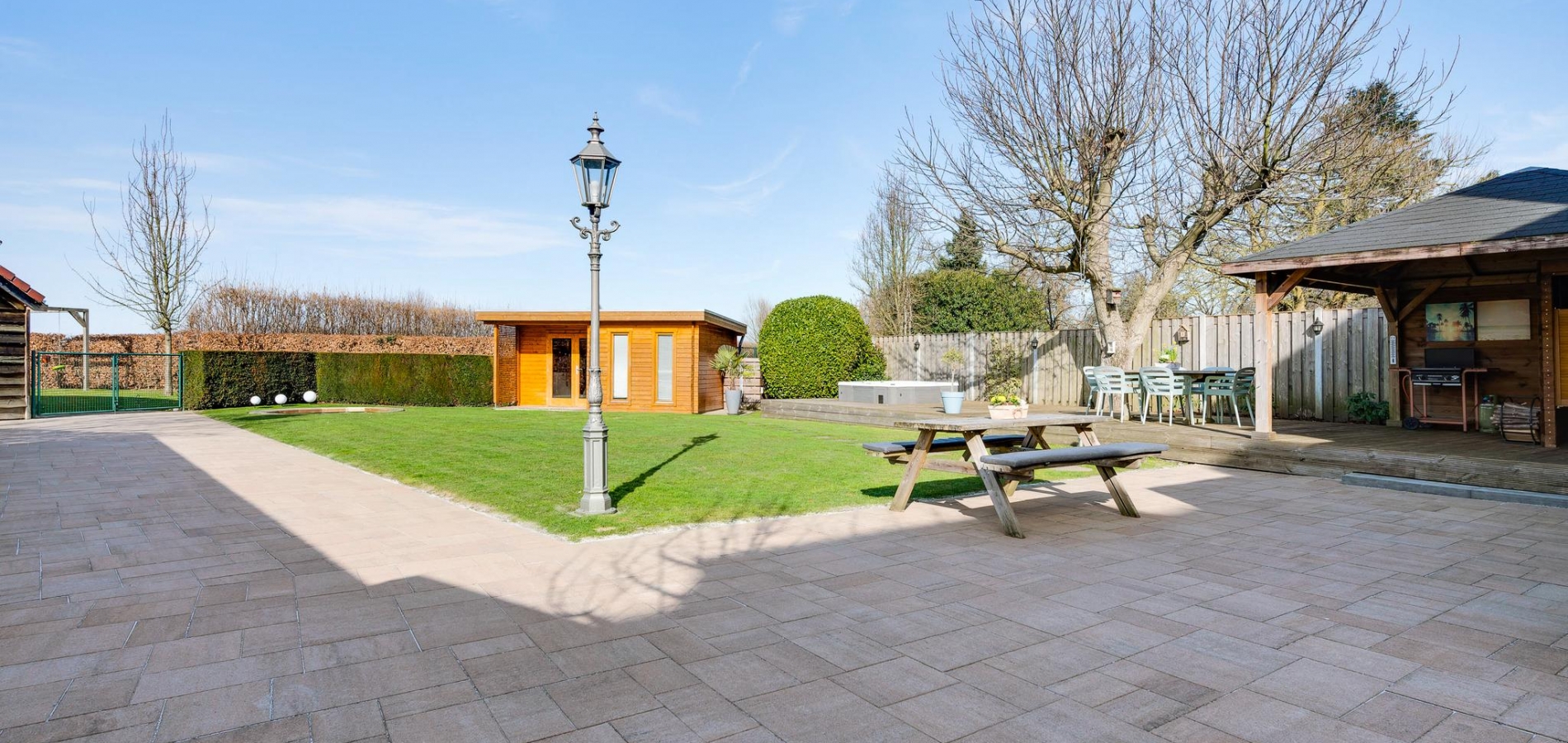 Twee houten garagedeuren geven toegang tot het rechterdeel van de oprit. Aan de andere zijde van de woning is de tweede oprit, met parkeergelegenheid voor en achter de poort. Als u verder loopt, dan bereikt u de zeer royale tuin met een groot terras, met berging en een heerlijke jacuzzi. Naast het gazon is een mancave met overdekt terras (totaal circa 5,11 x 3,81) gebouwd en de ronde vuurplaats met zitgelegenheid is een fijne plek voor jong en oud.