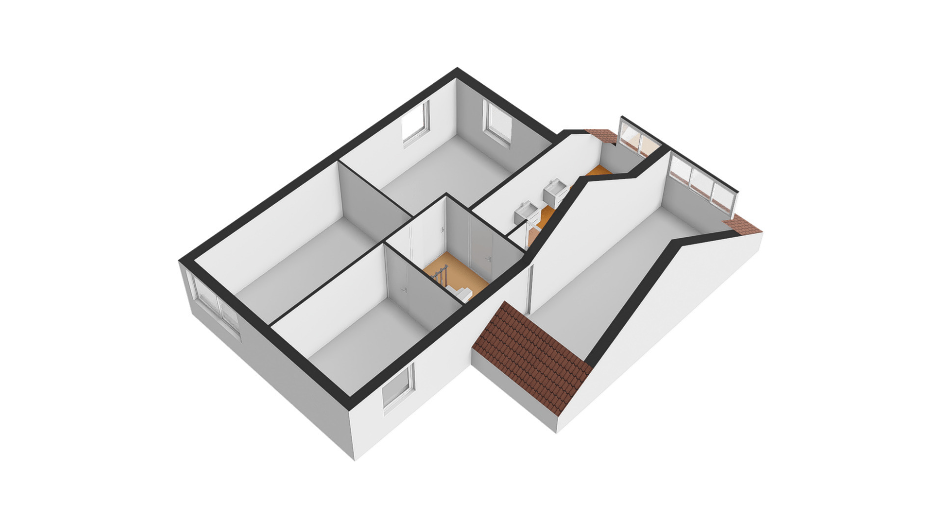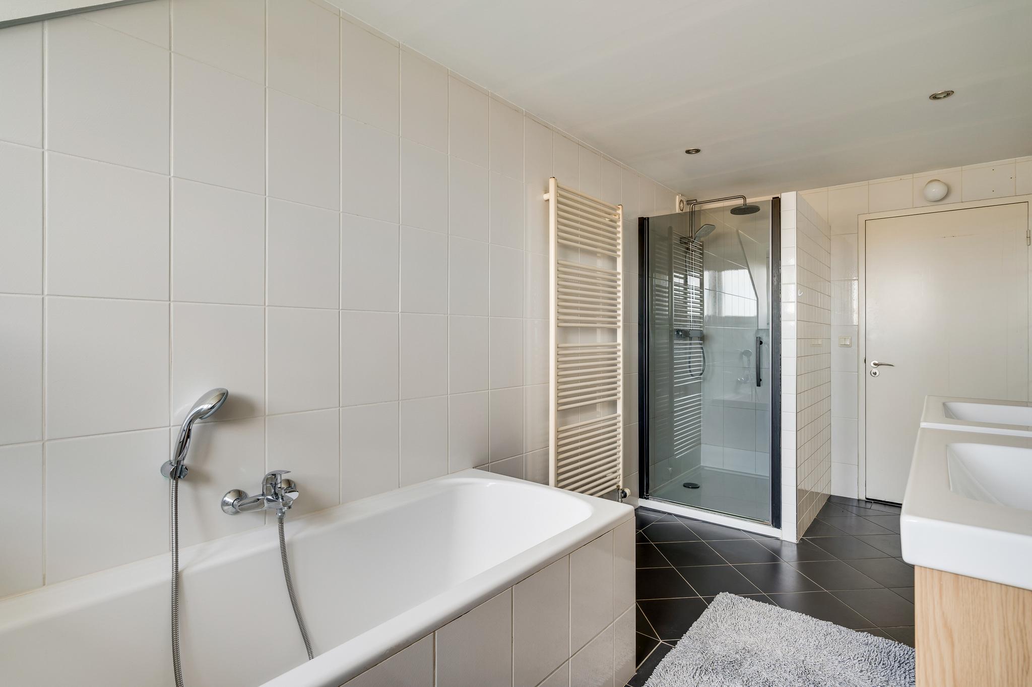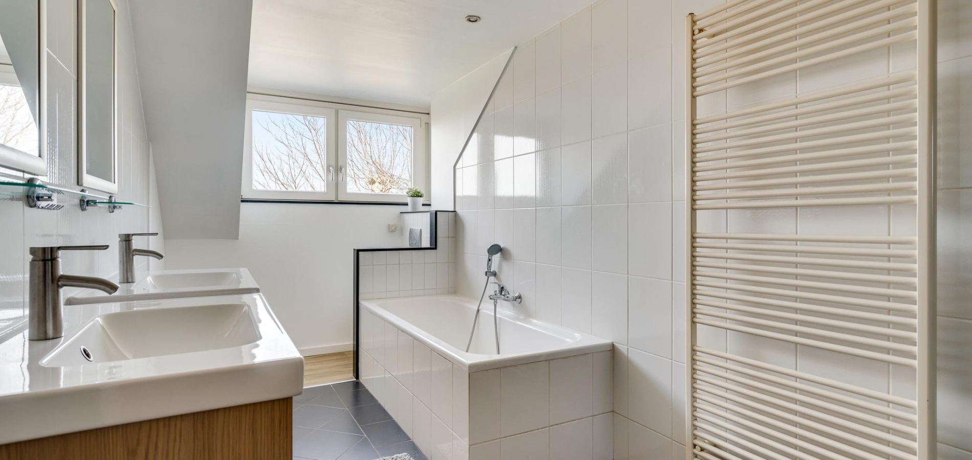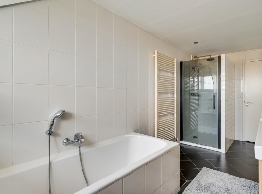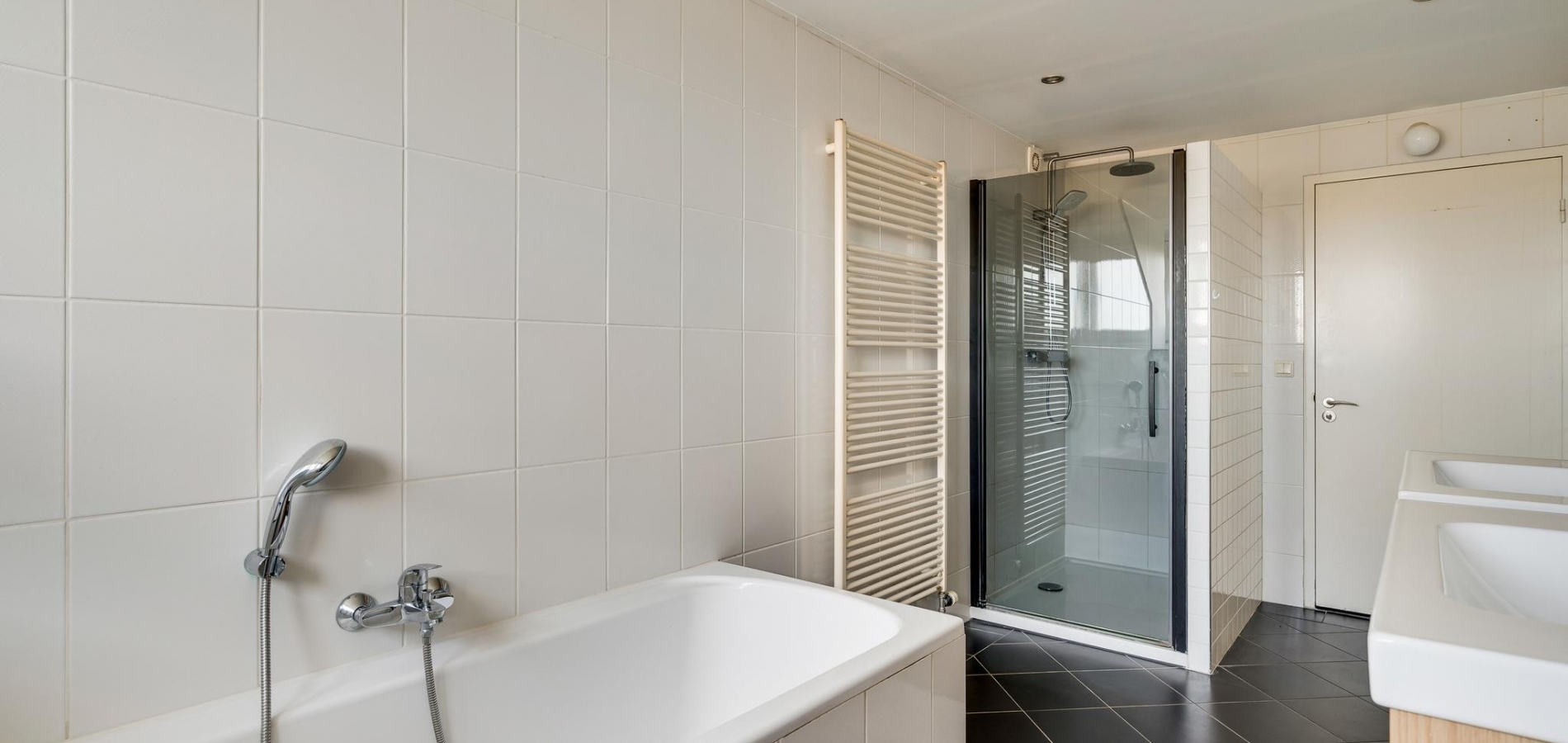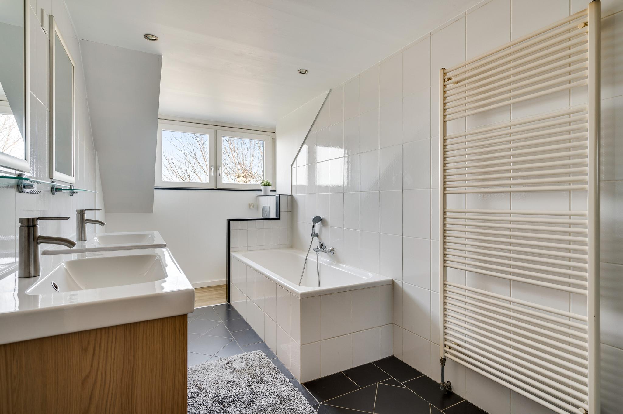 De badkamer (circa 5,38 x 2,03) met dakkapel is ingedeeld met een ligbad, ruime douche, een toilet en twee wastafelmeubels. Deze zijn in 2025 geplaatst, goed passend bij de rest van de badkamer.
