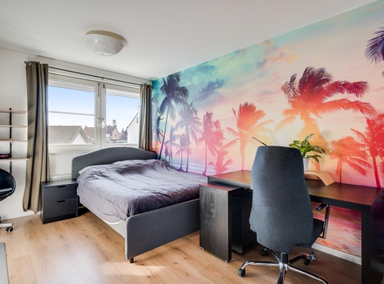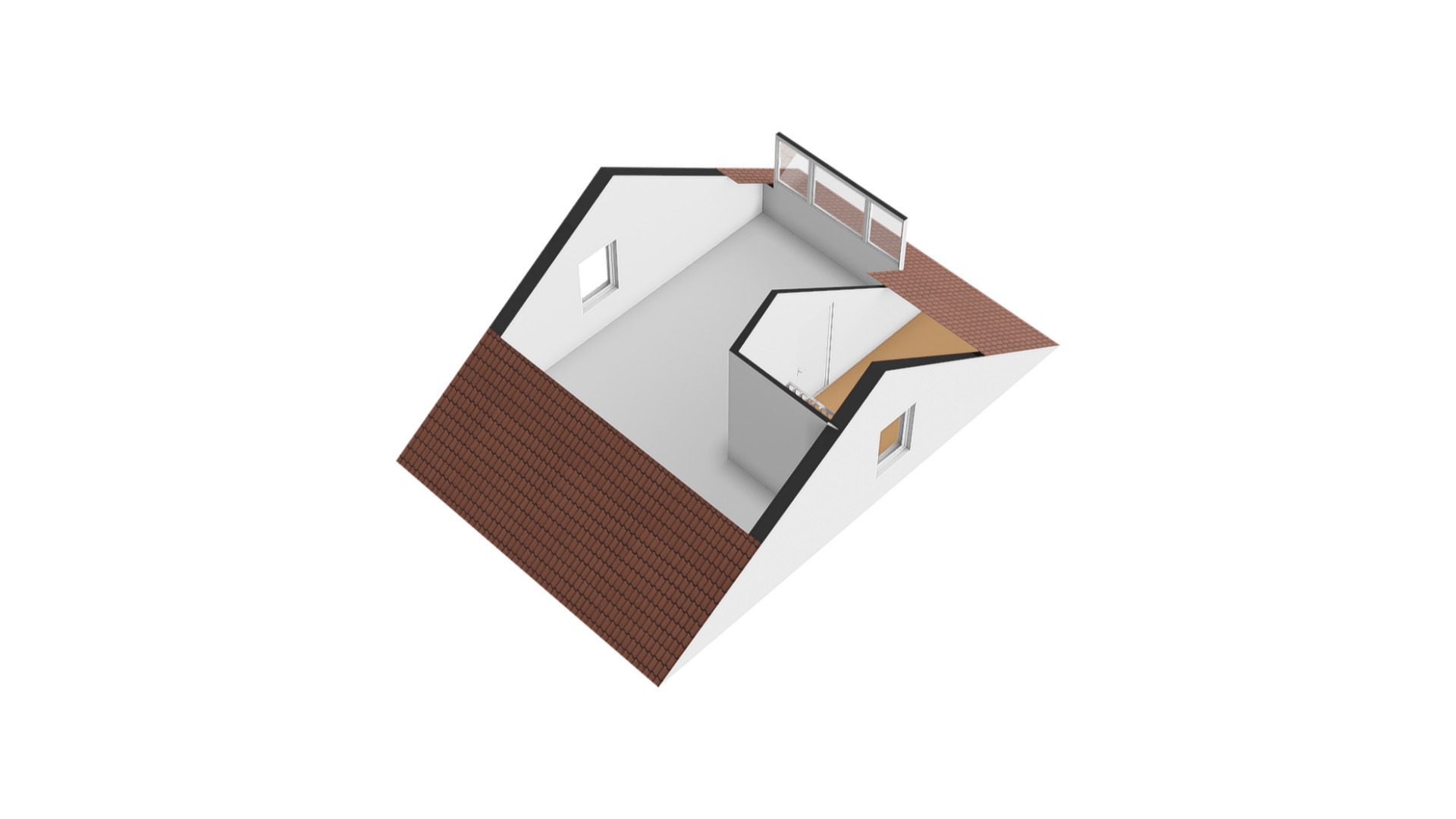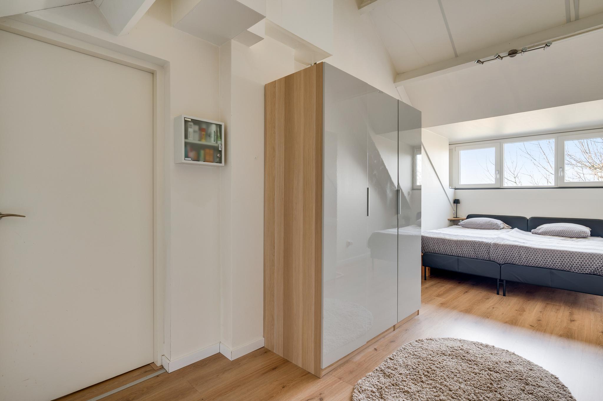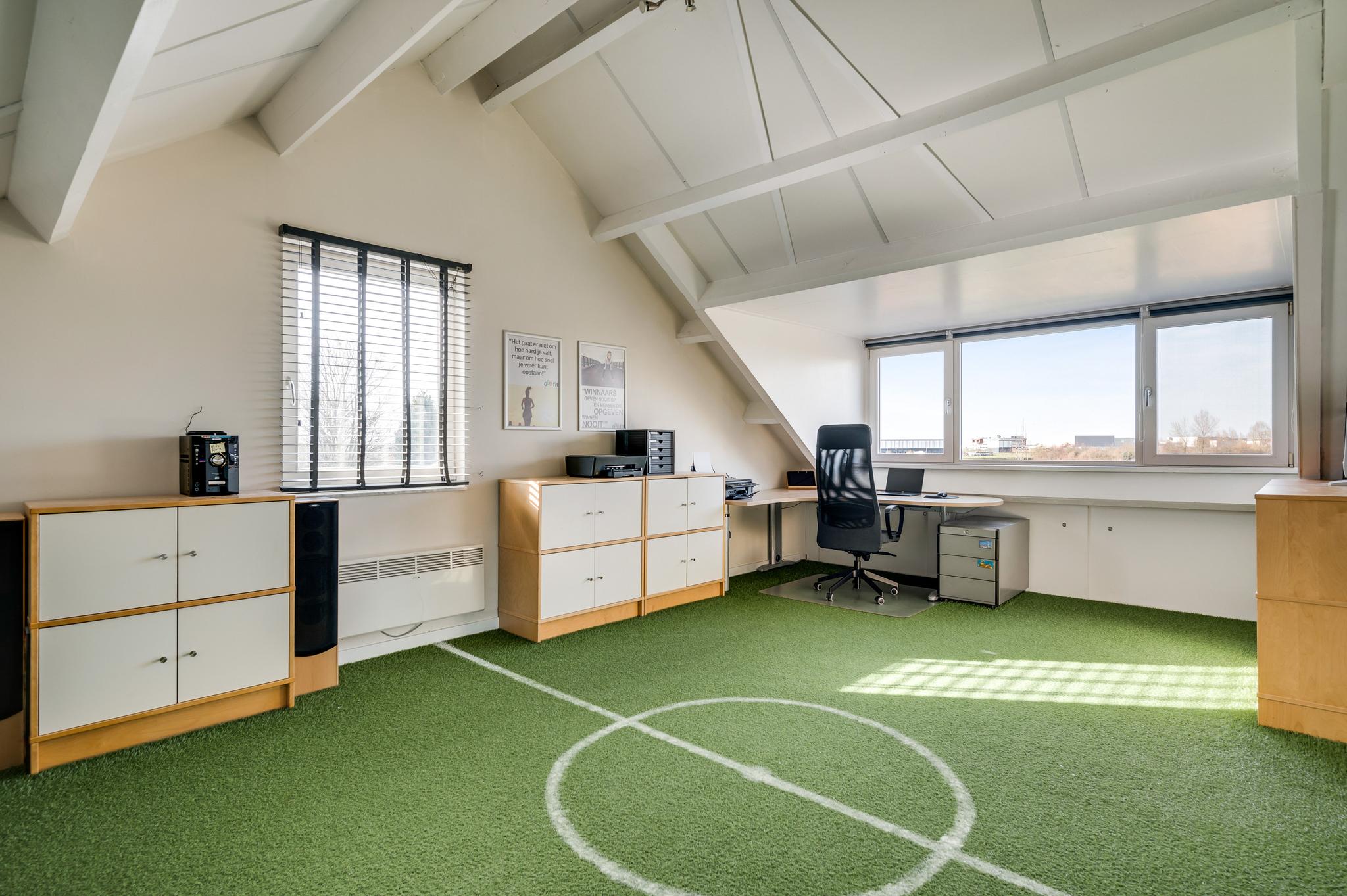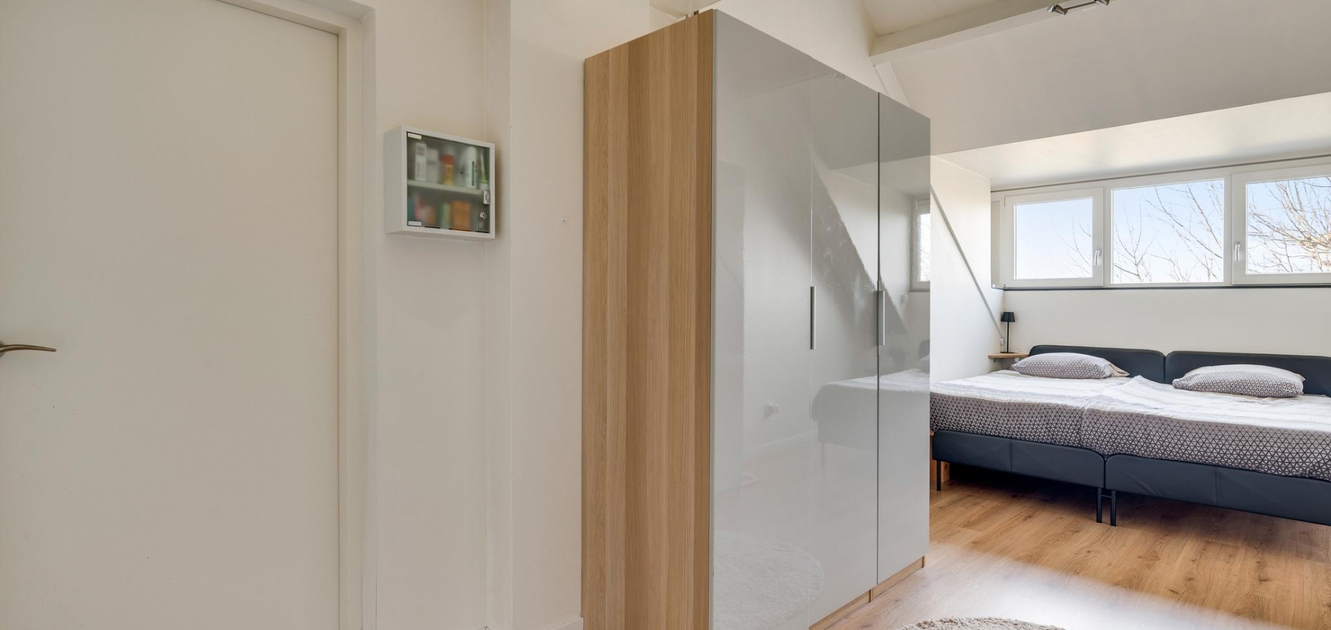 Een vaste trap geeft toegang tot een grote, multifunctionele ruimte van circa 30 m2 met een brede dakkapel, een zijraam en een hoge nok. In de schuinte van het dak, over de hele breedte, is een berging gemaakt en op de overloop is de opstelling van de HR-ketel (Vaillant Eco Tec, 2015, huur).