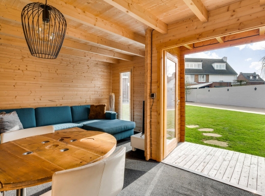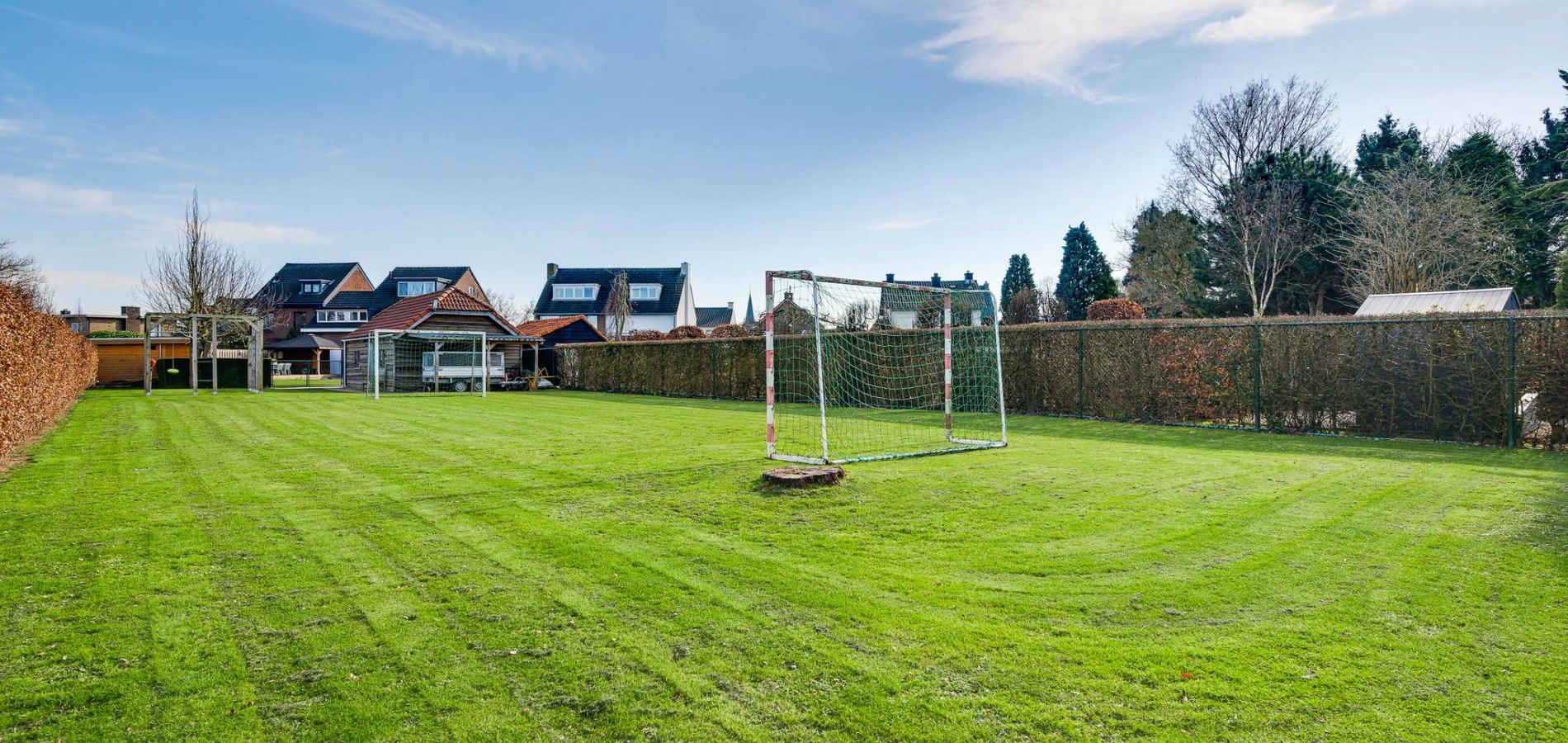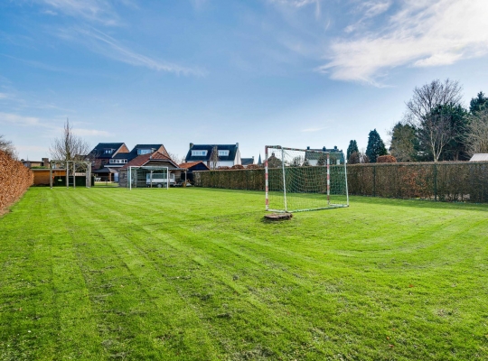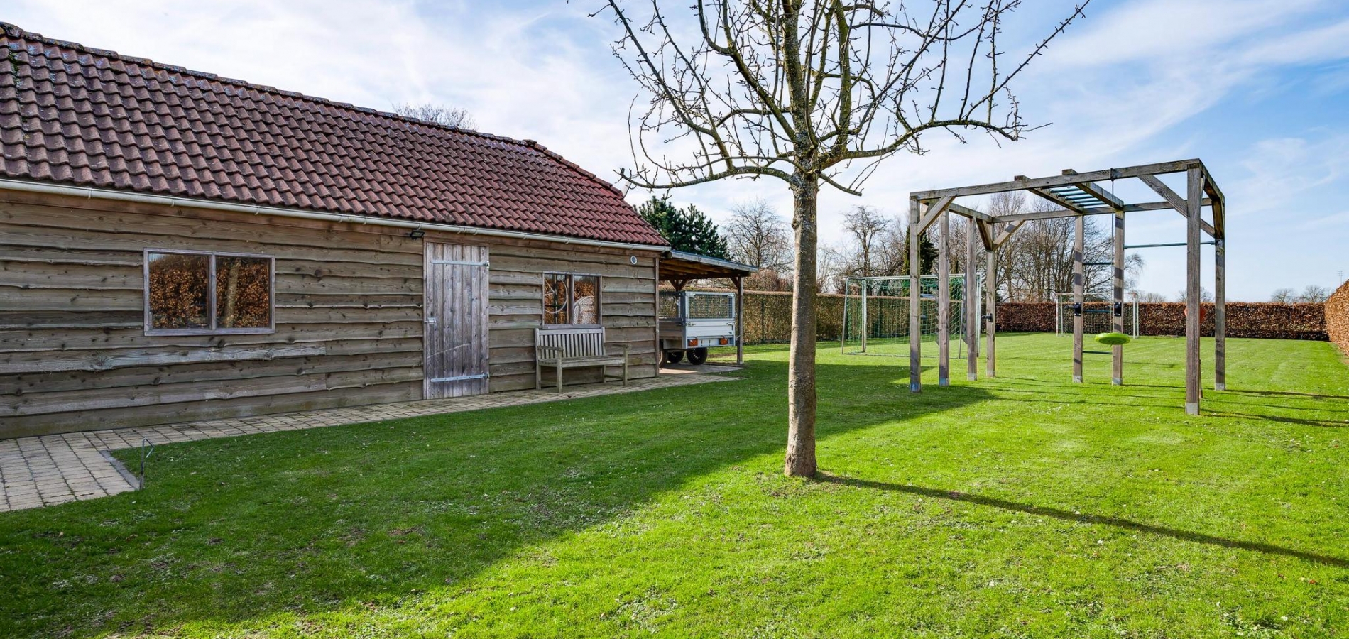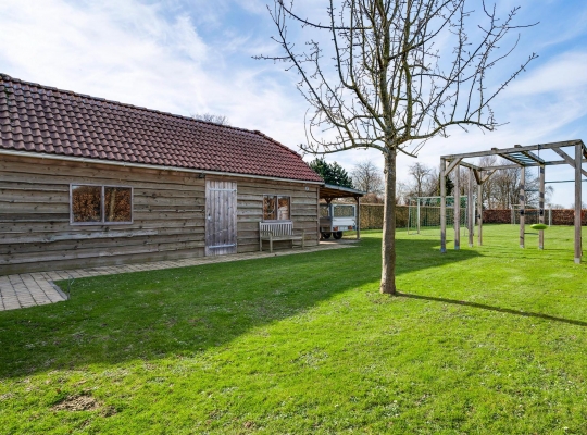 De grote houten schuur(circa 8,74 x 4,74) is perfect voor de hobbyist, ondernemer en de auto-/motorliefhebber. Aan de achterzijde van de schuur is een overkapping gebouwd. Hier ziet u ook het tweede deel van de tuin met een speeltoestel en genoeg plek voor een eigen voetbalveld.