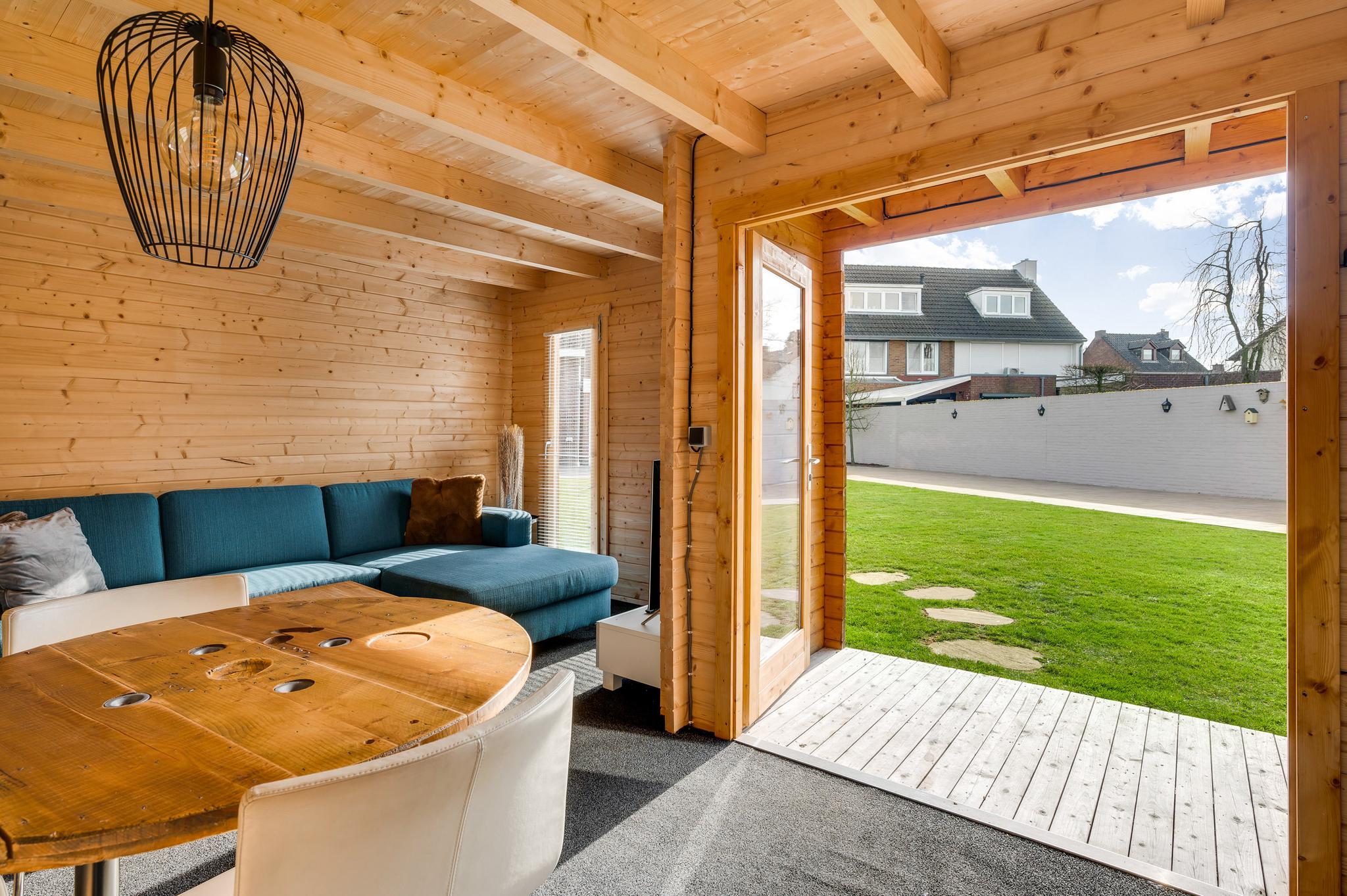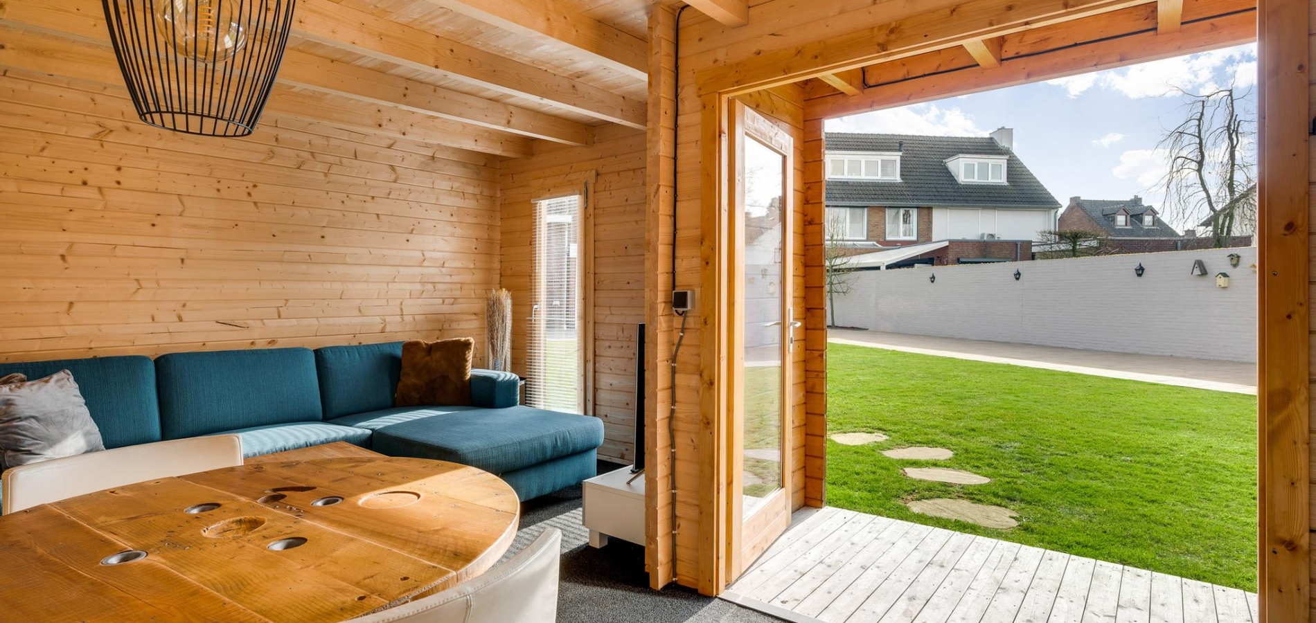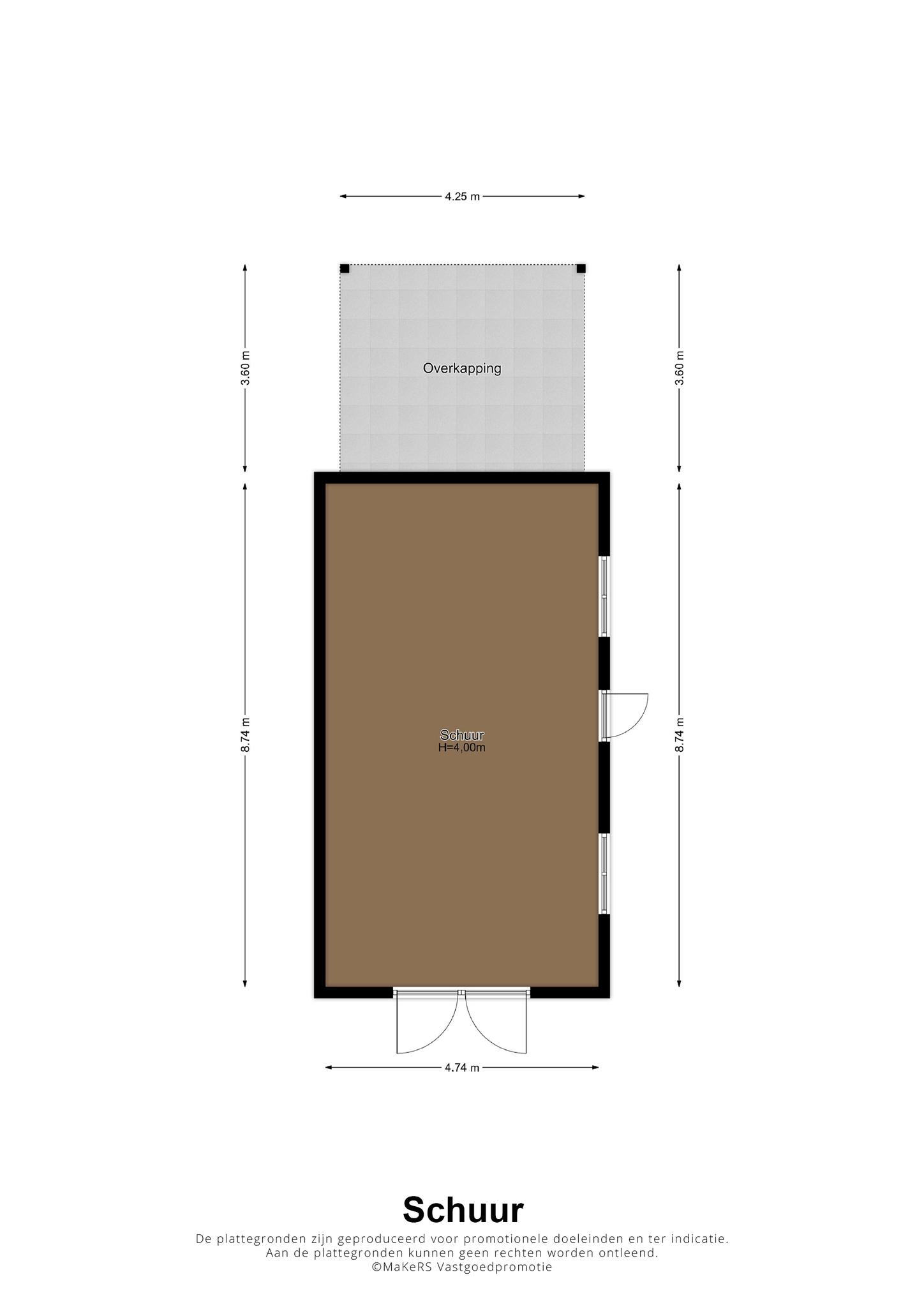 De grote houten schuur(circa 8,74 x 4,74) is perfect voor de hobbyist, ondernemer en de auto-/motorliefhebber. Aan de achterzijde van de schuur is een overkapping gebouwd. Hier ziet u ook het tweede deel van de tuin met een speeltoestel en genoeg plek voor een eigen voetbalveld.