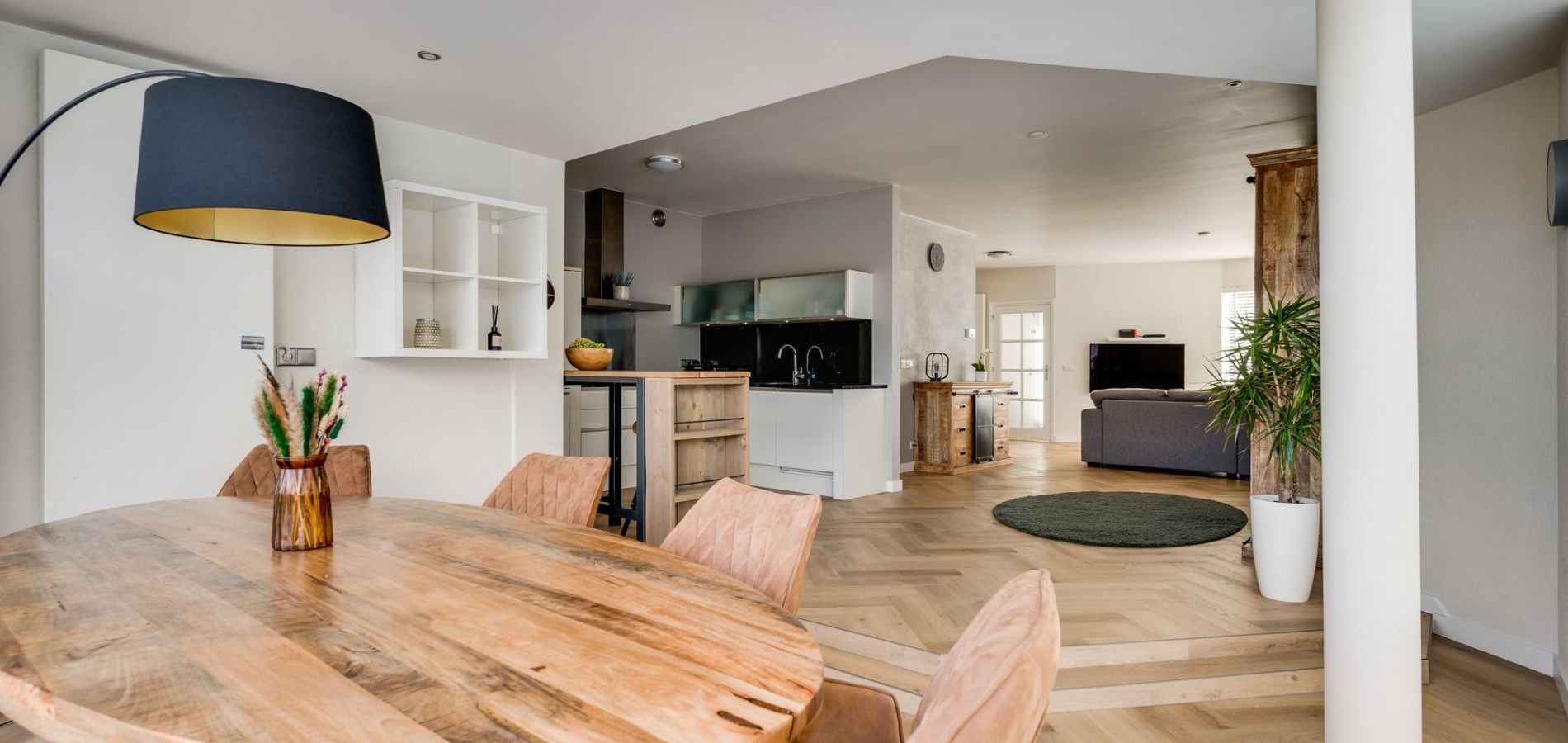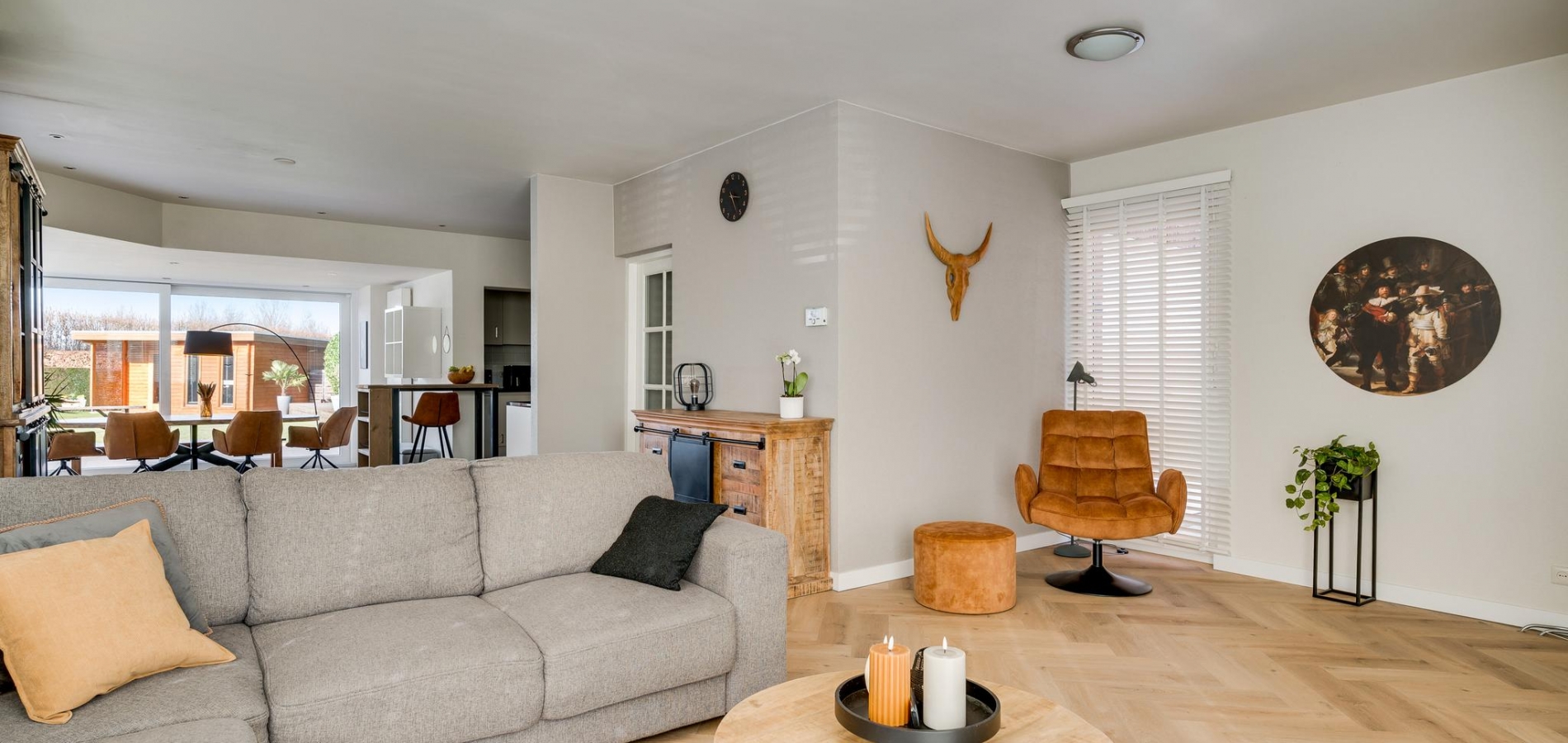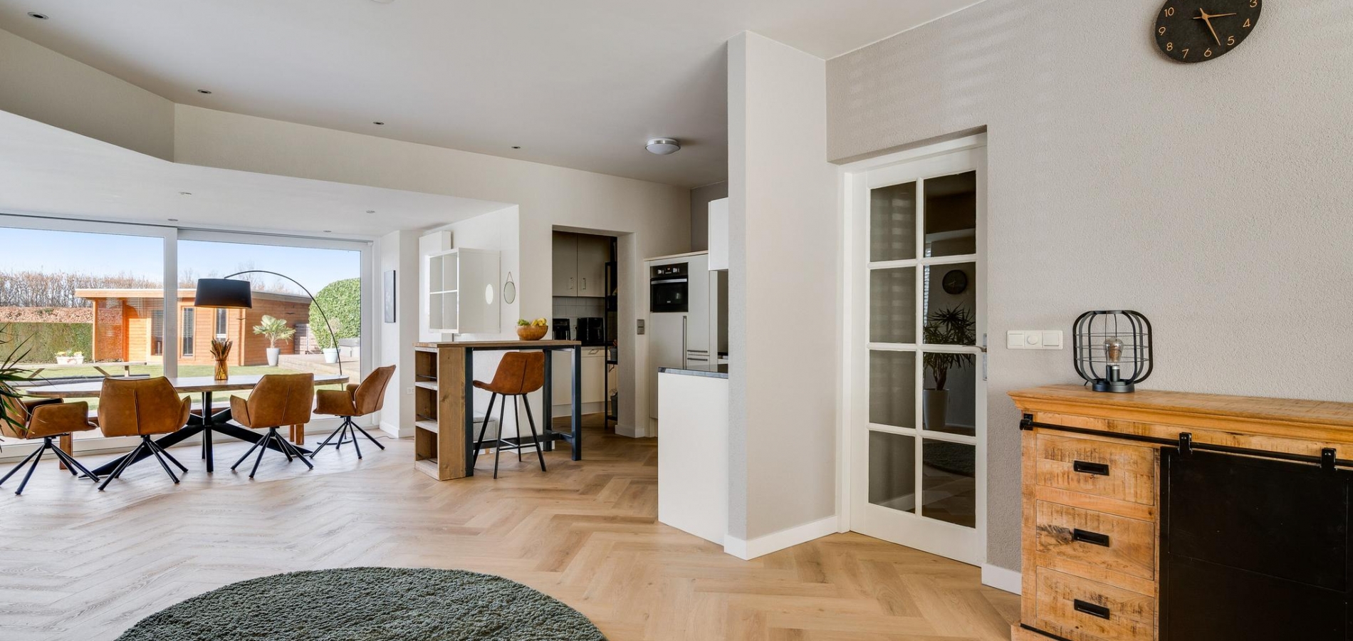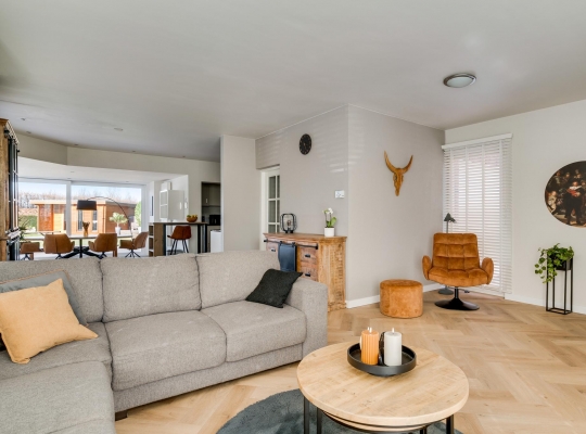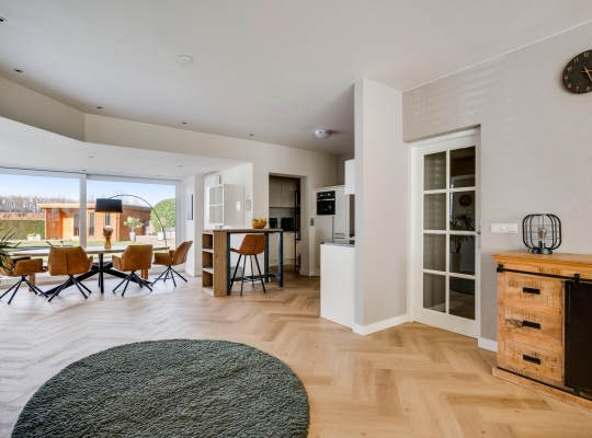 Vanuit de hal is de speels ingedeelde, lichte woon-/eetkamer (circa 60 m2) te bereiken. Het zitgedeelte is aan de voorzijde en aan de tuinzijde, bij de schuifpui, is plek voor een grote eettafel. Fraaie elementen zijn de vloer, het stucwerk, de inbouwverlichting en de gashaard.