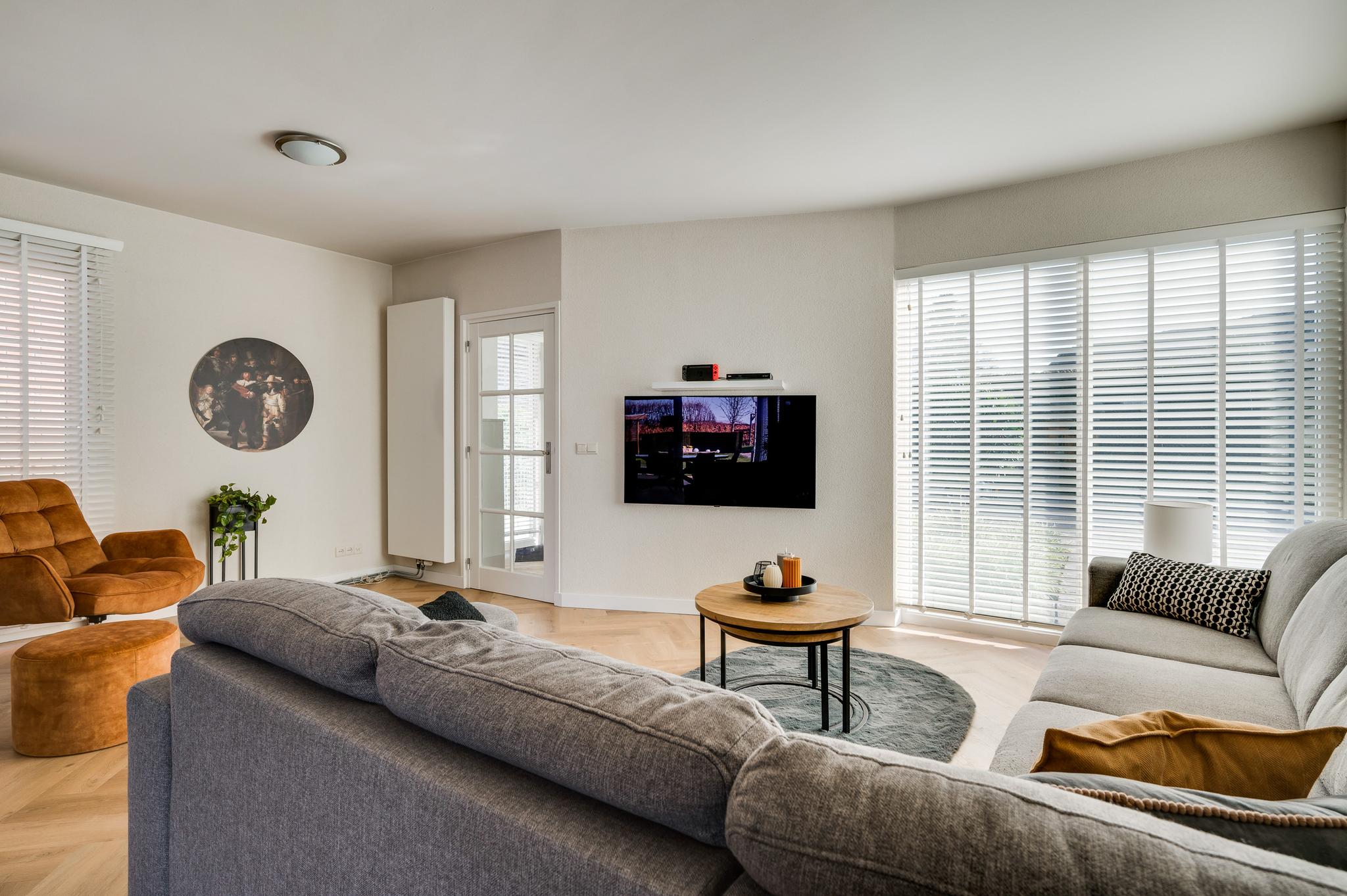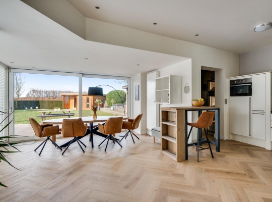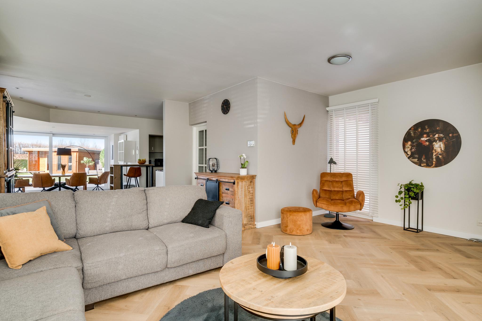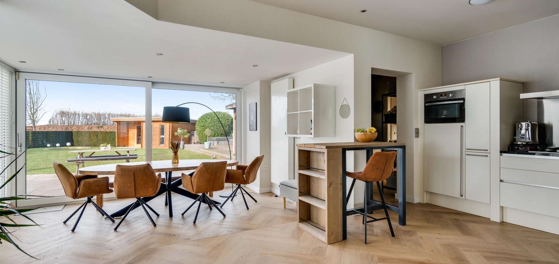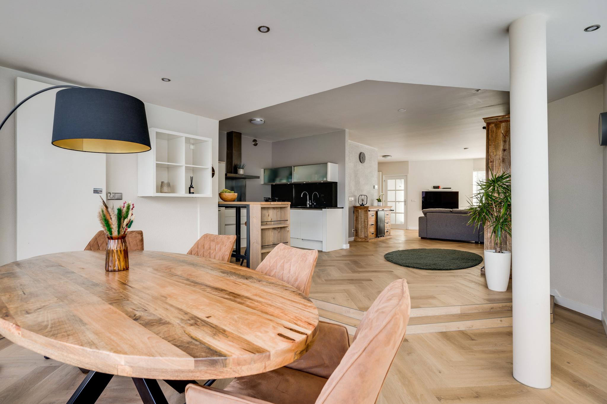 Vanuit de hal is de speels ingedeelde, lichte woon-/eetkamer (circa 60 m2) te bereiken. Het zitgedeelte is aan de voorzijde en aan de tuinzijde, bij de schuifpui, is plek voor een grote eettafel. Fraaie elementen zijn de vloer, het stucwerk, de inbouwverlichting en de gashaard.