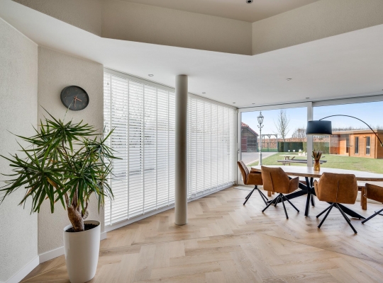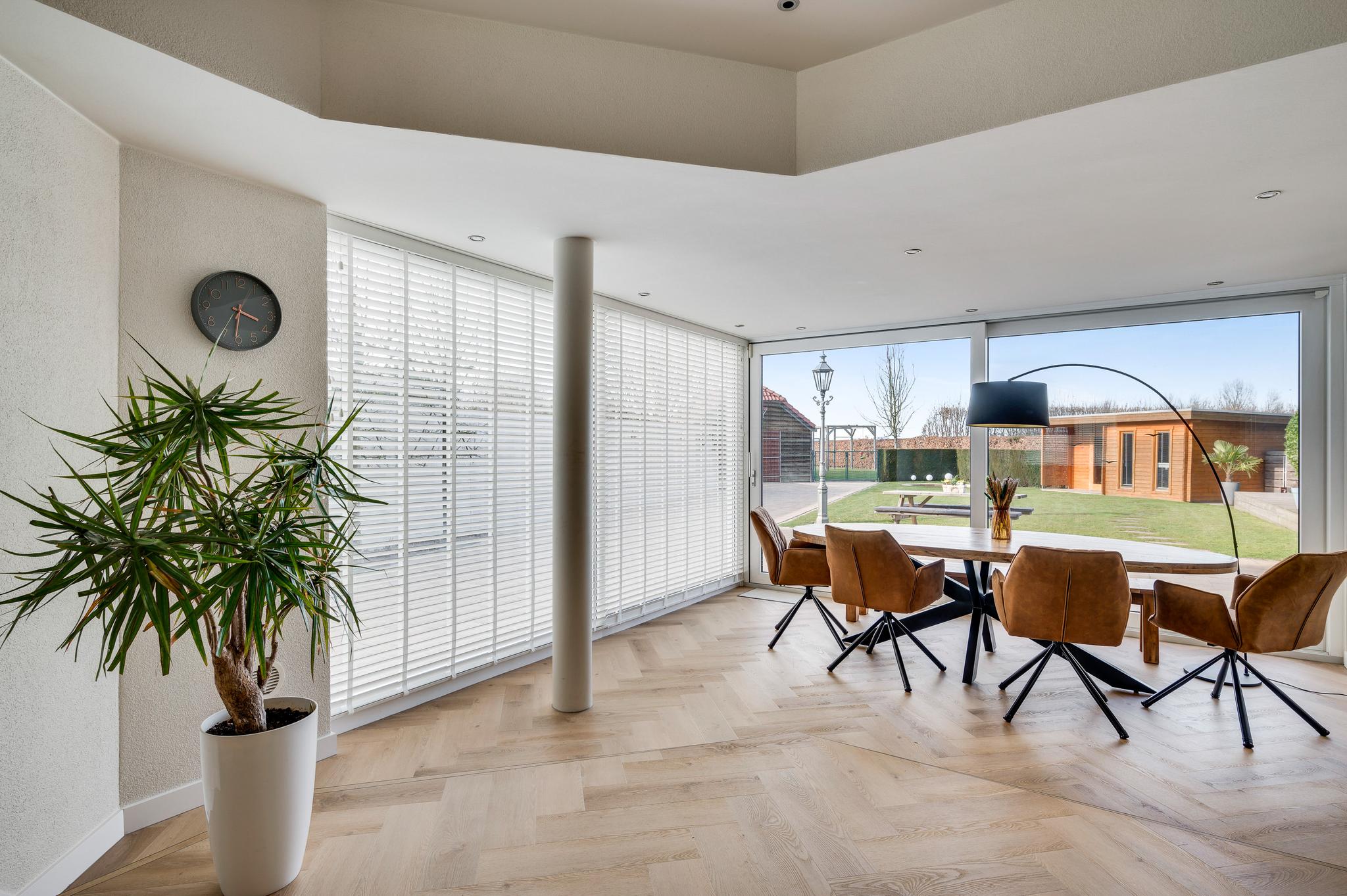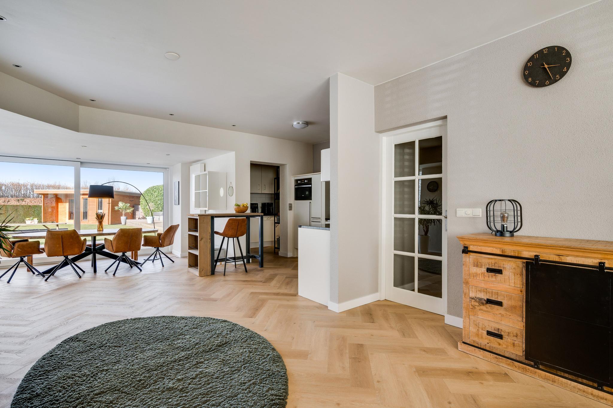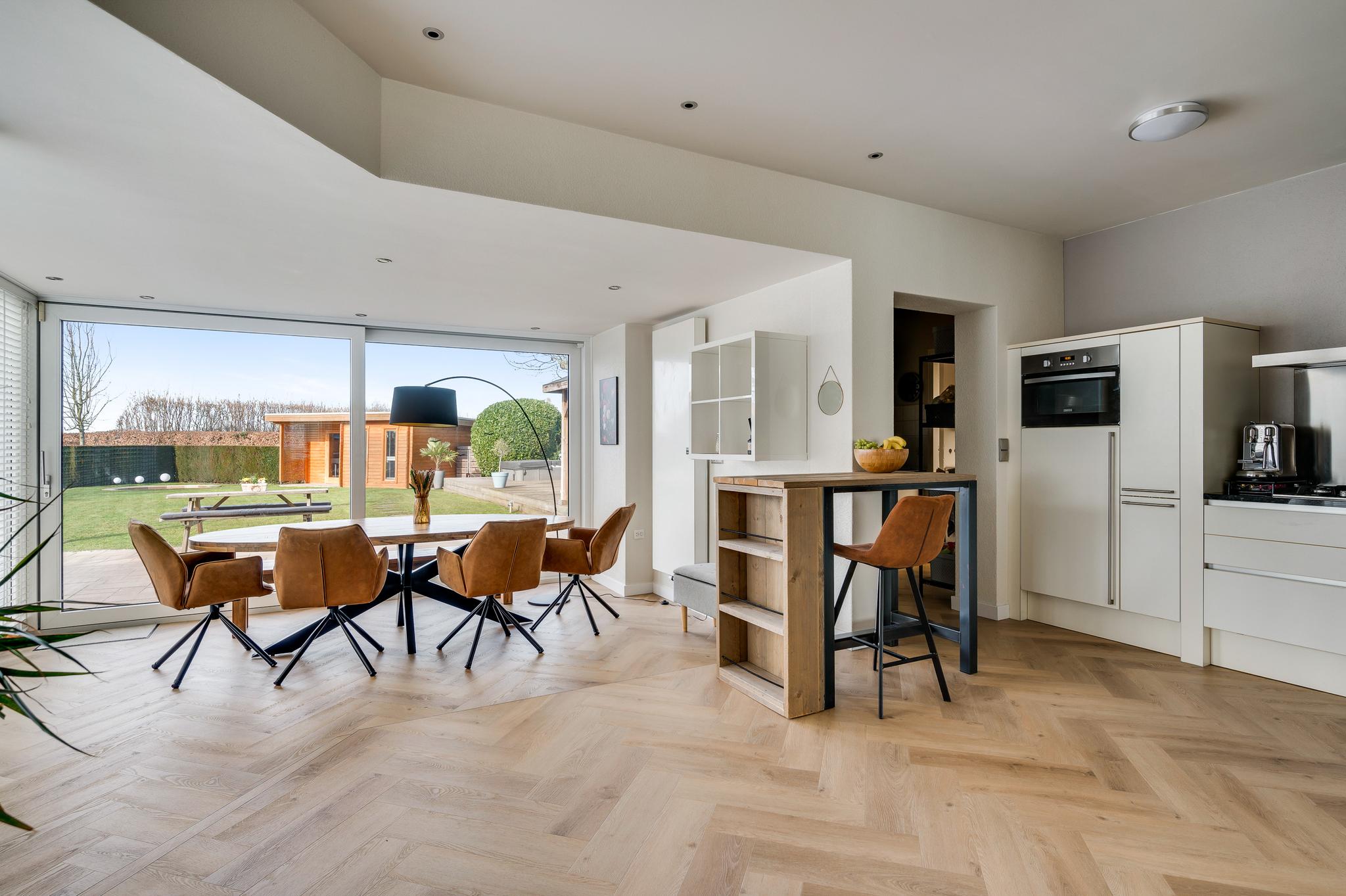 Vanuit de hal is de speels ingedeelde, lichte woon-/eetkamer (circa 60 m2) te bereiken. Het zitgedeelte is aan de voorzijde en aan de tuinzijde, bij de schuifpui, is plek voor een grote eettafel. Fraaie elementen zijn de vloer, het stucwerk, de inbouwverlichting en de gashaard.