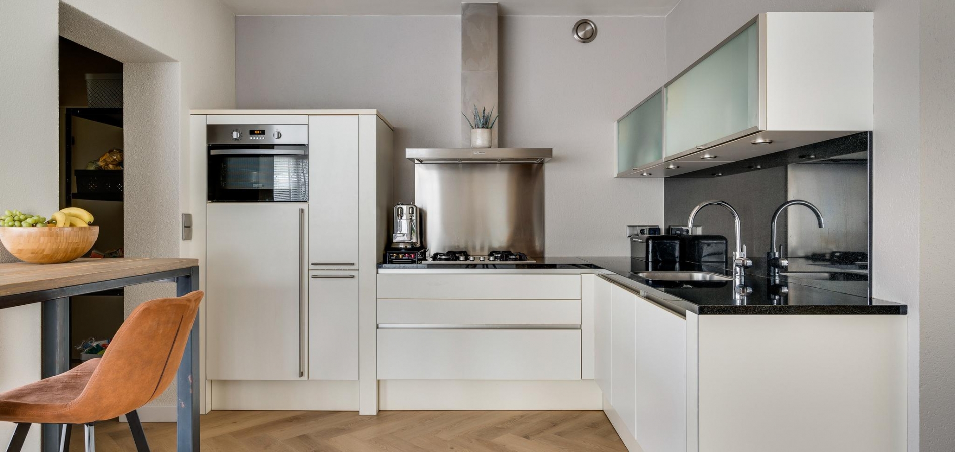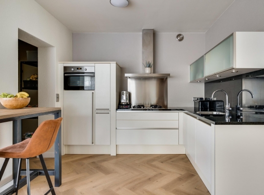 De woonkamer staat in open verbinding met de keuken (circa 3,00 x 2,60). Hier staat een moderne, lichte hoekopstelling met een aanrechtblad en achterwand van zwart graniet. De gaskookplaat, afzuigkap, oven, vaatwasser en koelkast zijn ingebouwd. In het verlengde van de keuken is de bijkeuken (circa 2,27 x 2,07), met een deur naar de garage (circa 7,80 x 2,71). Deze ruimte heeft, net als het woonhuis, een uitstekende afwerking. Onder het werkblad met spoelbak is ruimte voor de wasapparatuur en de kasten bieden, net als de planken, veel bergruimte.