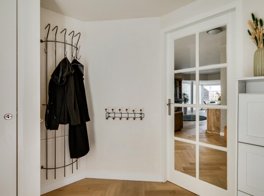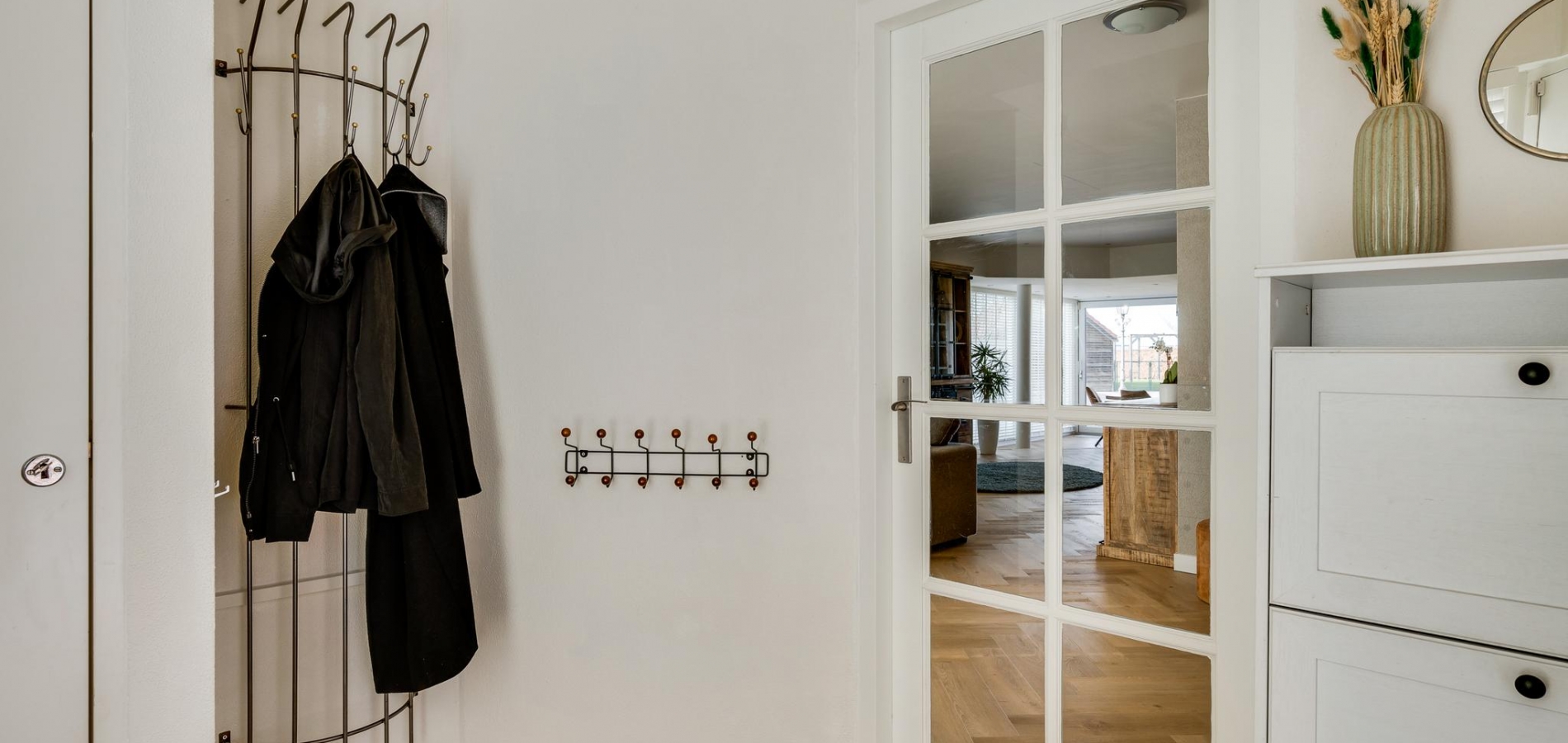 Aan de voorzijde, in de aanbouw, is de entree van deze uitstekend onderhouden woning. Links in de hal (circa 2,60 x 2,27) is de meterkast en op de vloer ligt, net als op een groot deel van de begane grond, een fraaie pvc visgraatvloer (2024).