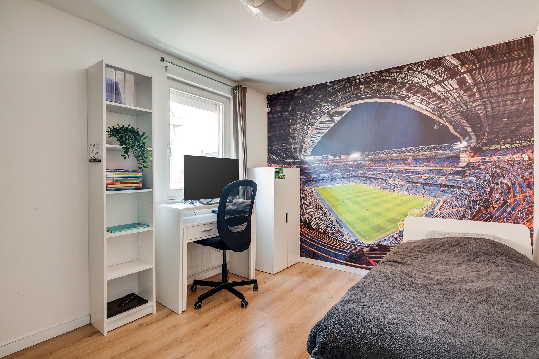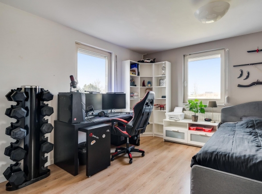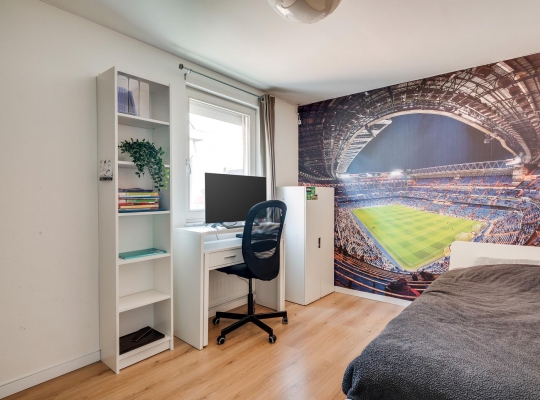 Volg de fraaie trap naar de eerste verdieping, waar maar liefst vier slaapkamers en de badkamer zijn. Aan de voorzijde zijn slaapkamer I (circa 4,89 x 2,90) en slaapkamer II (circa 3,77 x 2,88) die, net als slaapkamer III (circa 4,50 x 3,70/2,90) aan de achterzijde, als kinderkamer in gebruik is. Boven de garage is slaapkamer IV (circa 6,70 x 2,68) met een dakkapel en een berging met schuifdeuren.