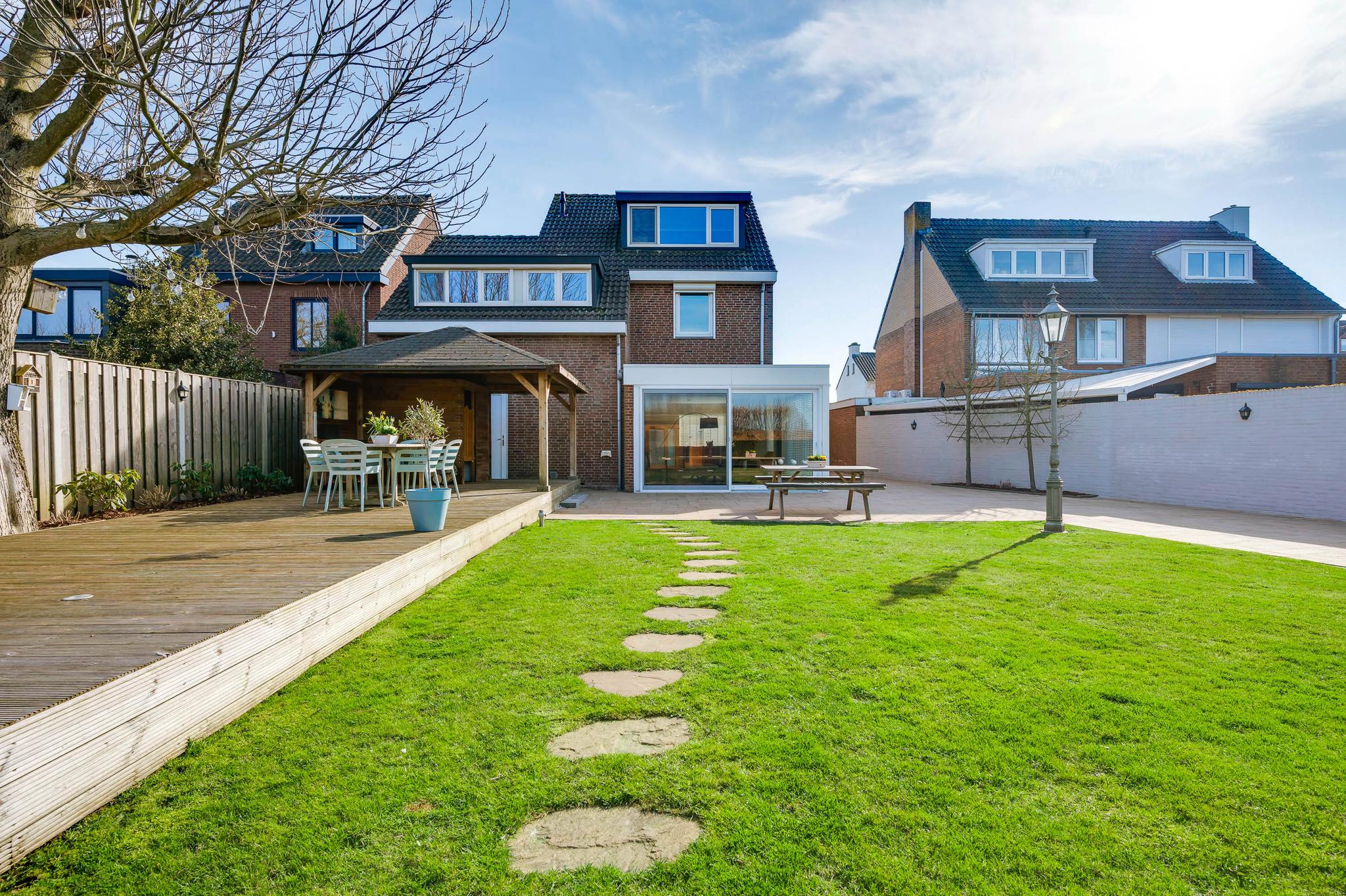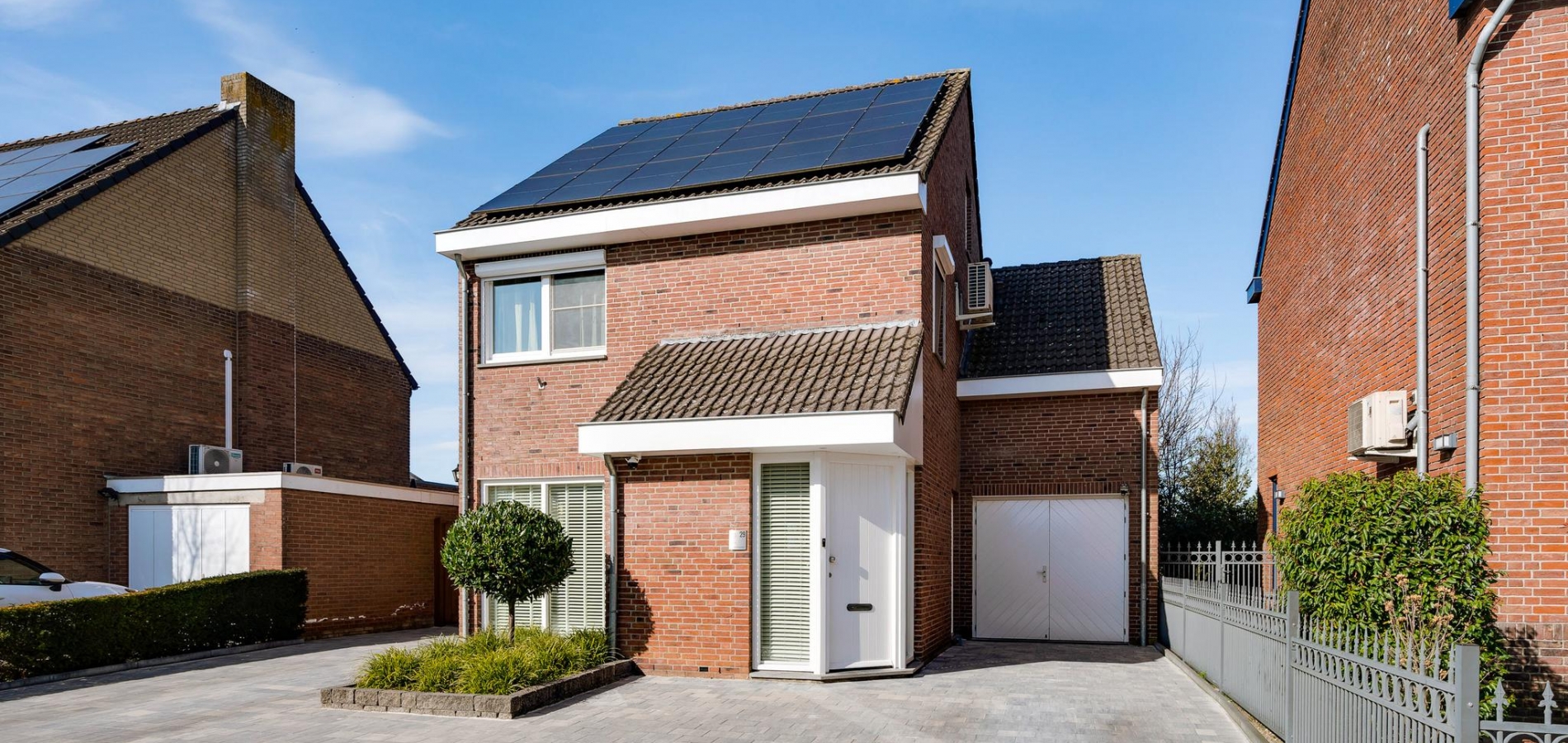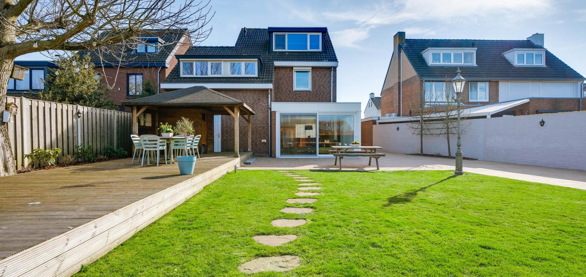 De brede voortuin is voor een groot deel bestraat, waardoor er ruime parkeergelegenheid op eigen terrein is. Niet alleen voor de auto, maar ook voor een grote bedrijfsbus, caravan, camper of een aanhanger.