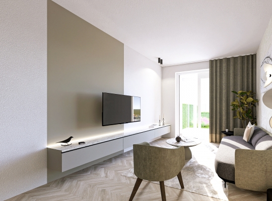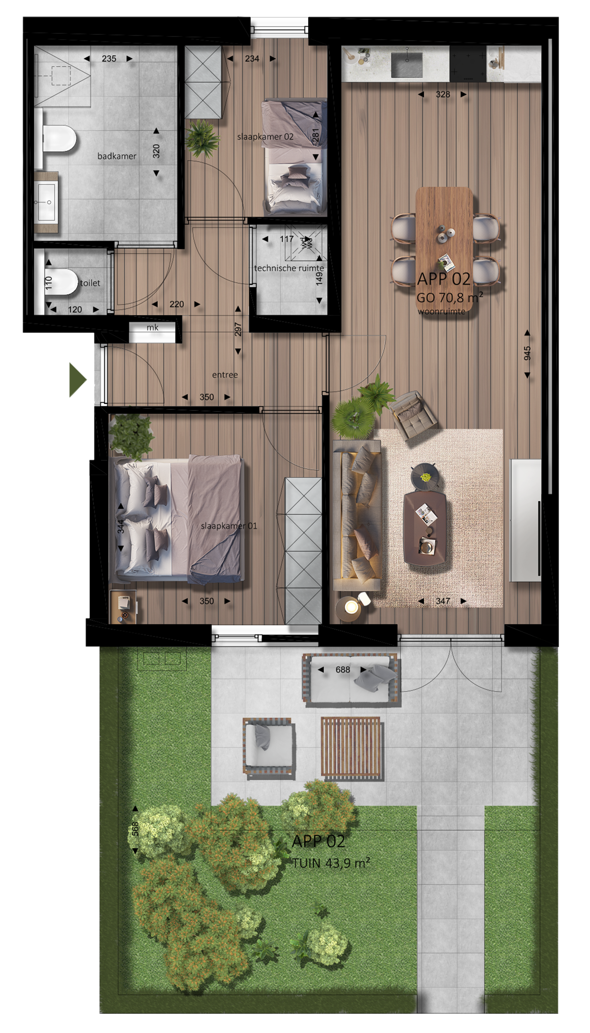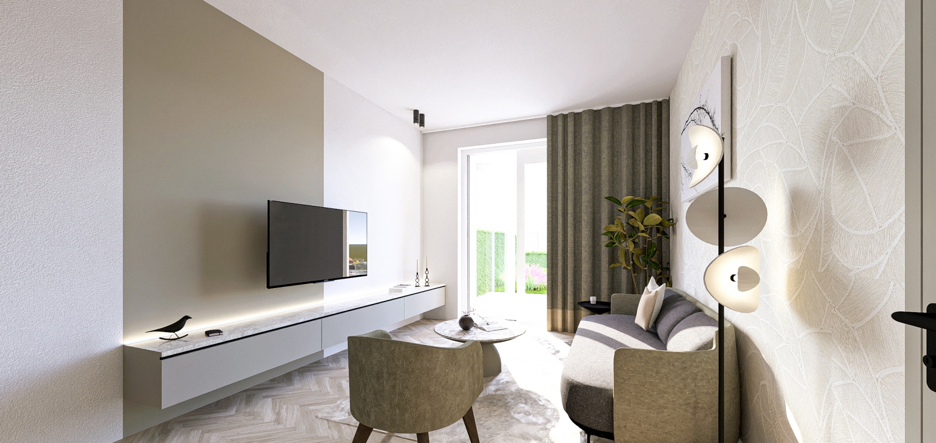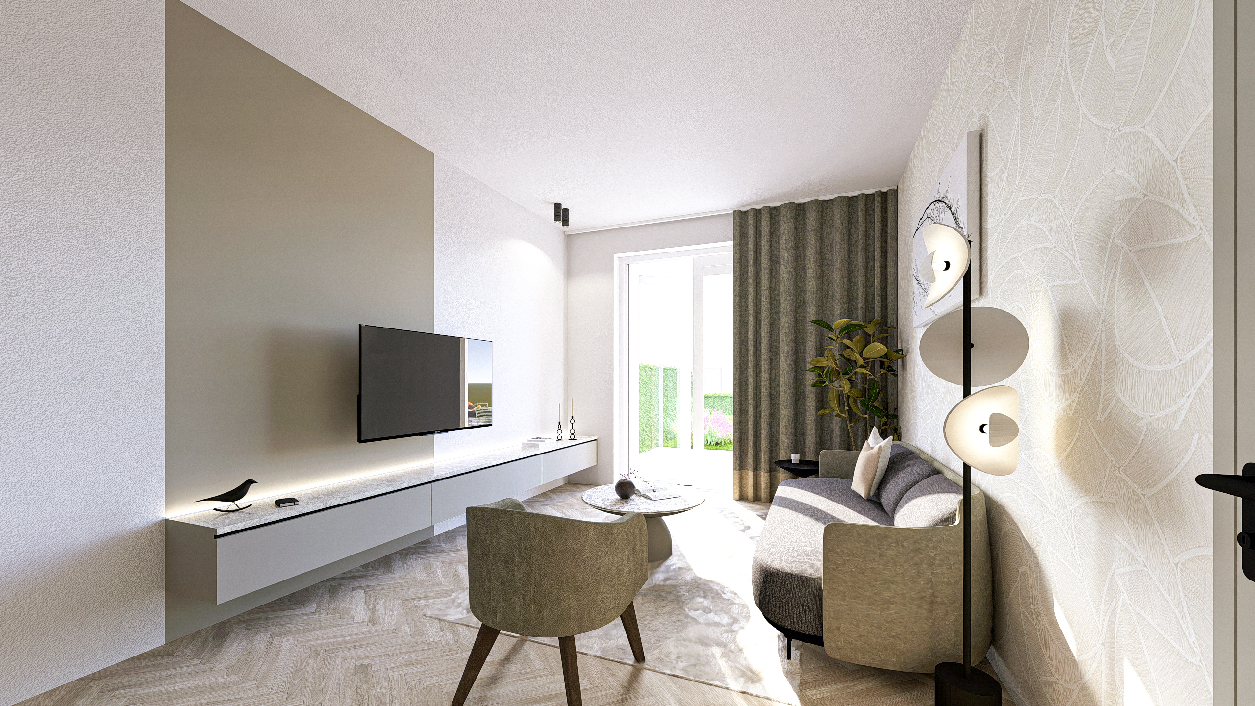 Met twee comfortabele slaapkamers is appartement 02 perfect voor stellen die graag een logé ontvangen, een thuiskantoor willen inrichten of gewoon wat extra flexibiliteit wensen. Gelegen op de begane grond en voorzien van een royale tuin van 44 m² biedt dit appartement volop wooncomfort. De ruime woonkamer met open keuken is licht en uitnodigend, met openslaande deuren naar buiten voor een prettige binnen-buitenverbinding. Verder beschikt de woning over een luxe badkamer met inloopdouche, een separaat tweede toilet en een praktische bijkeuken met aansluitingen voor wasmachine en droger.