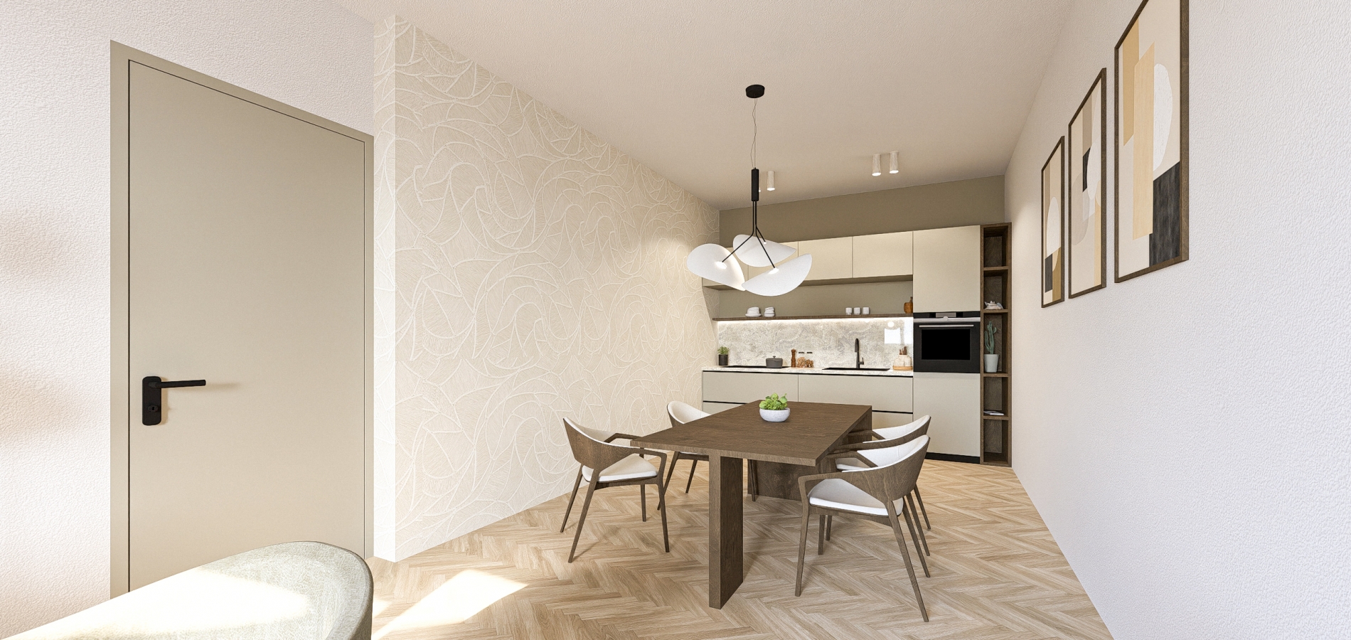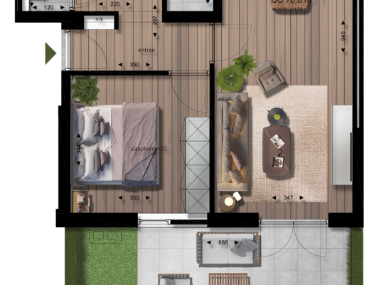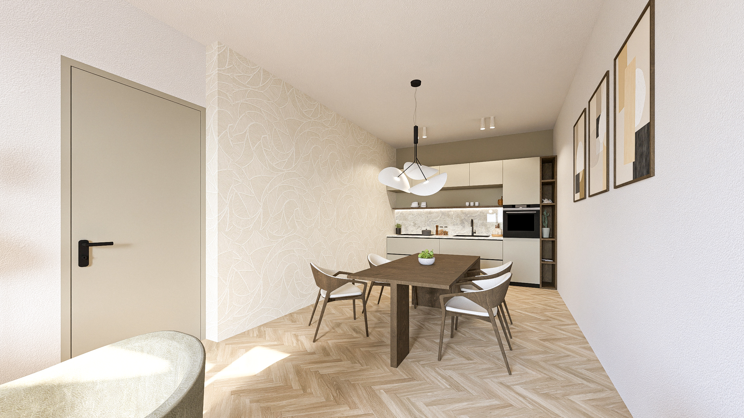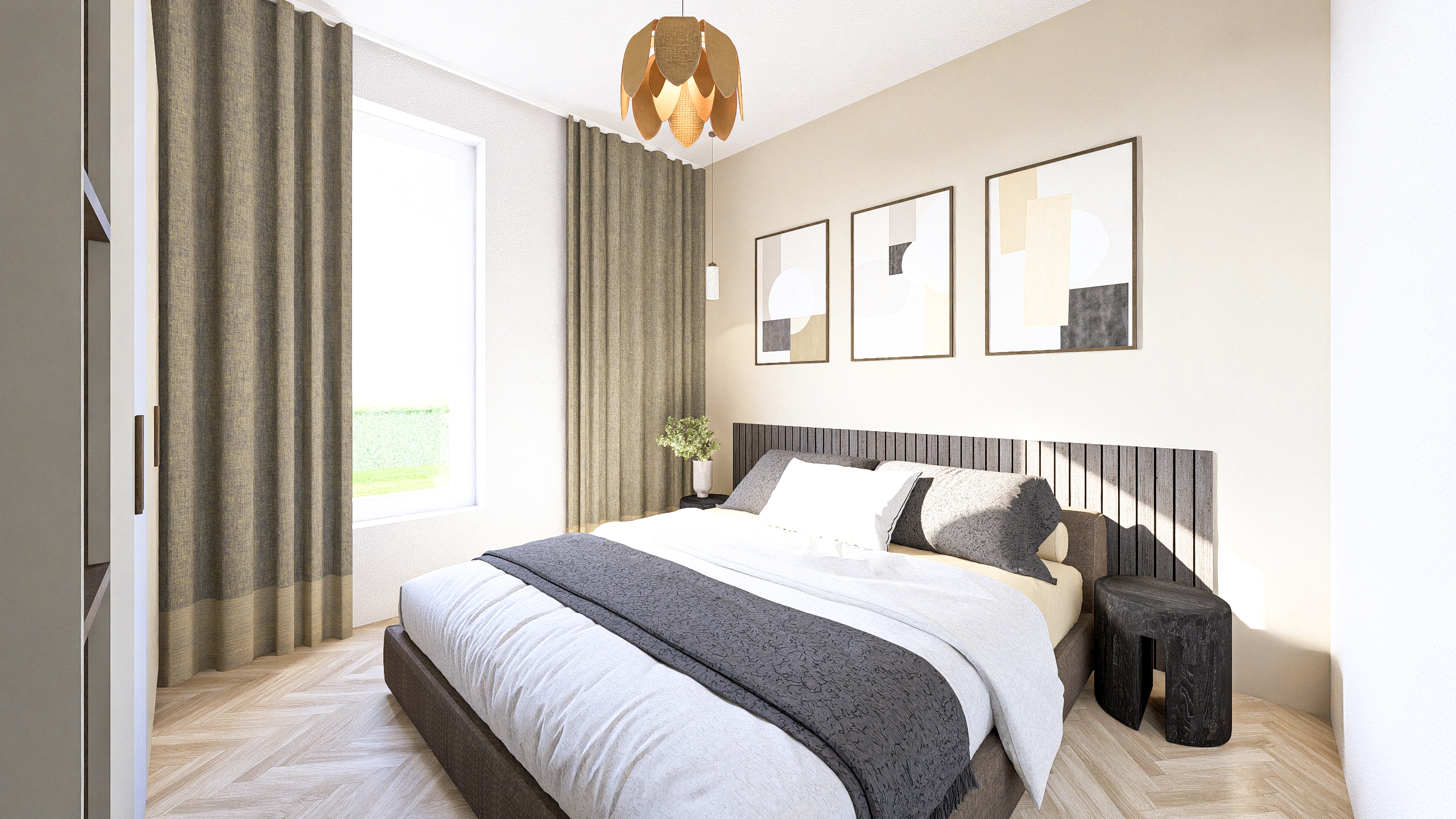 Met twee comfortabele slaapkamers is appartement 02 perfect voor stellen die graag een logé ontvangen, een thuiskantoor willen inrichten of gewoon wat extra flexibiliteit wensen. Gelegen op de begane grond en voorzien van een royale tuin van 44 m² biedt dit appartement volop wooncomfort. De ruime woonkamer met open keuken is licht en uitnodigend, met openslaande deuren naar buiten voor een prettige binnen-buitenverbinding. Verder beschikt de woning over een luxe badkamer met inloopdouche, een separaat tweede toilet en een praktische bijkeuken met aansluitingen voor wasmachine en droger.
