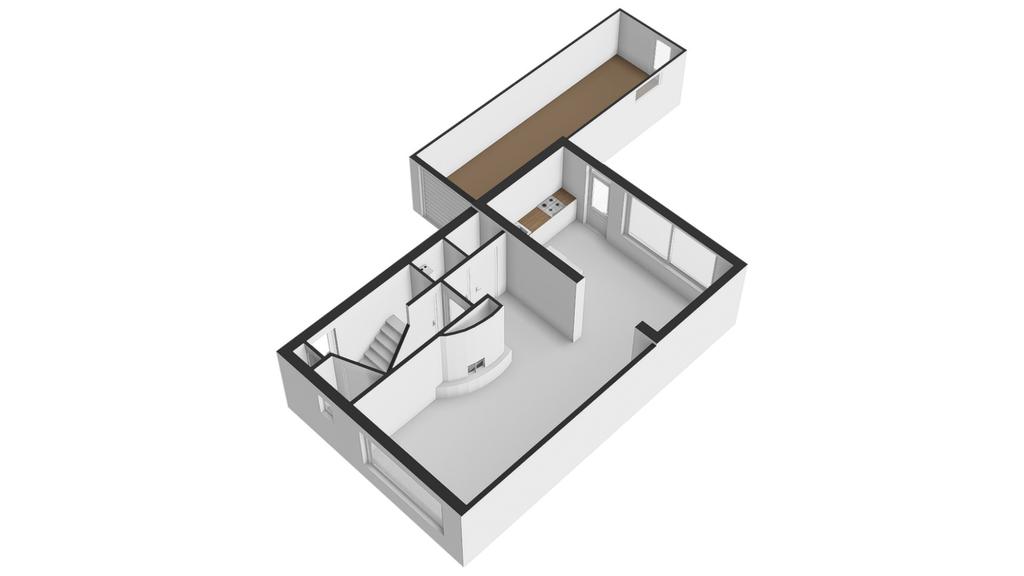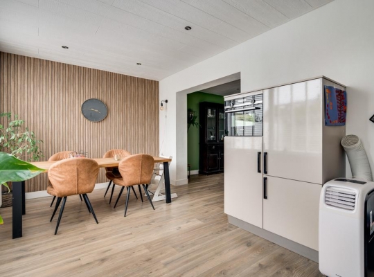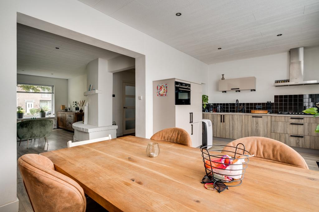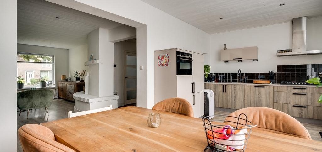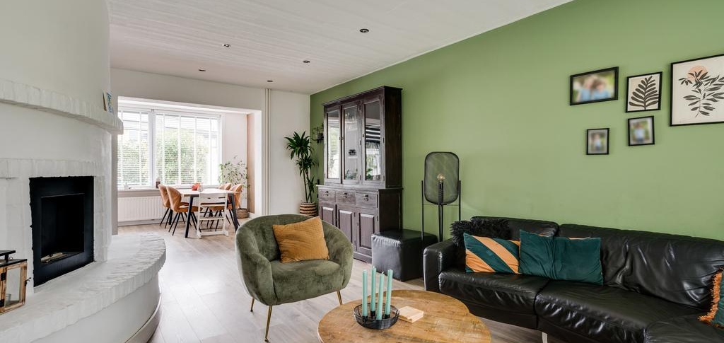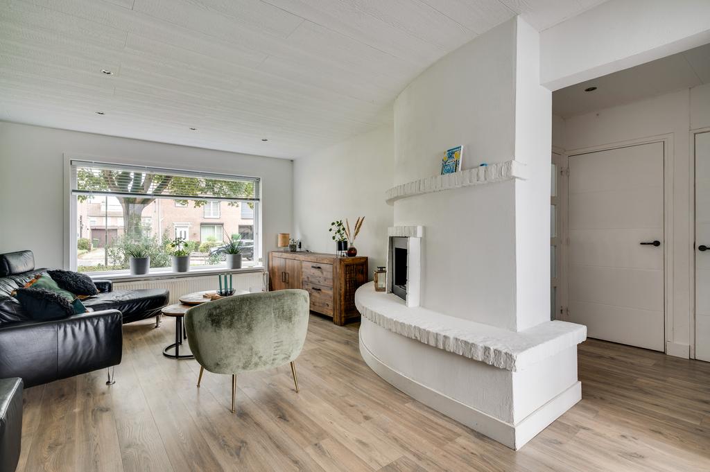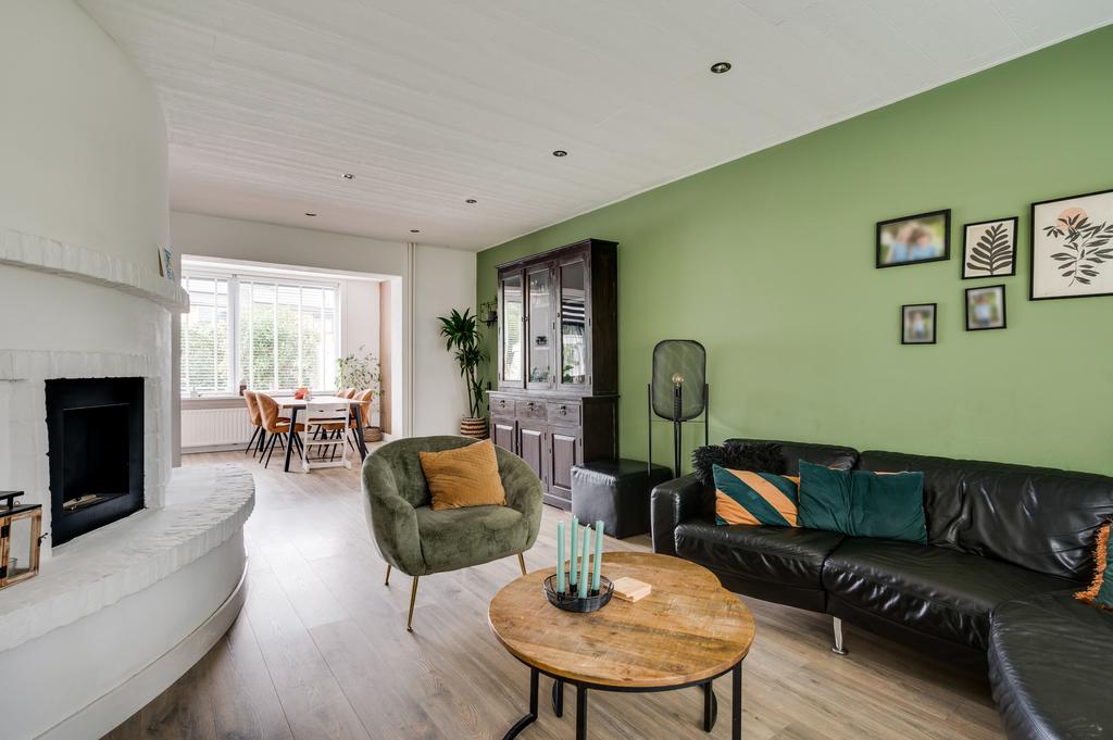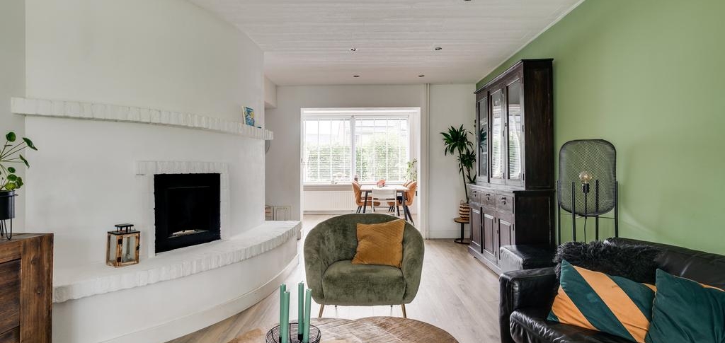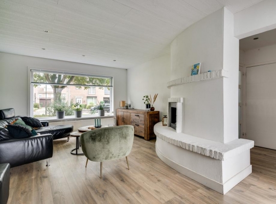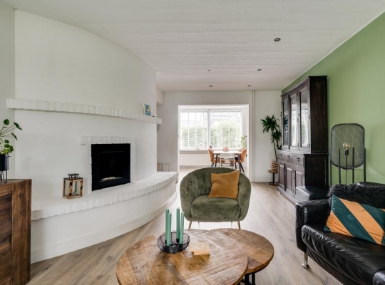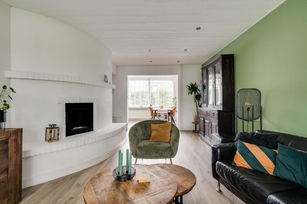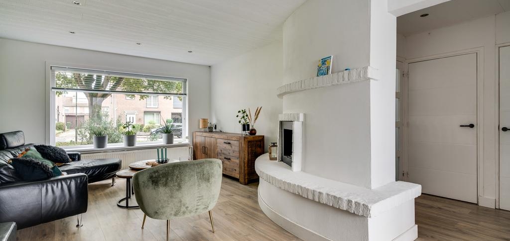 Blikvanger in de woonkamer (circa 6,49 x 3,91) is de kwartronde schouw, waar nu een gelhaard is geplaatst. Omdat de eettafel in de aanbouw staat, kan de woonkamer geheel als zitkamer worden ingericht.