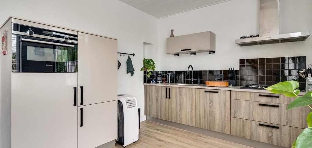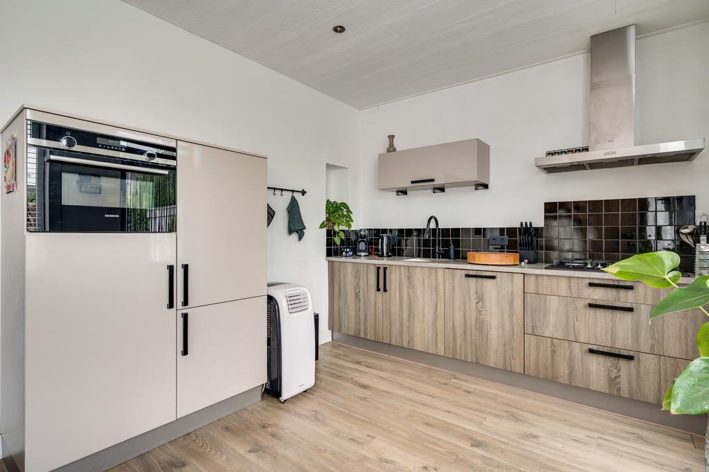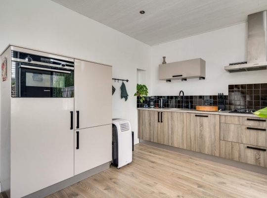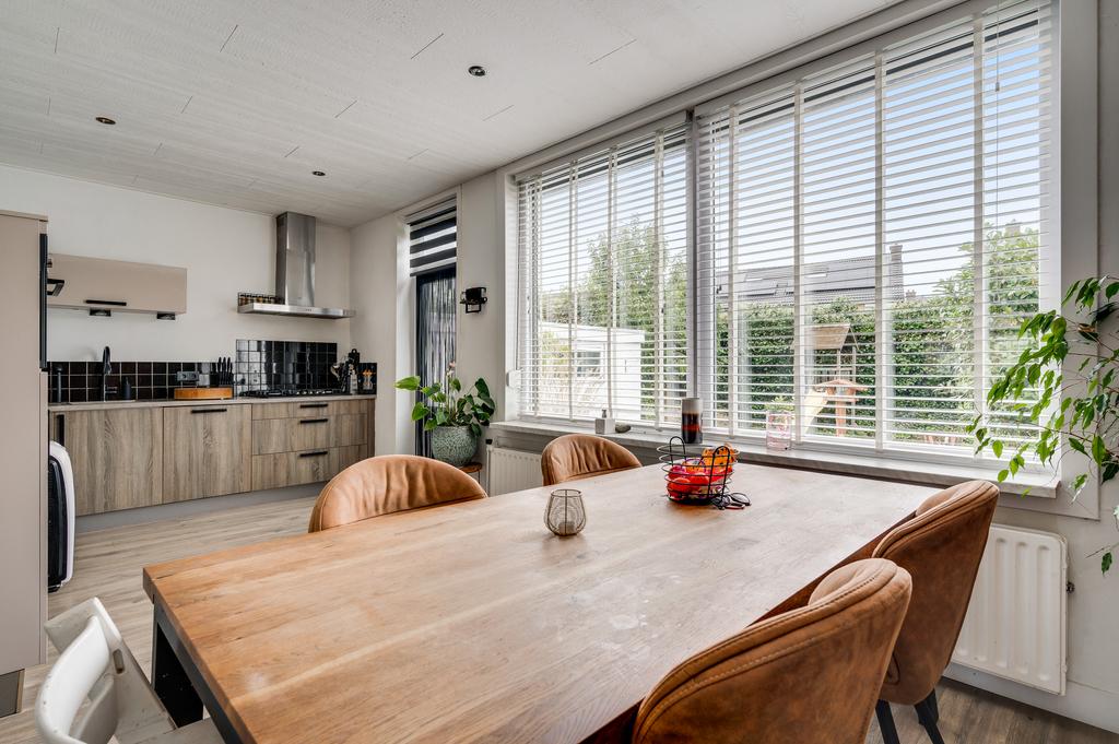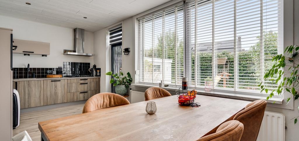 Een brede doorgang verbindt de woonkamer met de eetkeuken (circa 6,07 x 3,00), met mooi uitzicht naar de tuin. In de keuken kan een grote eettafel staat en de moderne keukenopstelling is in 2012 geplaatst. Aan bergruimte is geen gebrek en de keuken is ingedeeld met een 5-pits gaskookplaat, afzuigkap, vaatwasser, combi-oven en een koelkast.