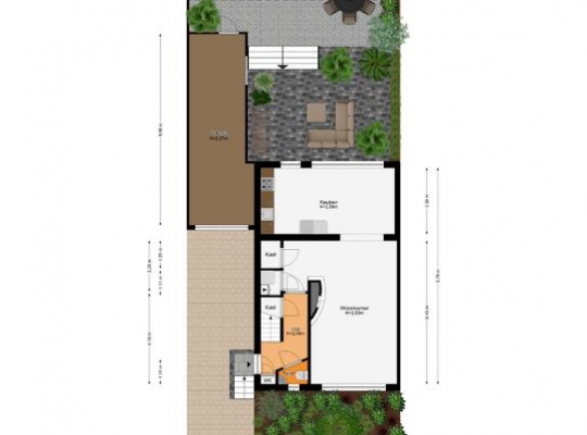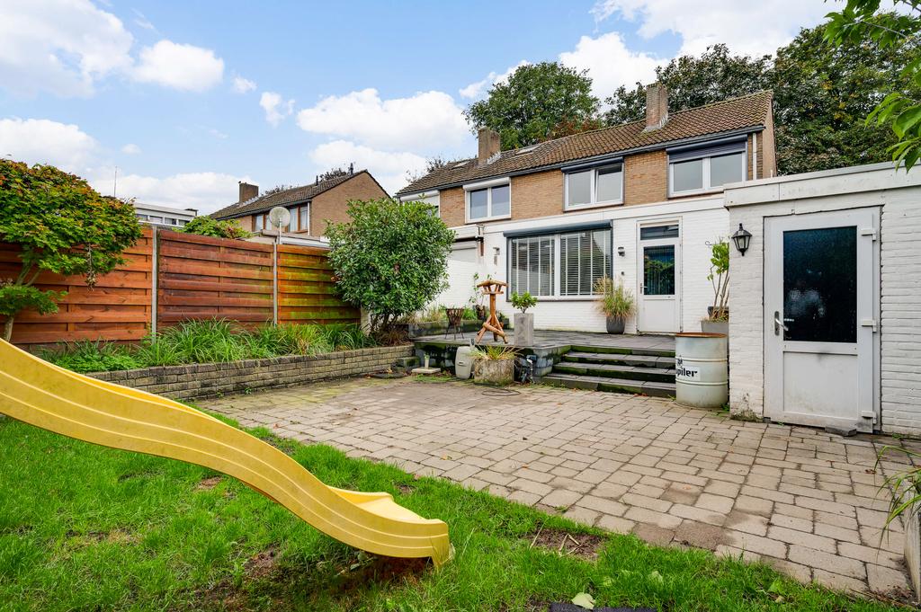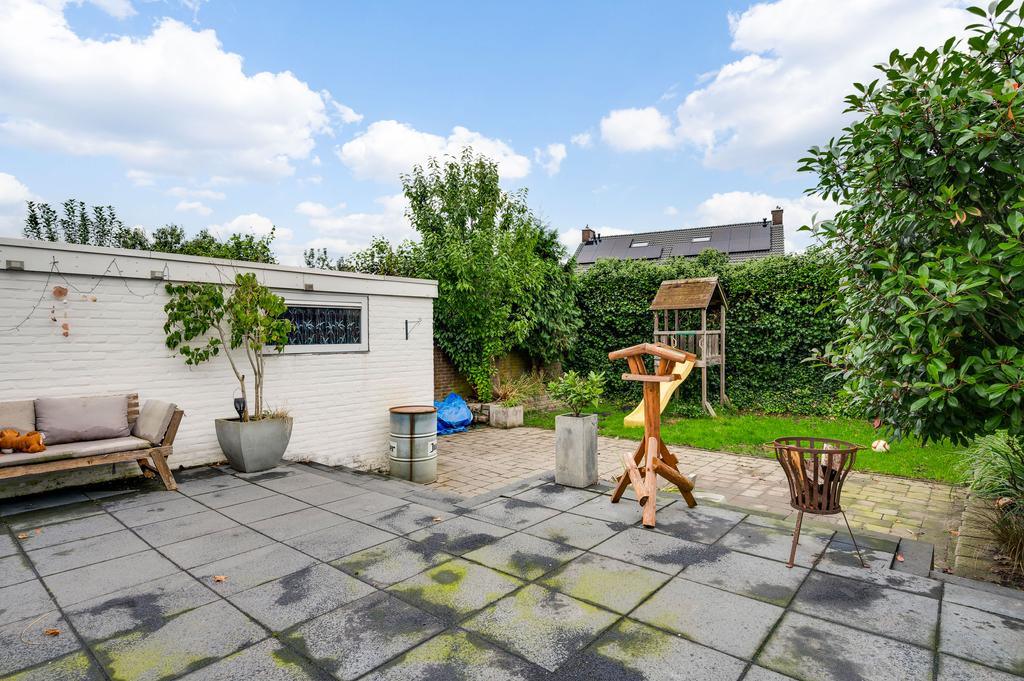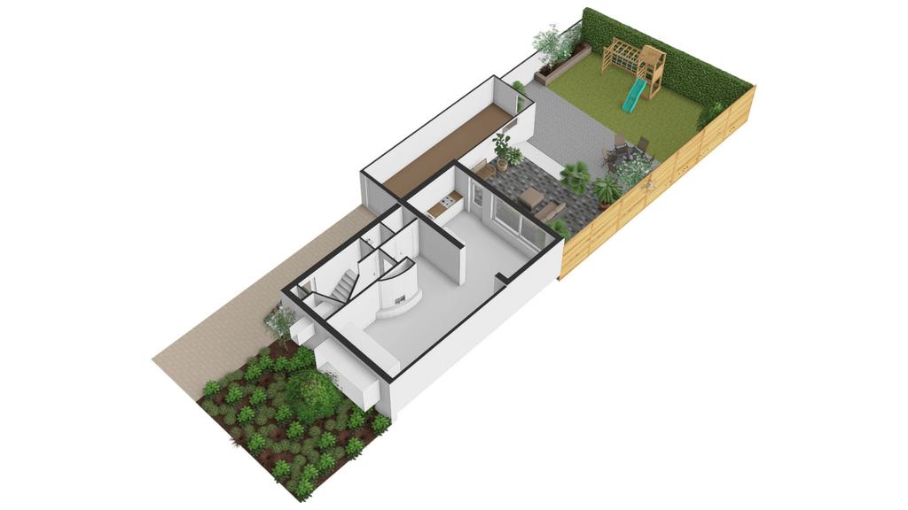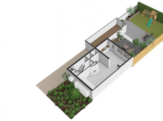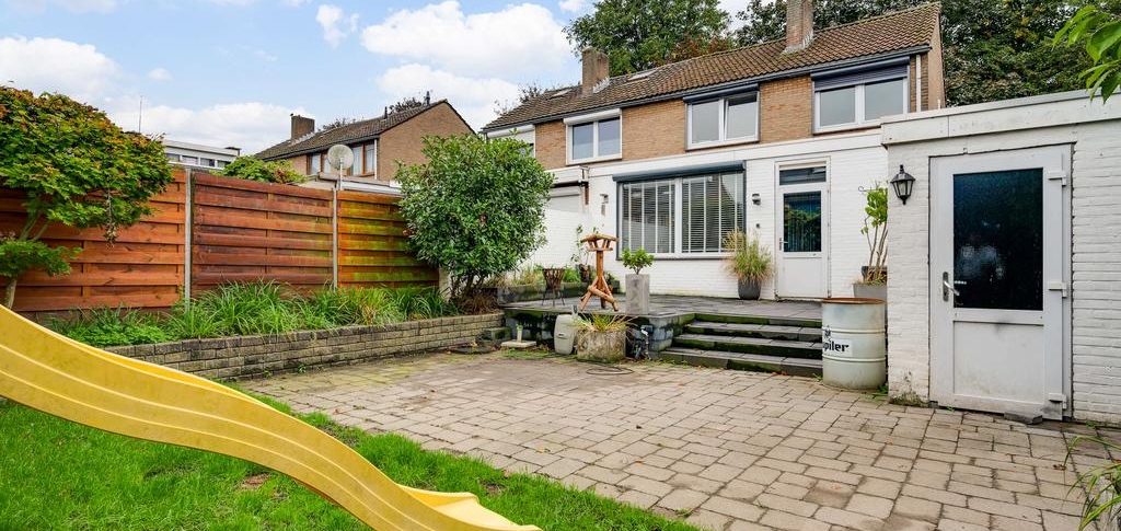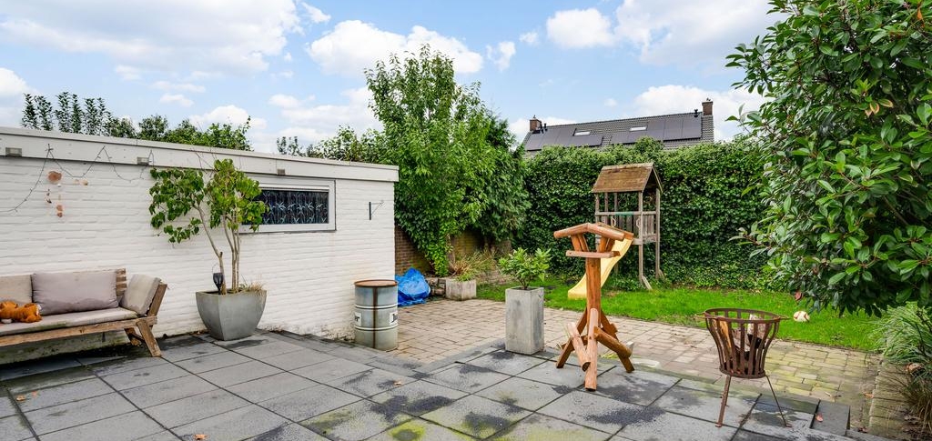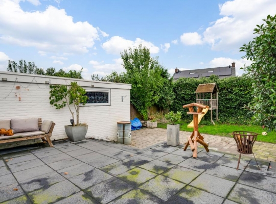 Vanuit de eetkeuken heeft u toegang tot de diepe achtertuin op het noordoosten. Op het niveau van de keuken is een groot terras gemaakt, die via een brede trap in verbinding met het tweede deel van de tuin staat. Zo is er gedurende een groot deel van de dag een plekje in de zon en kunnen kinderen in eigen tuin spelen.