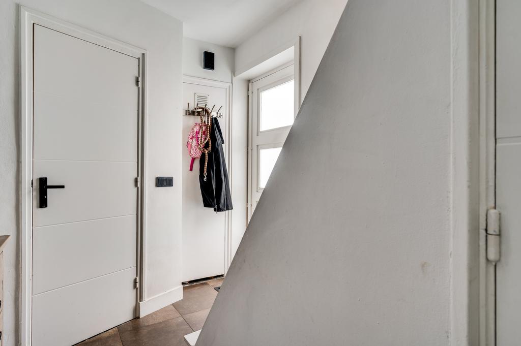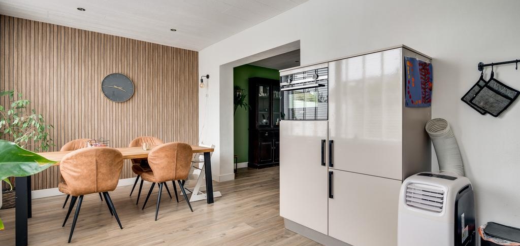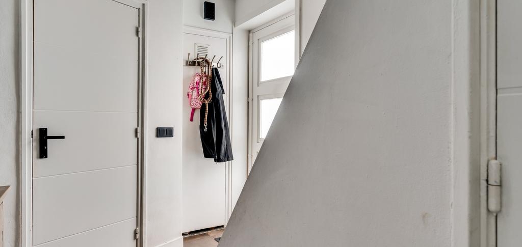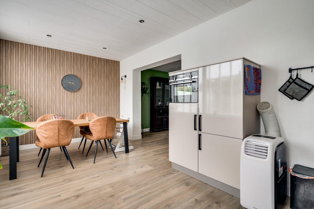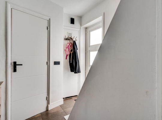 De hal staat in verbinding met een portaal, met de woonkamer een de rechterzijde. Aan de linkerzijde zijn een bergkast en een berging/wasruimte, waar ook de HR-ketel (Intergas, 2020, eigendom) hangt. De laminaatvloer in een mooie houtvloer ligt ook in de woonkamer en eetkeuken.
